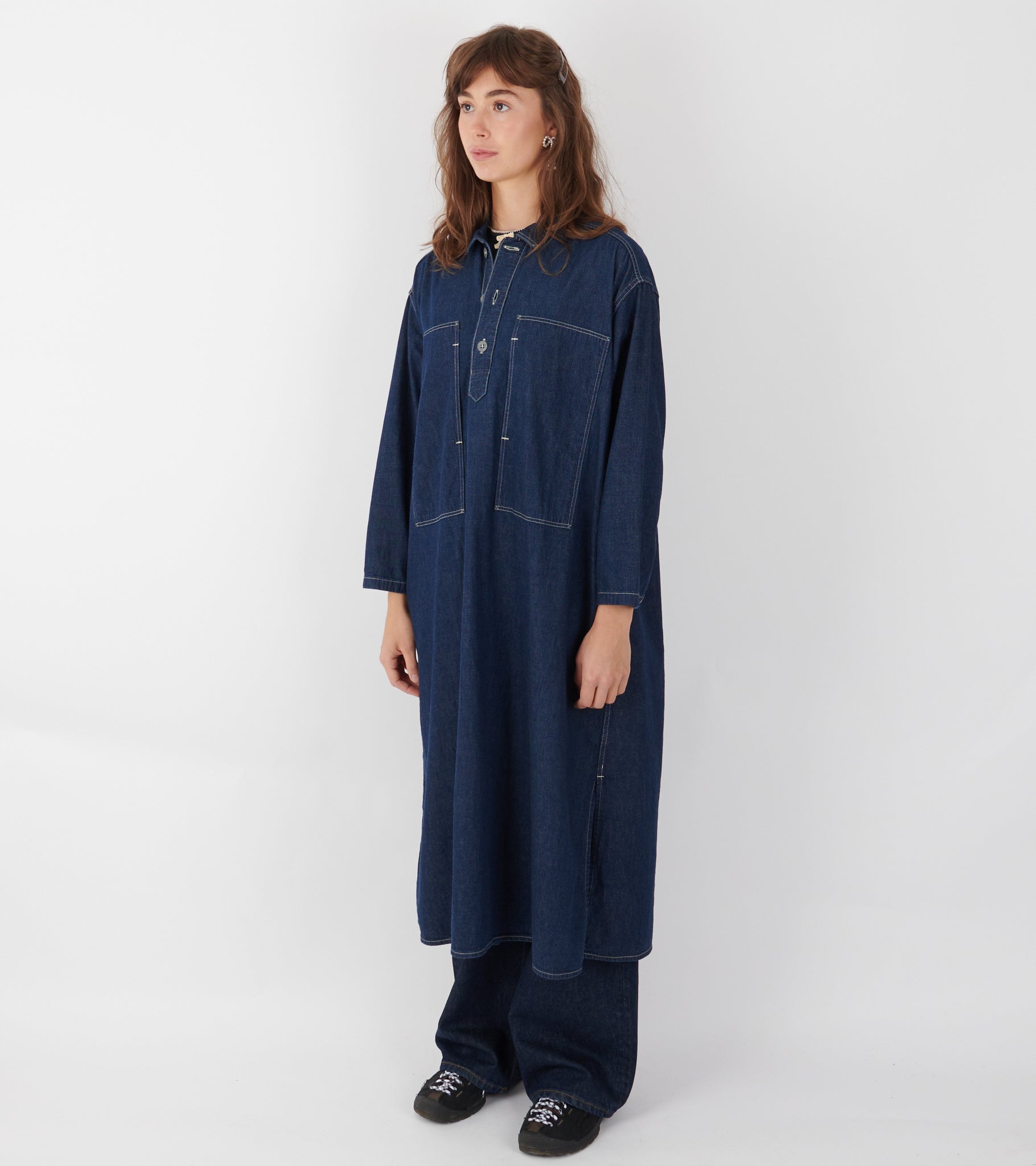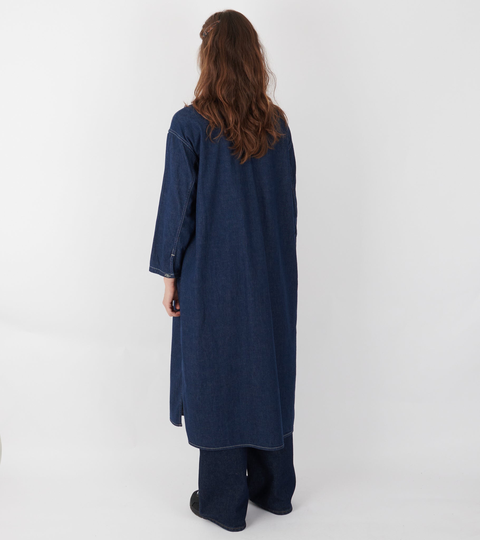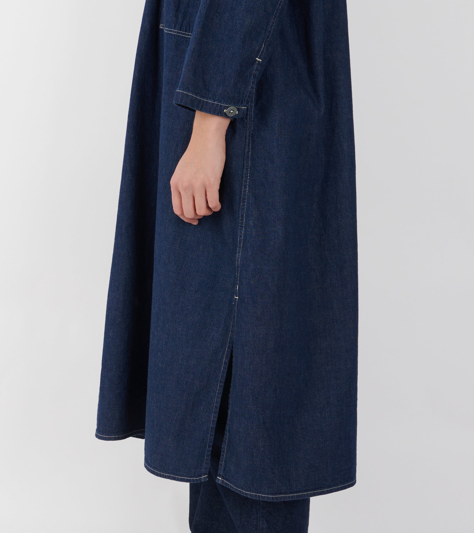 Mørkeblå denimkjole i bomuld. Kjolen har slidser i begge side, kontrast farvet syninger og kan åbnes ved håndled. Den har stolpelukning, en lomme på hver bryst samt sidelommer.