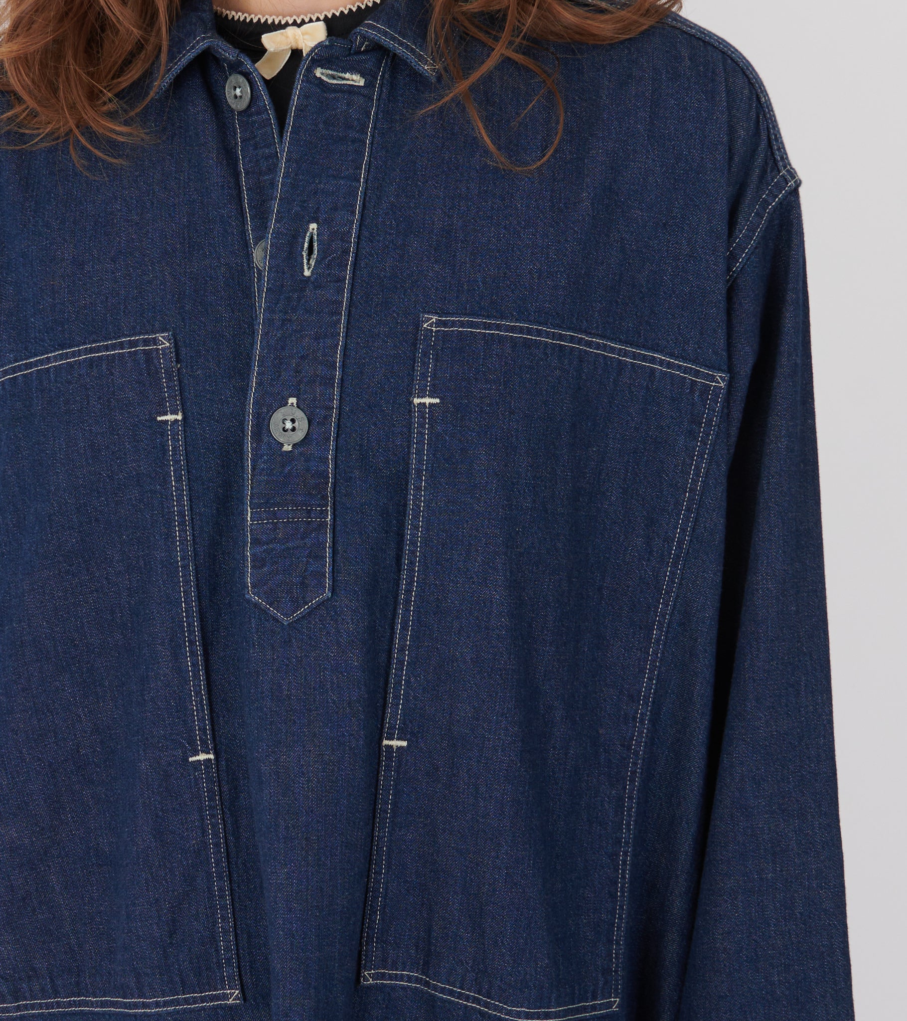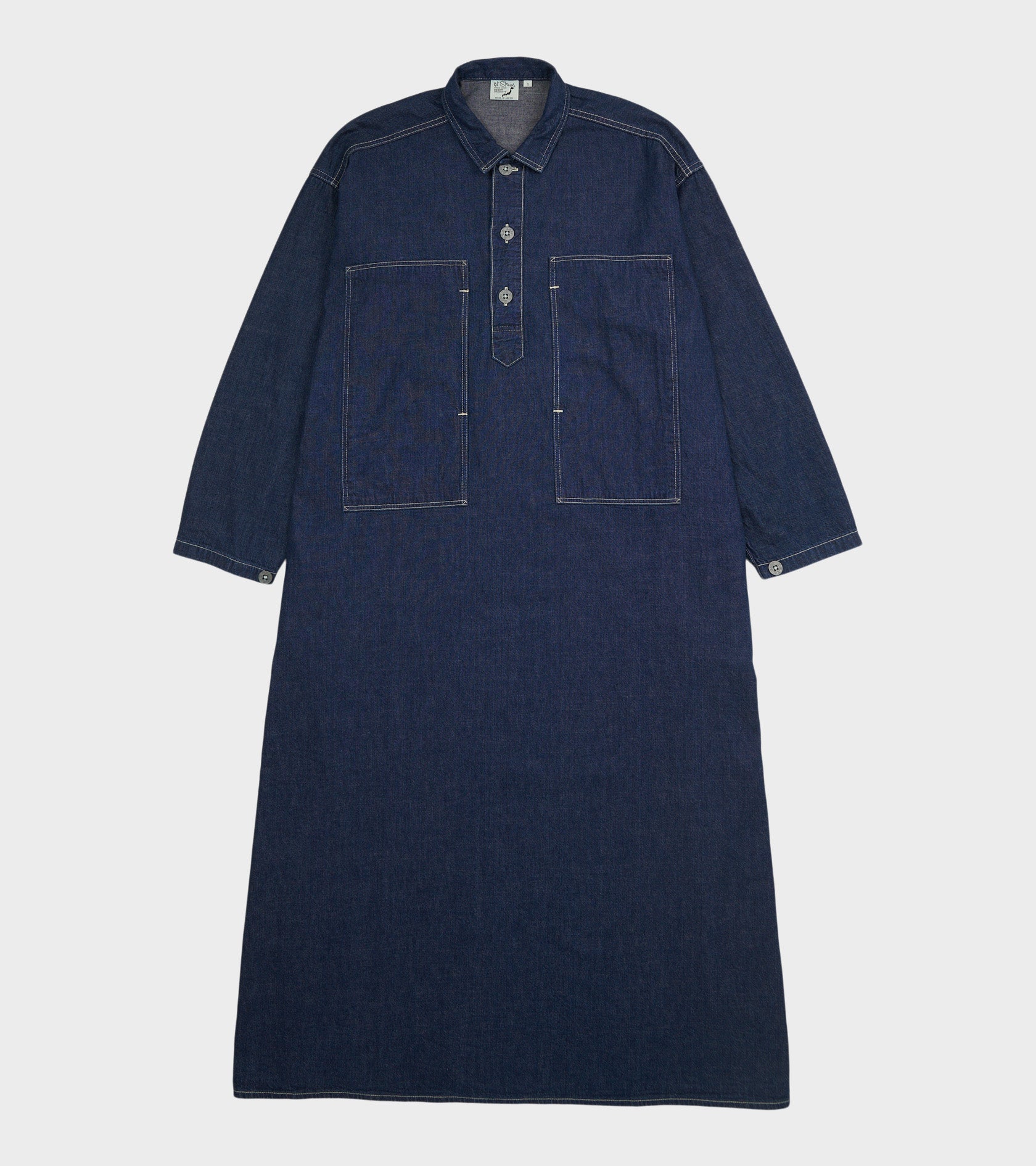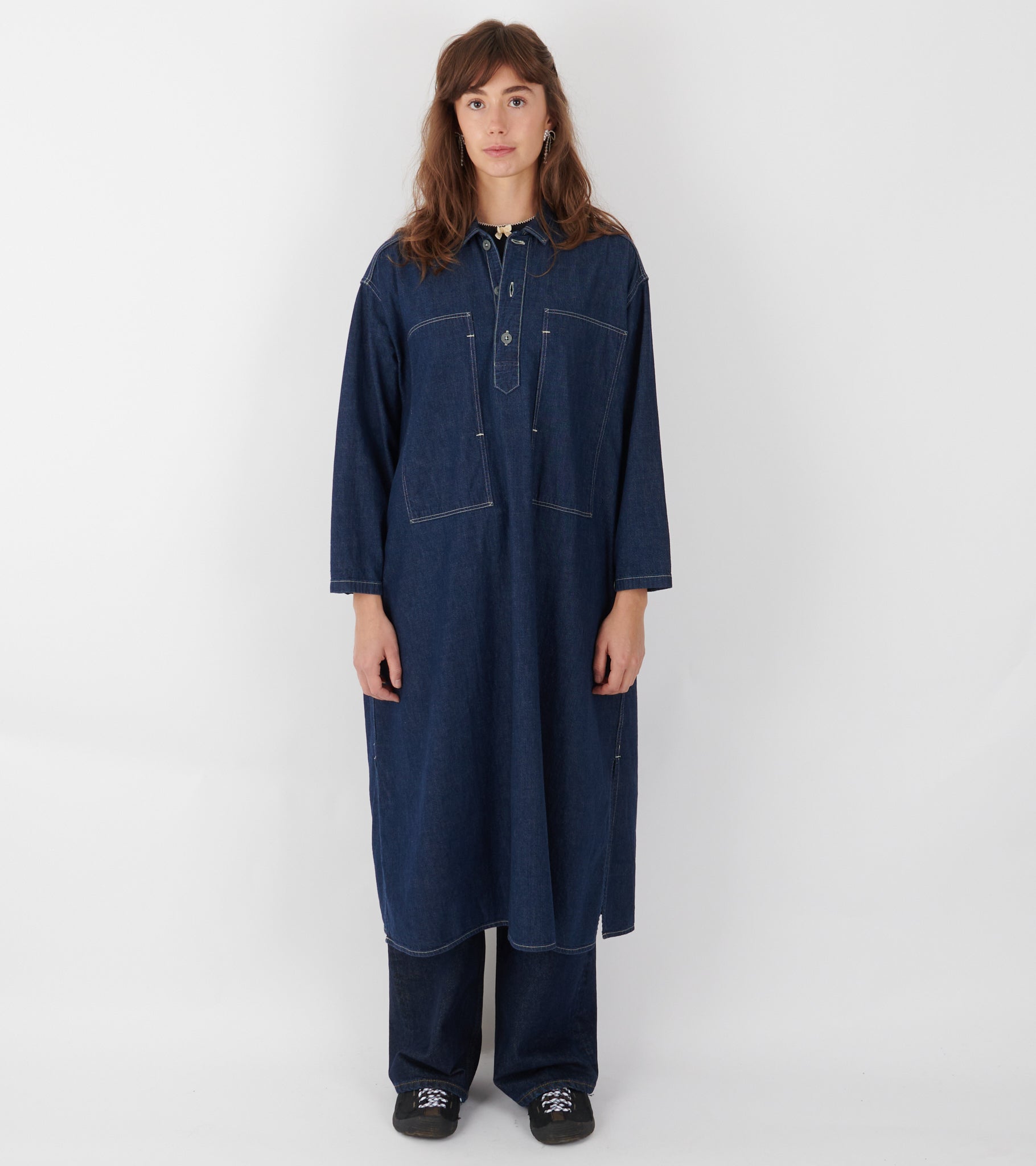 Mørkeblå denimkjole i bomuld. Kjolen har slidser i begge side, kontrast farvet syninger og kan åbnes ved håndled. Den har stolpelukning, en lomme på hver bryst samt sidelommer.
