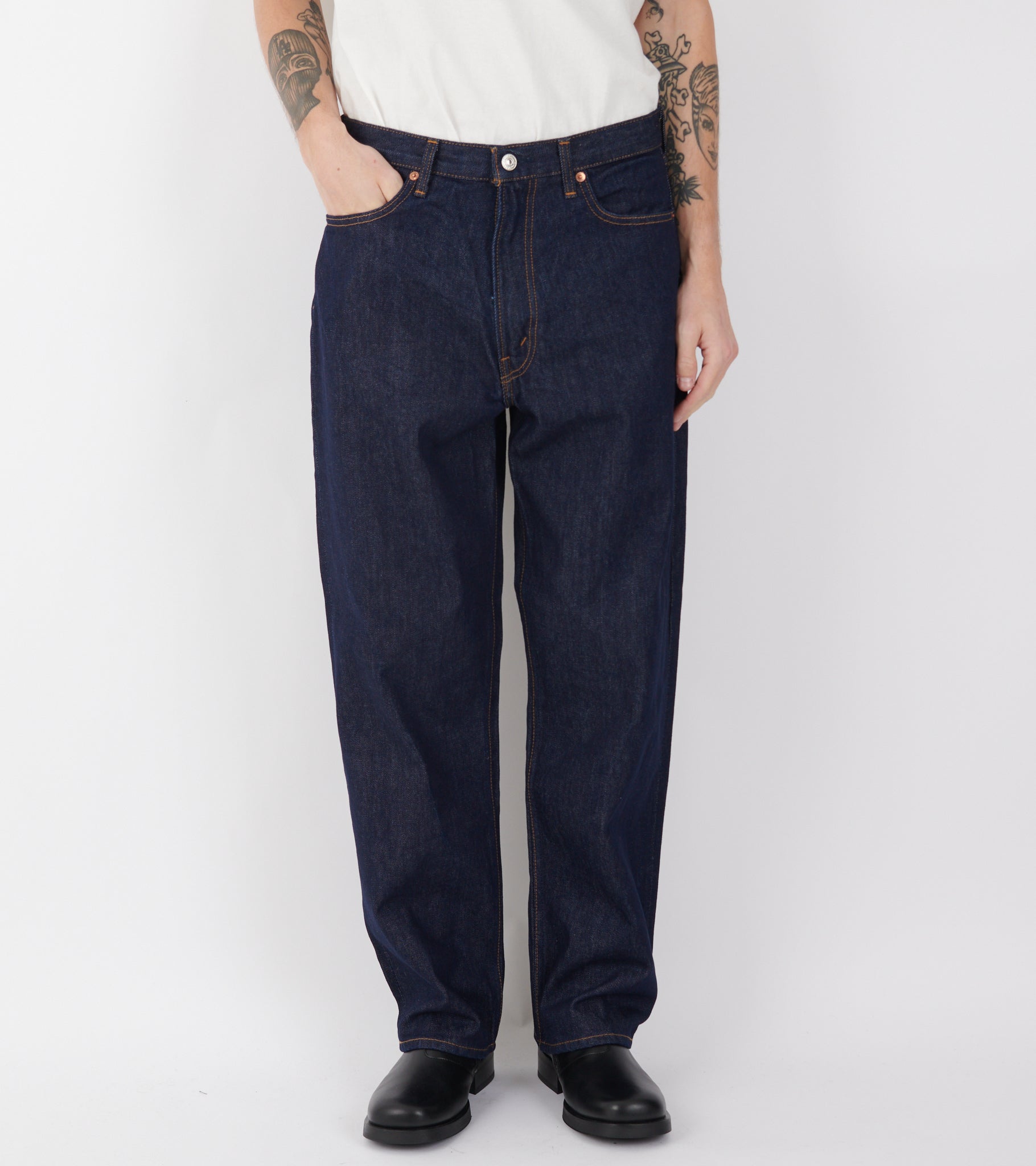 Mørkeblå jeans fra OrSlow. Disse jeans er fremstillet i bomuldsdenim. Øverst bagpå er et logotag i læder.