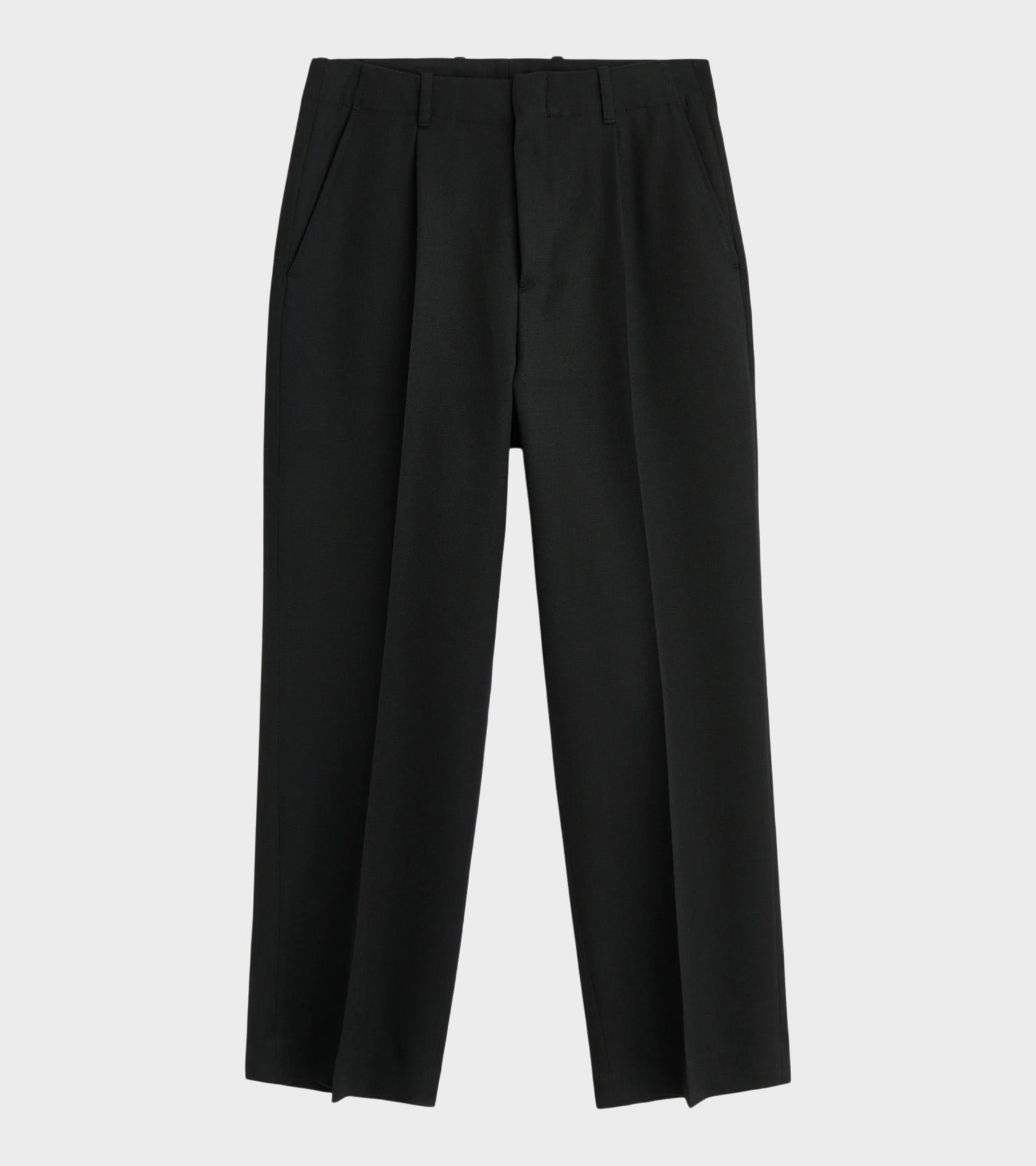 Sorte bukser i en jomfru uld twill kvalitet fra Our Legacy. Bukserne har bæltestropper, læg på fronten, en skrålomme i hver side og to stiklommer bagpå.