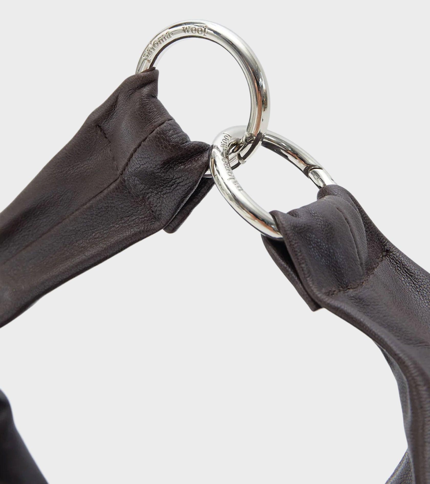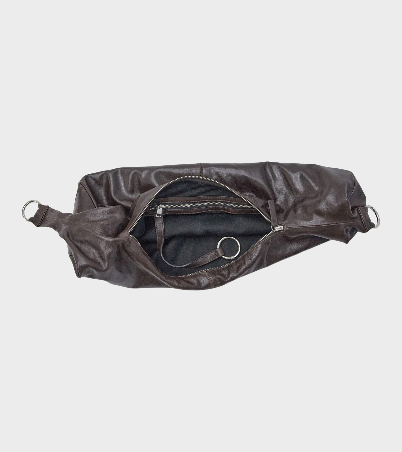 Aflang, wrap-around boho-skuldertaske i mørkebrunt let shiny læder fra Paloma Wool. Dry Bag kan styles på flere forskellige måder - flad og lang til crossbody-brug samt uden det ekstra stykke rem, men fastgjort gennem ringene, som skuldertaske.