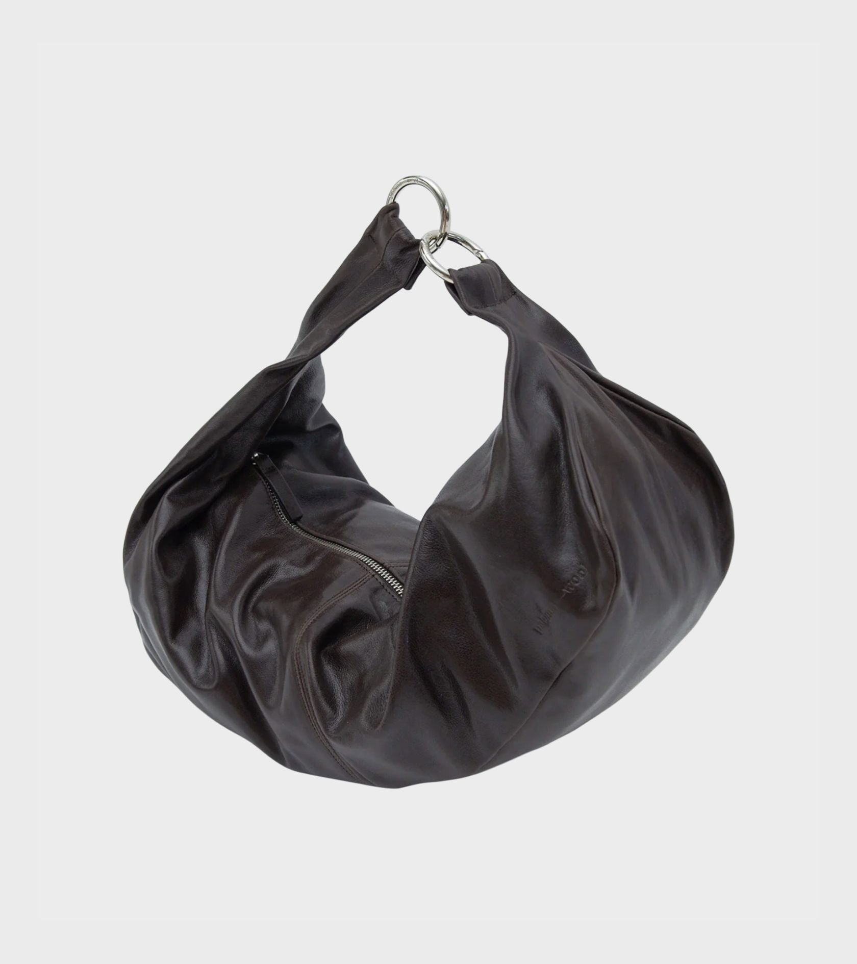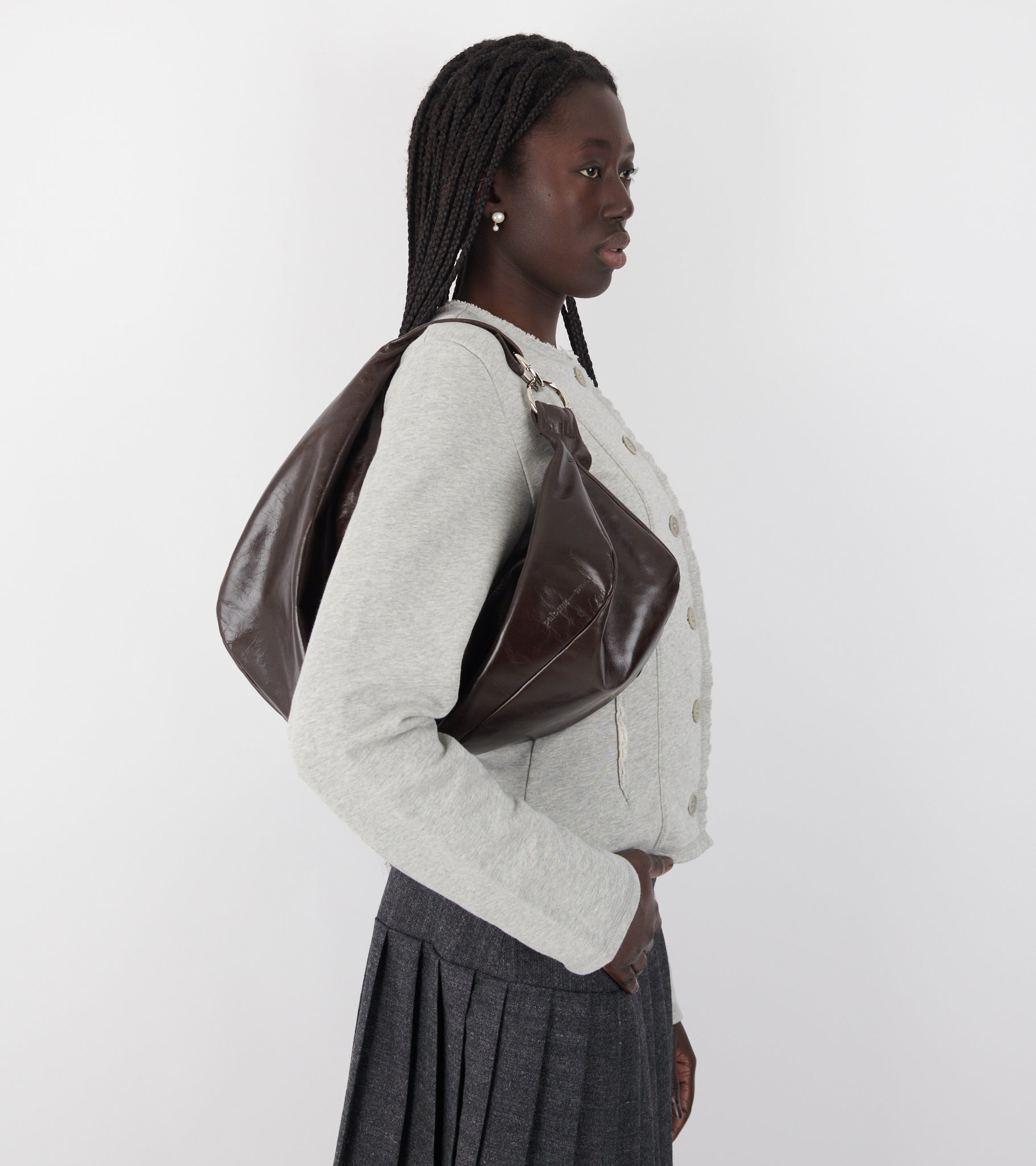 Aflang, wrap-around boho-skuldertaske i mørkebrunt let shiny læder fra Paloma Wool.
