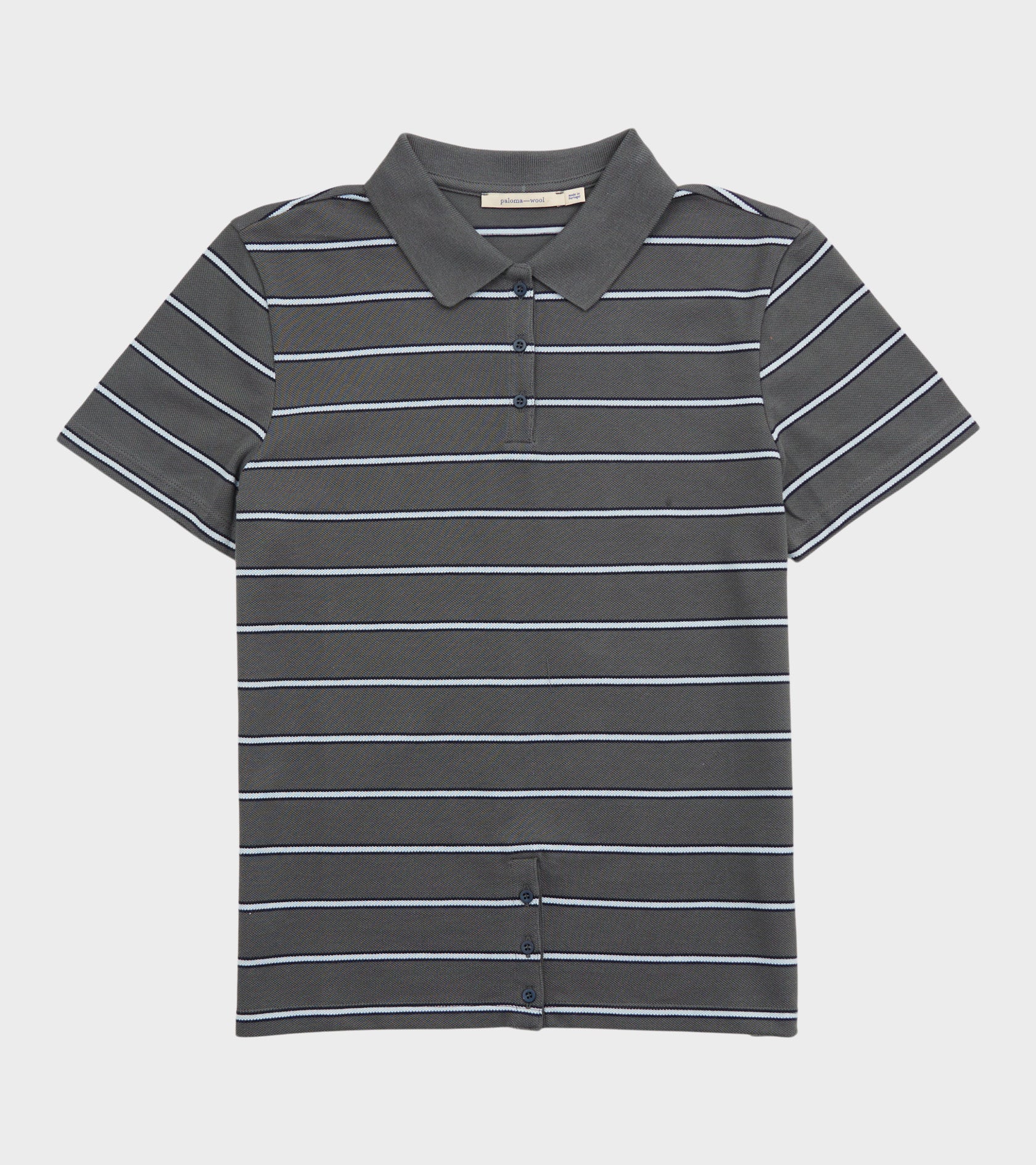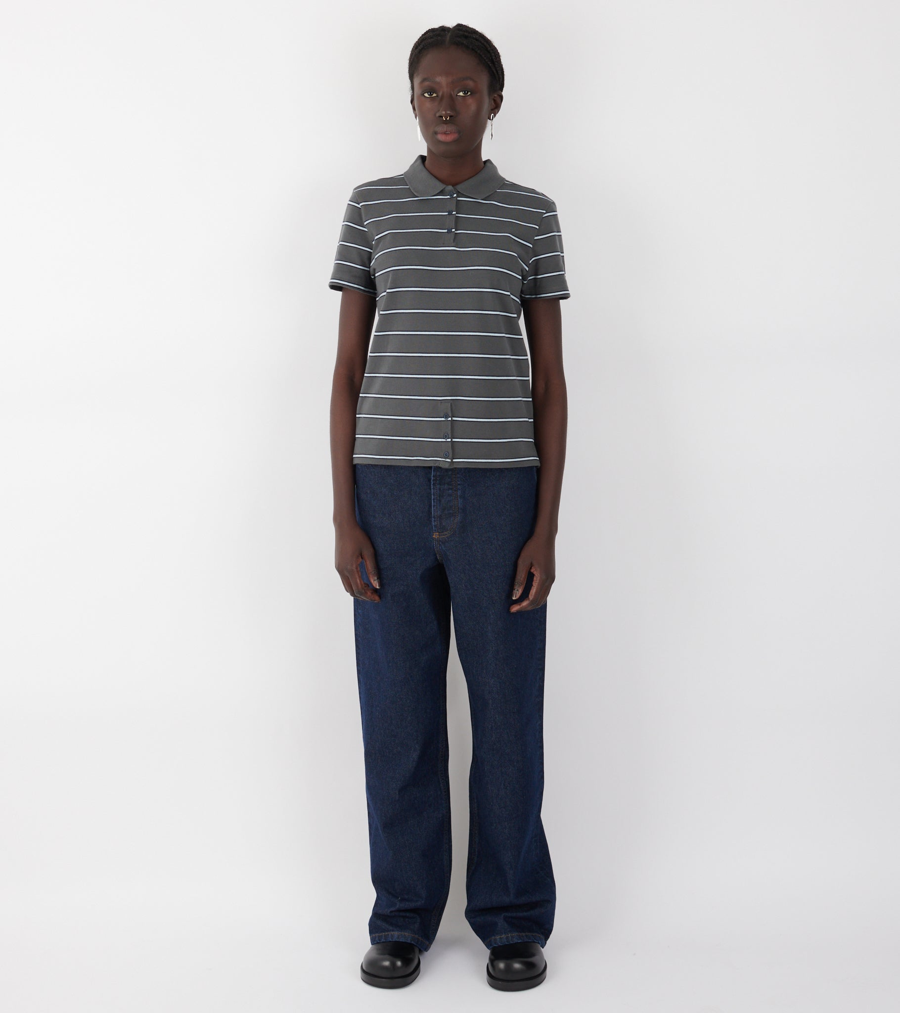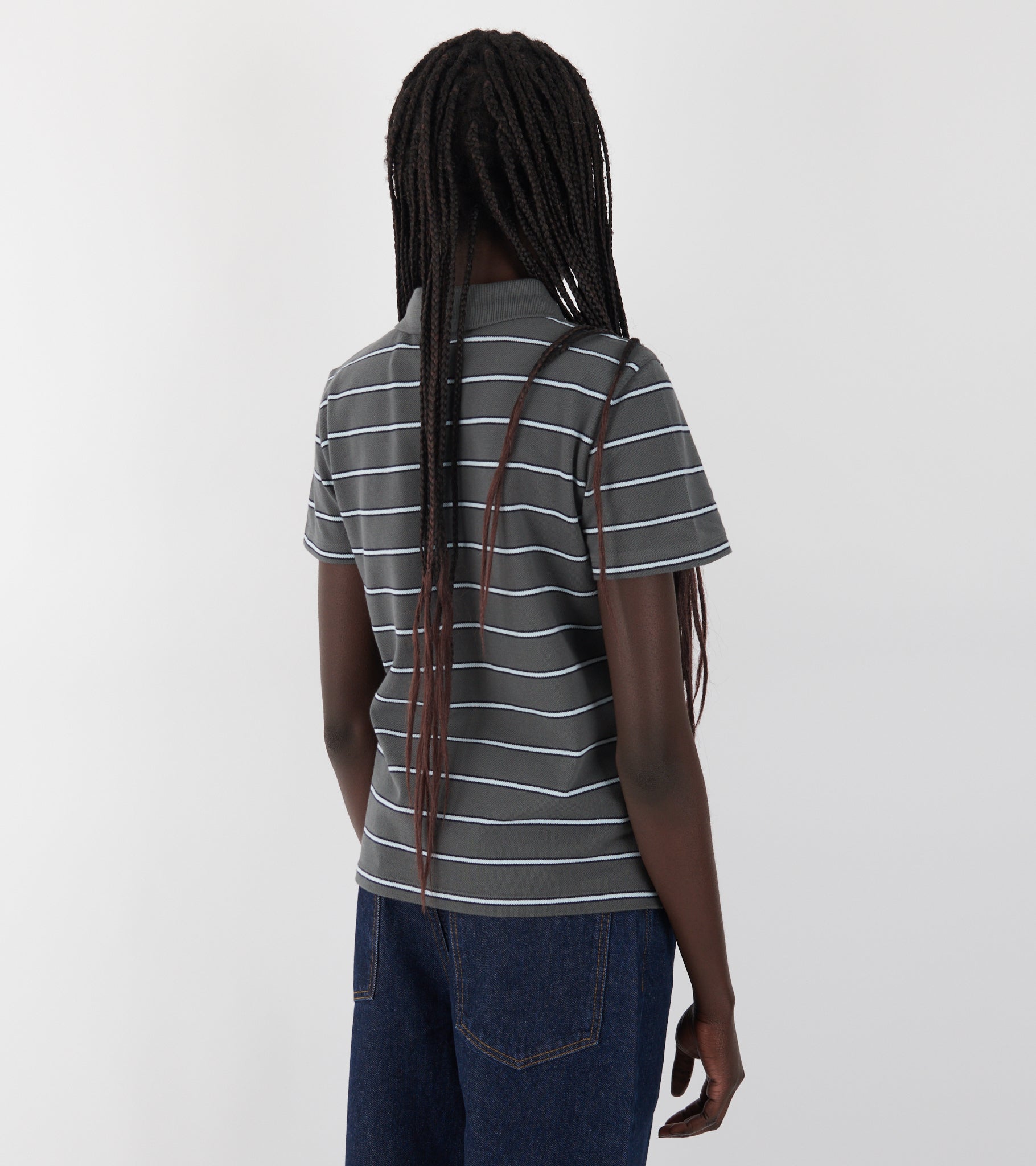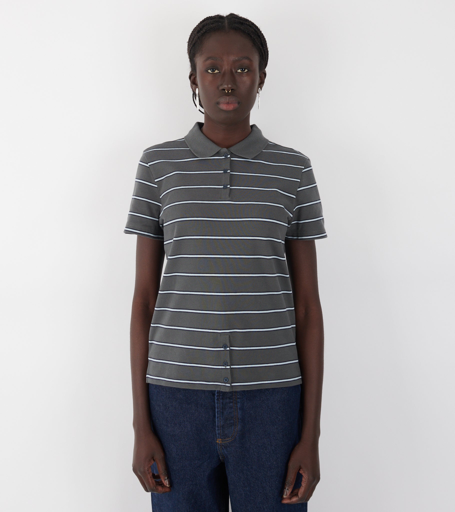 Stribet mørkegrå kortærmet polo fra Paloma Wool. Julieta Polo er fremstillet i økologisk bomuldspiqué og har en klassisk polo-krave samt en knaplukning med tre knapper øverst og tre knapper i bunden.