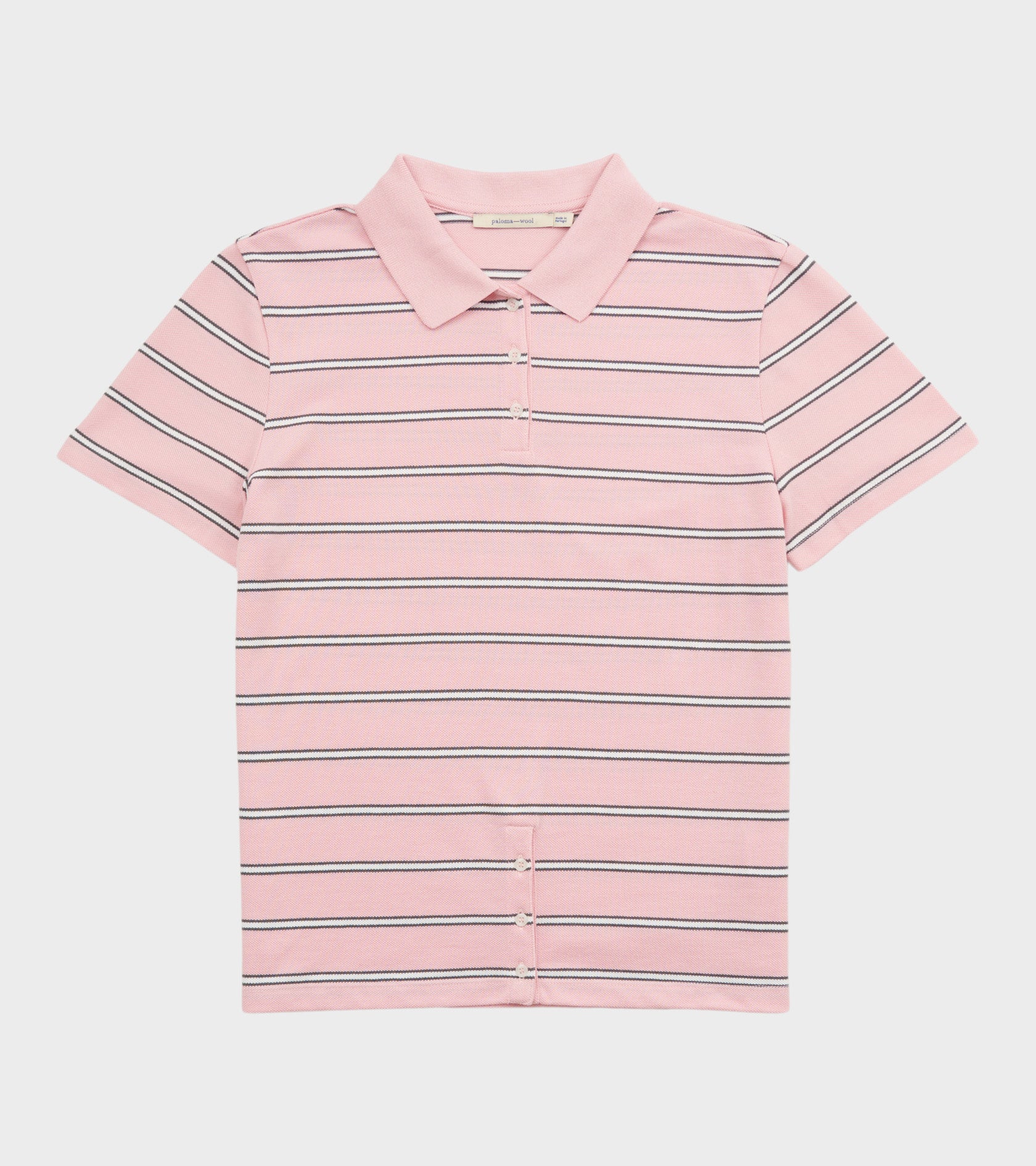 Stribet lyserød kortærmet polo fra Paloma Wool. Julieta Polo er fremstillet i økologisk bomuldspiqué og har en klassisk polo-krave samt en knaplukning med tre knapper øverst og tre knapper i bunden.