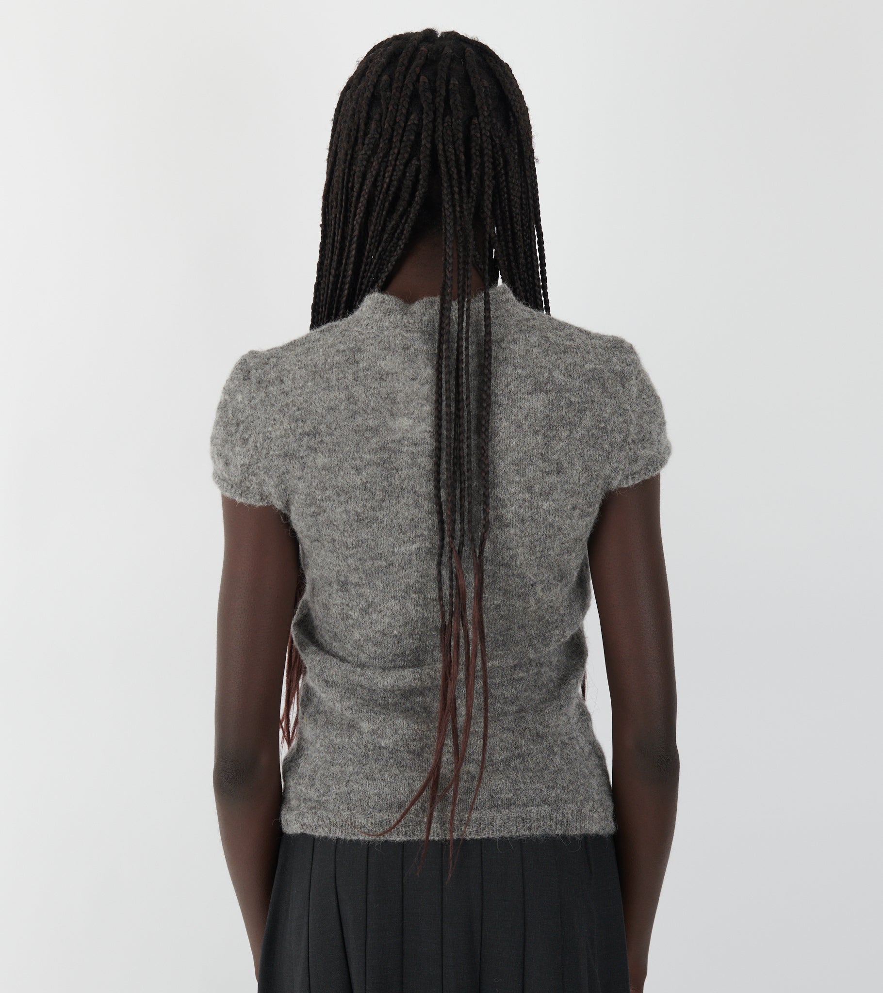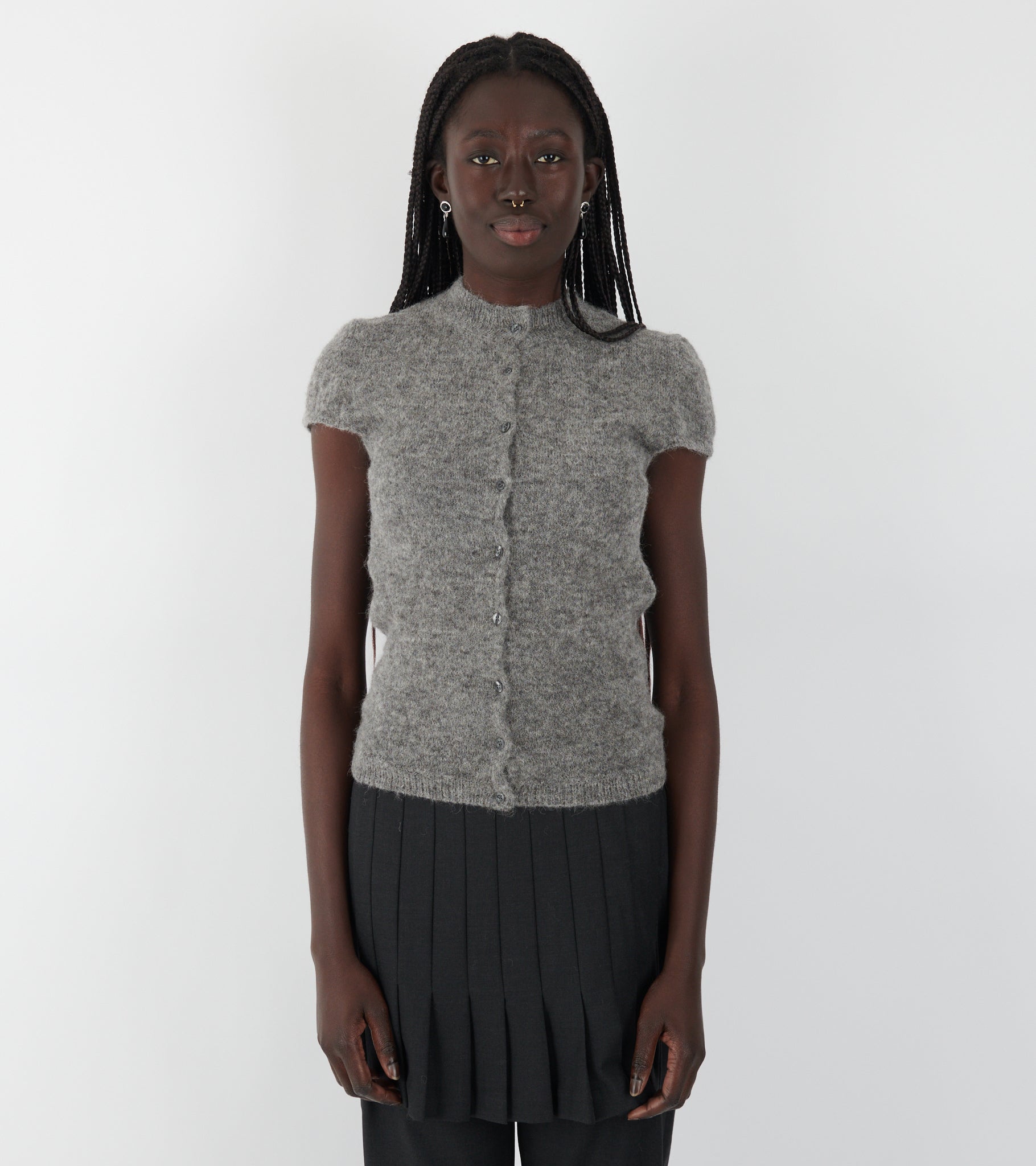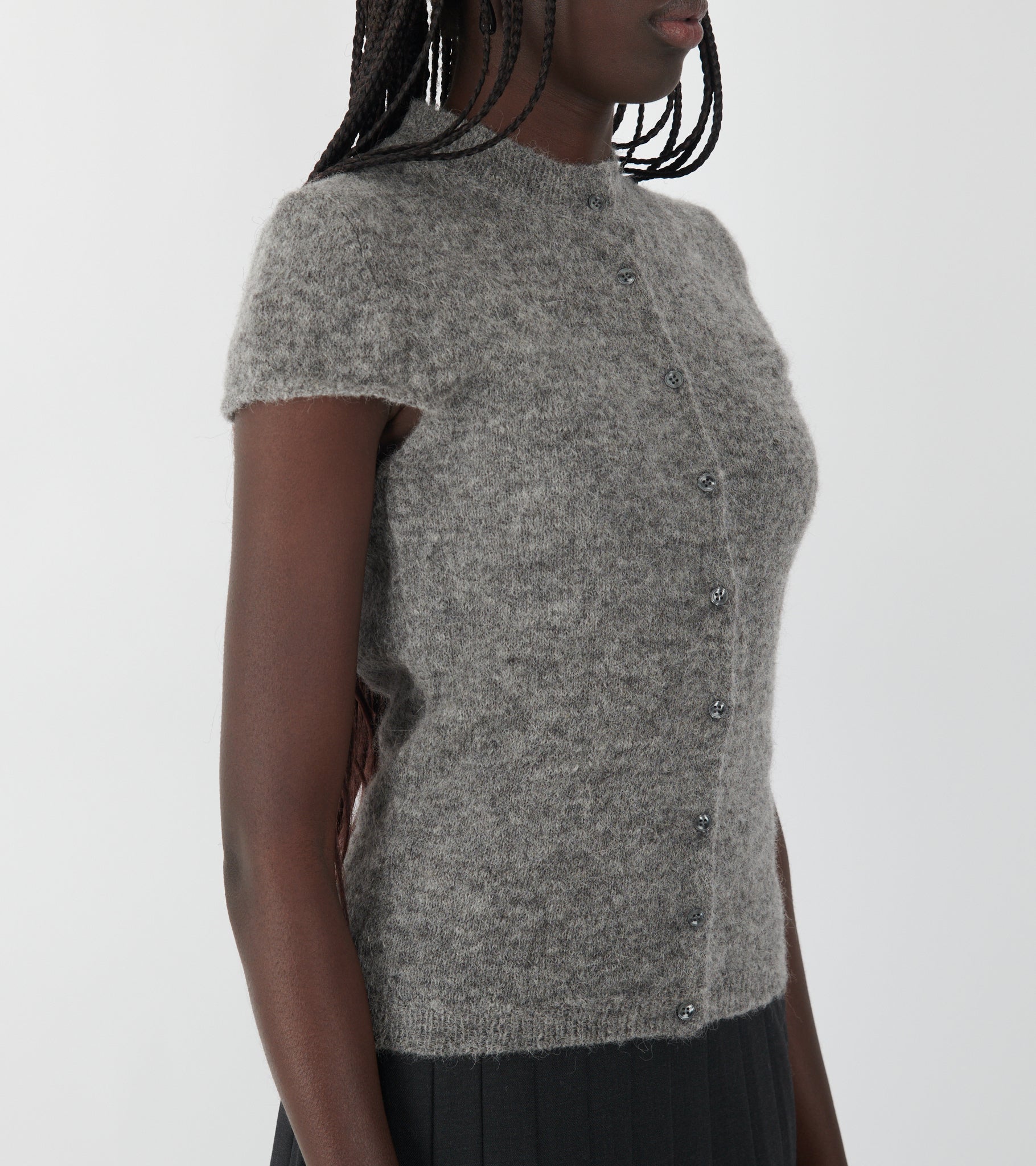 Grå kortærmet cardigan fra Paloma Wool. Denne cardigan er fremstillet i en blød alpaka-uldblanding med en 'hairy' tekstur. Den har en rund hals, en knaplukning på fronten, ribstrikkede kanter samt en 'fitted' silhuet.