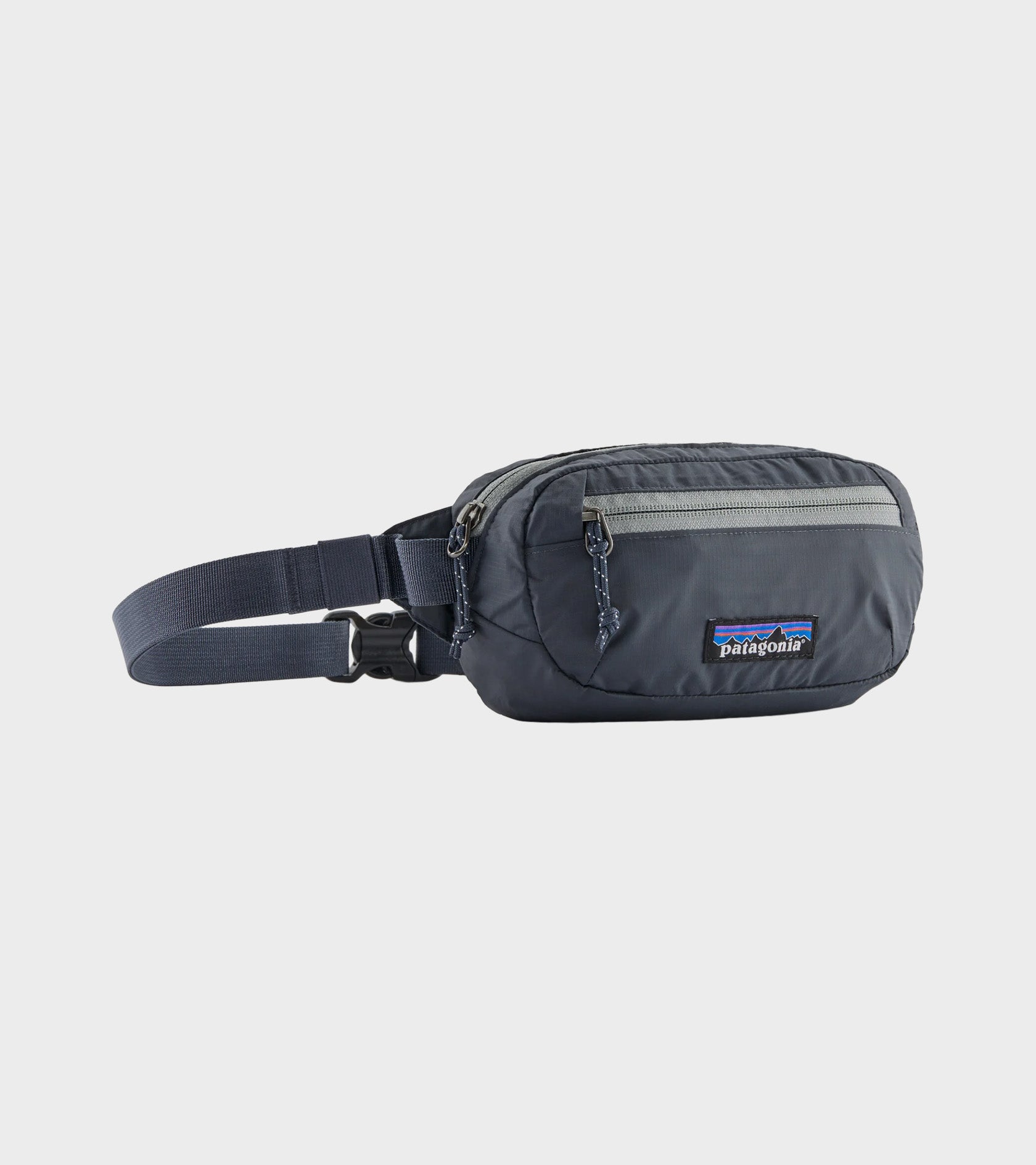 Navy bæltetaske fra Patagonia. Denne taske har en justerbar strop, ét centralt lynlås-rum samt en lynlåslomme på fronten. Tasken er fremstillet i genanvendt nylon.