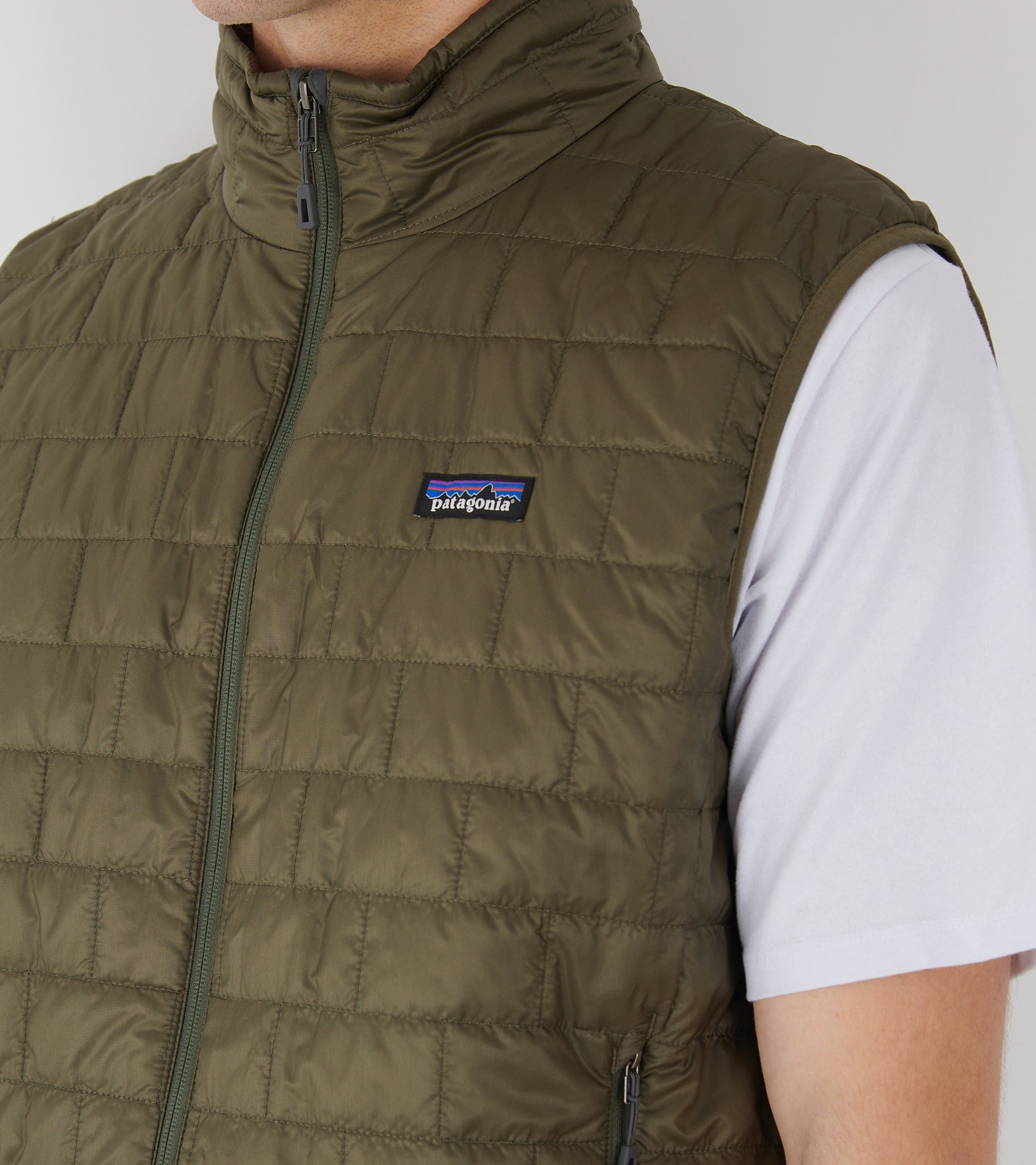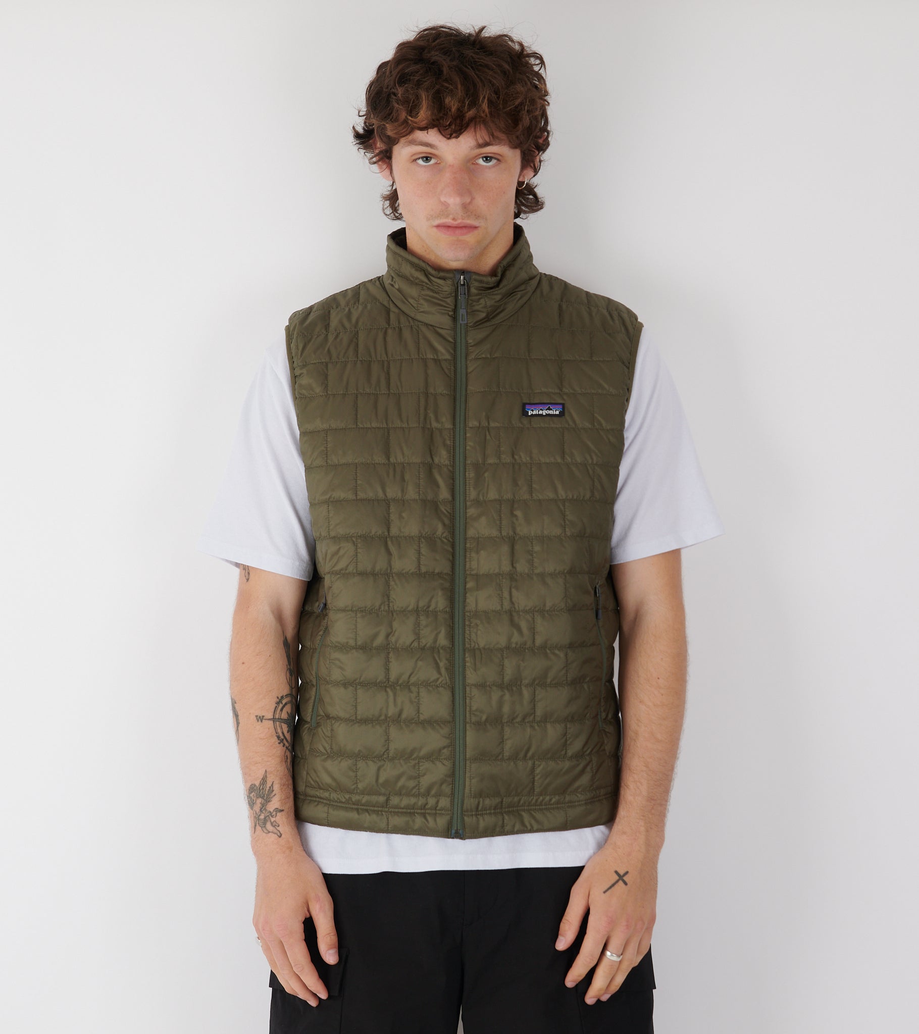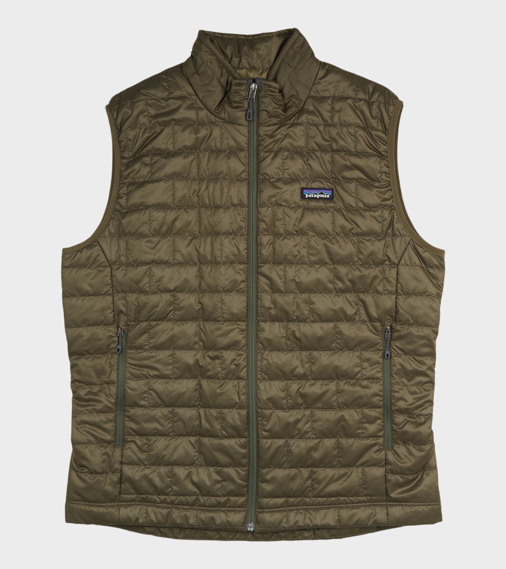 Olivengrøn vest fra Patagonia. M's Nano Puff Vest er fremstillet i genanvendt polyester og er en varm samt vind- og vandafvisende vest. Vesten er kviltet og har en lynlåslukning og to lynlåslommer på fronten. Ved venstre bryst er et logo.