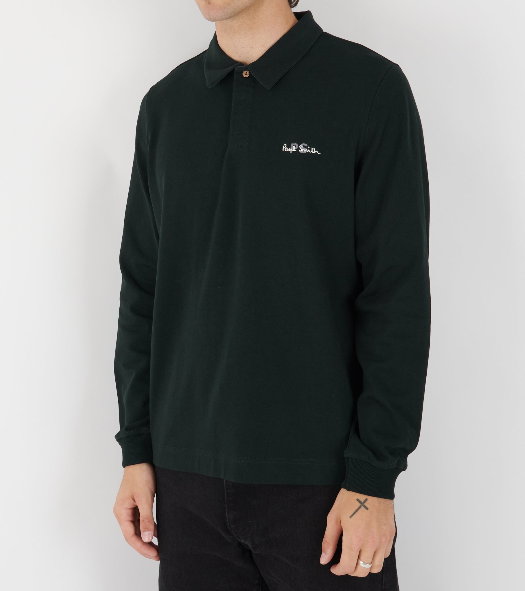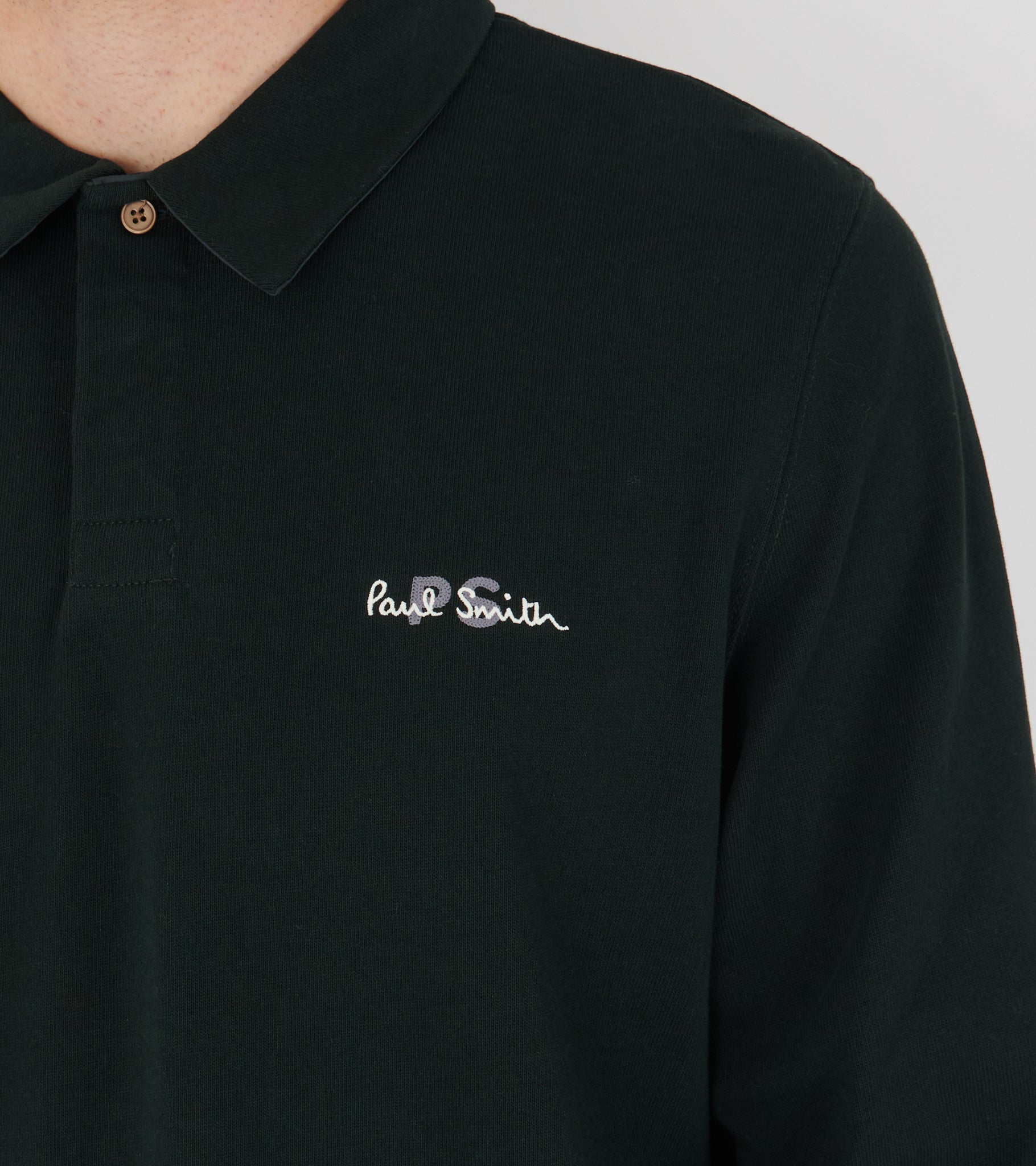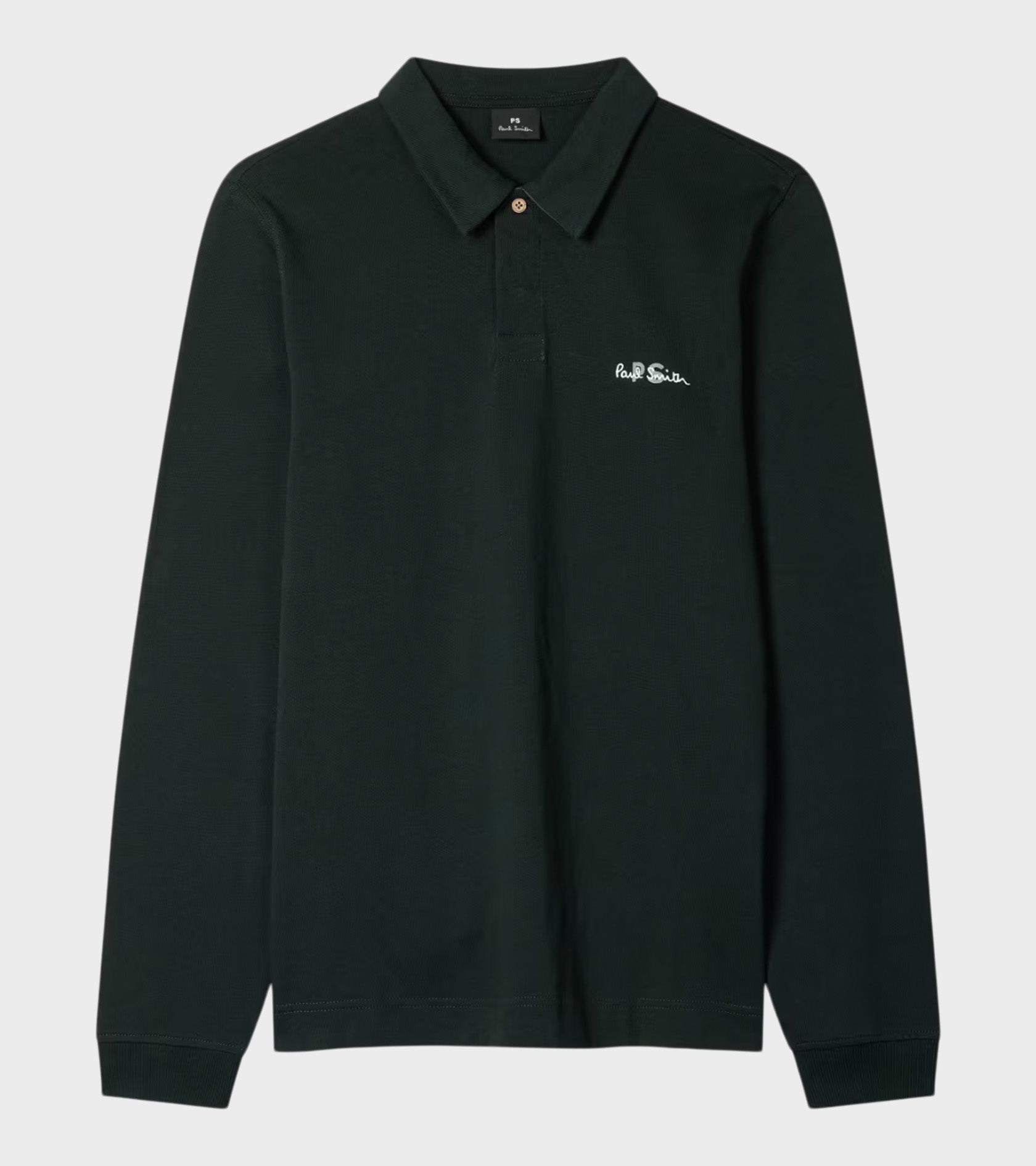 Grøn langærmet polo fra Paul Smith. Poloen har et broderet logo og en skjult knaplukning øverst.