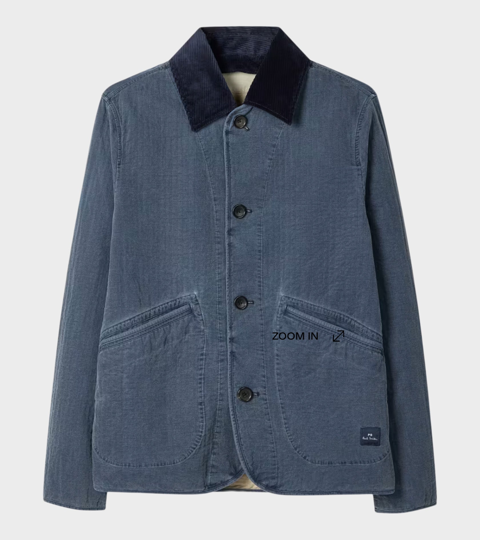Garment washed jakke med aftagelig krave fra Paul Smith. Jakken har en krave i mørkeblåt bomuldsfløjl, en knaplukning, en indvendig lomme samt to lommer på fronten. På den ene lomme er et lille logo. Jakken er fremstillet i bomulds med en let kviltet struktur.