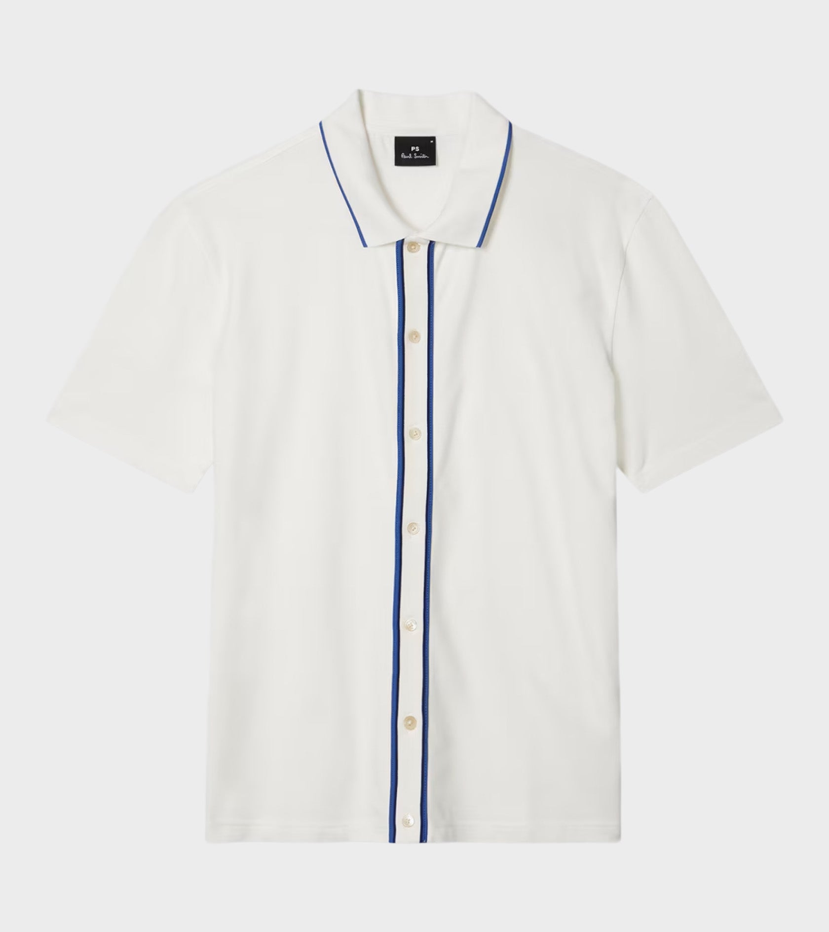 Hvid kortærmet polo i økologisk bomuldspiqué fra Paul Smith. Denne polo har en klassisk polo-krave, blå kontraststriber og en knaplukning på fronten.
