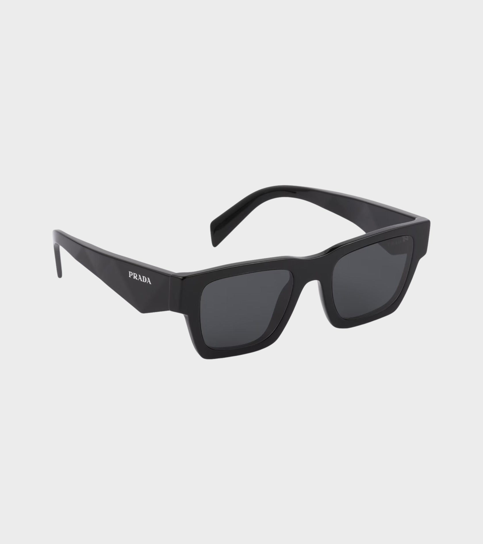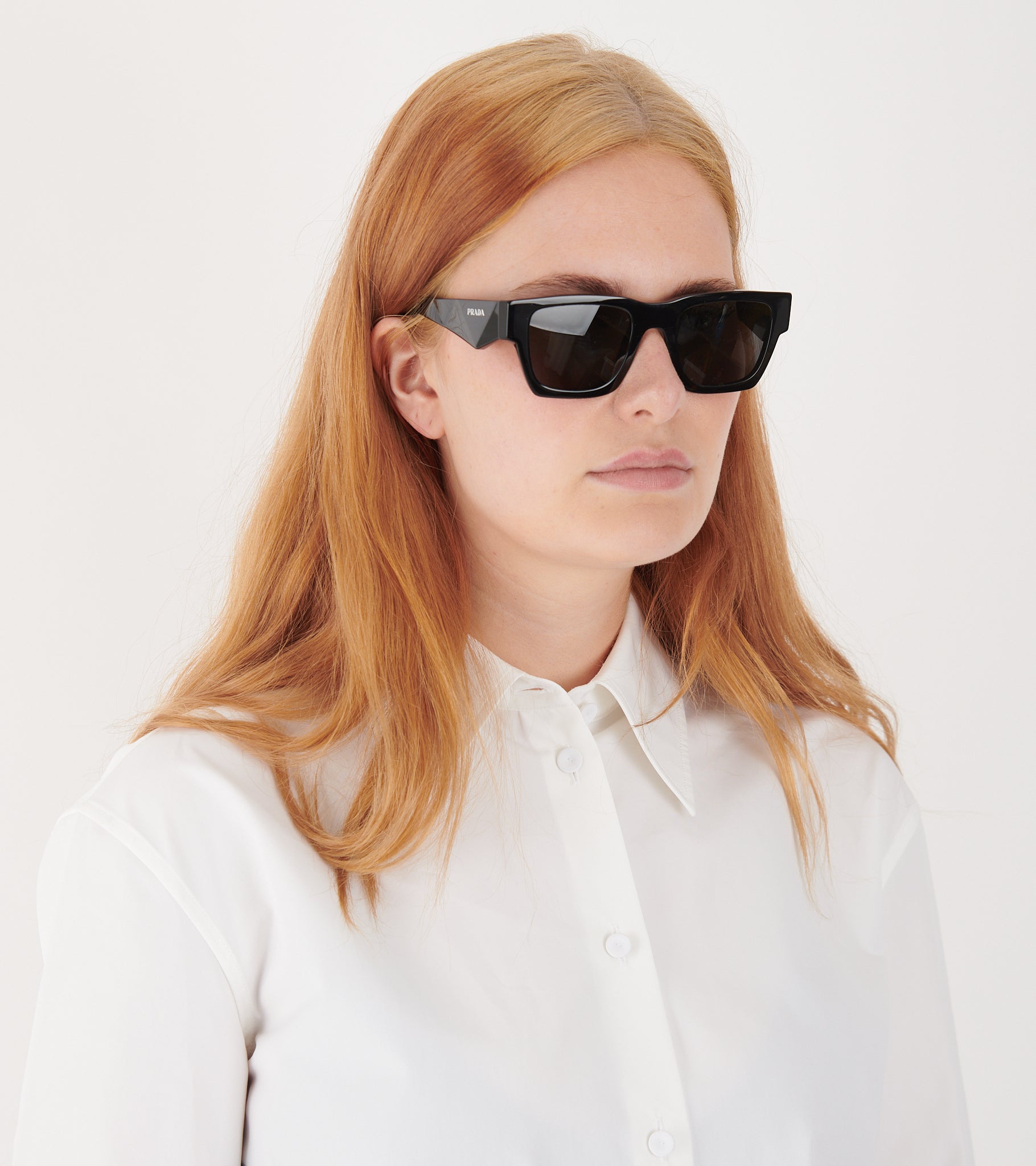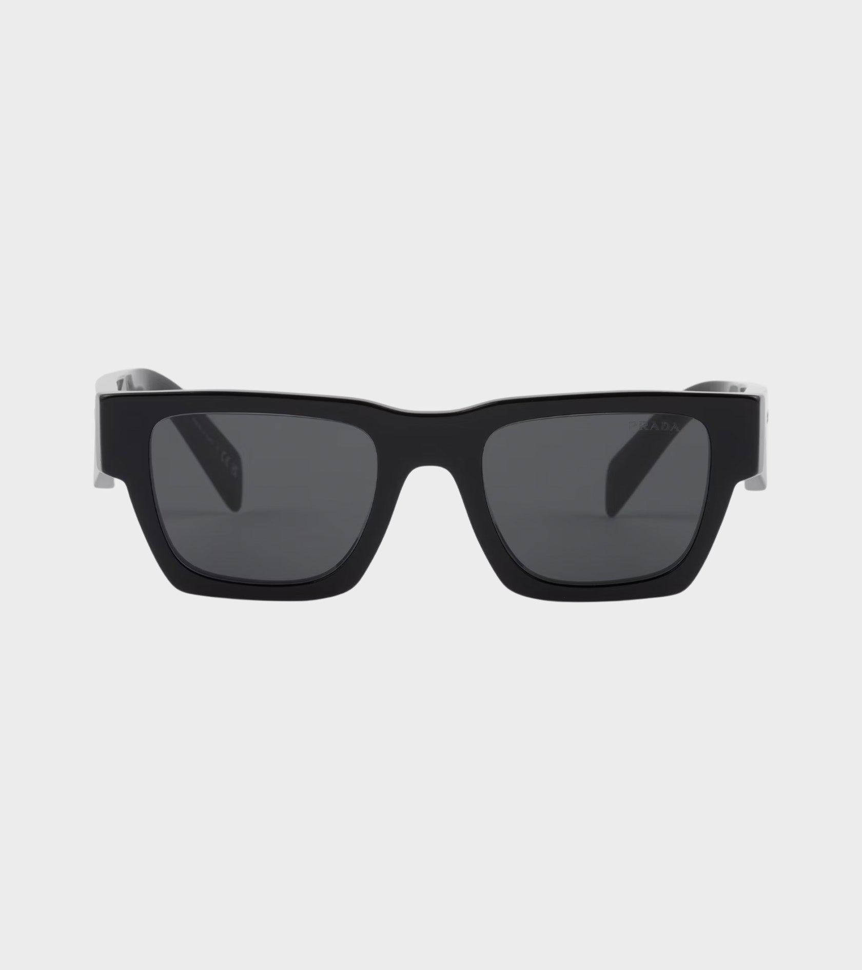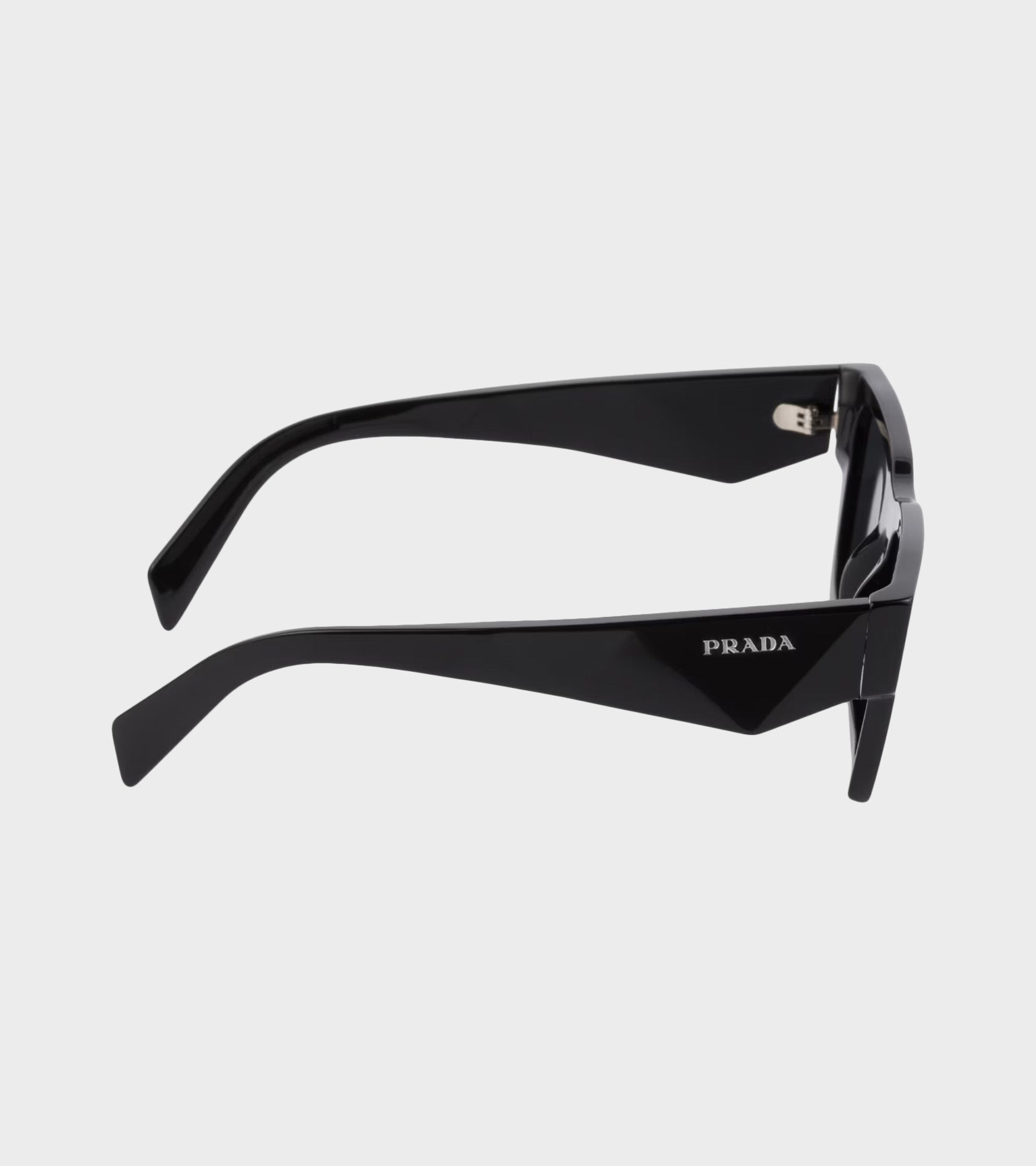 Sorte solbriller fra Prada Eyewear. Disse solbriller har mørkegråt glas - i det ene glas er et lille diskret indgraveret logo. På hver side er Pradas logo i sølv. Solbrillerne kommer i et sort æske og etui medfølger.