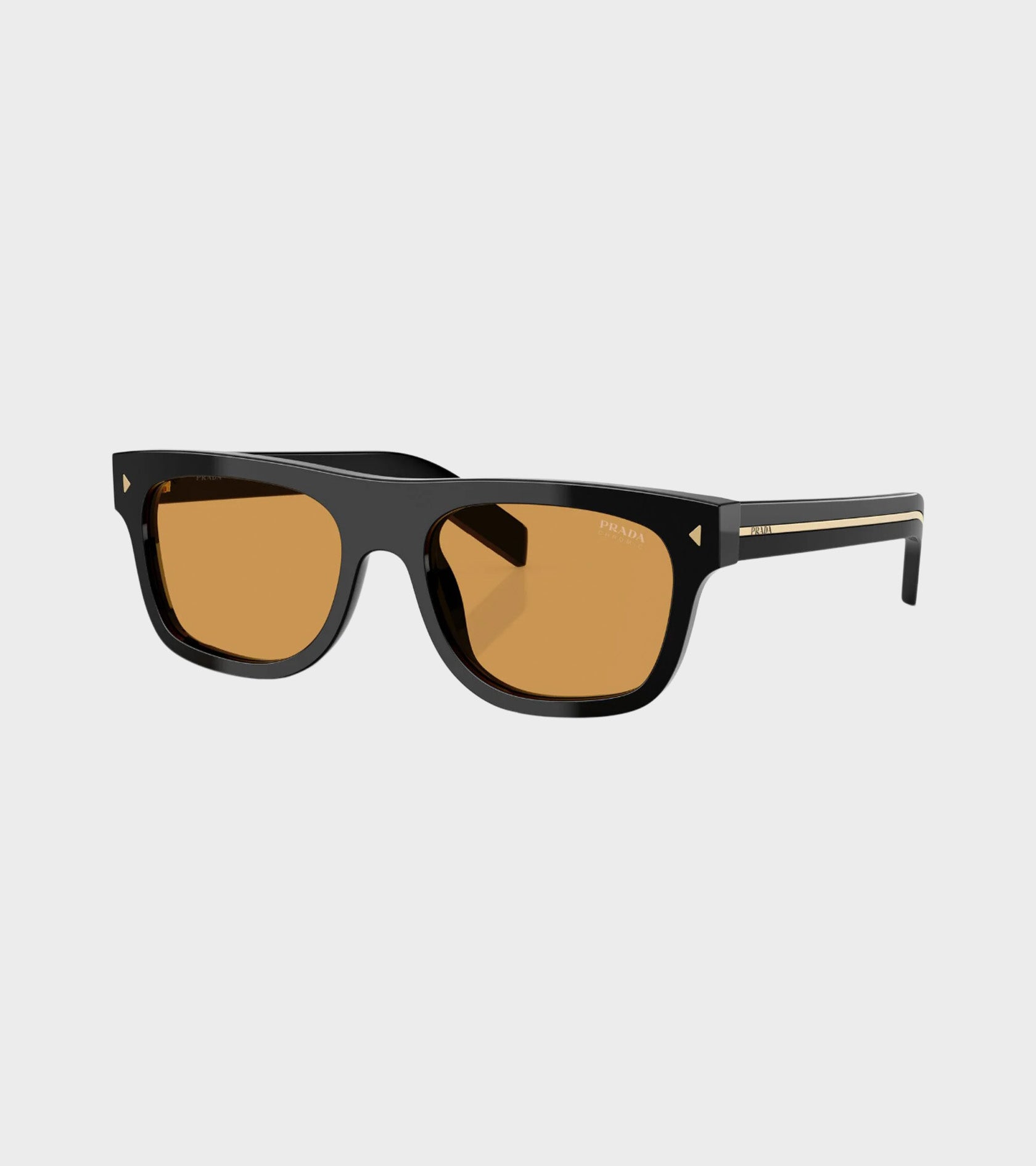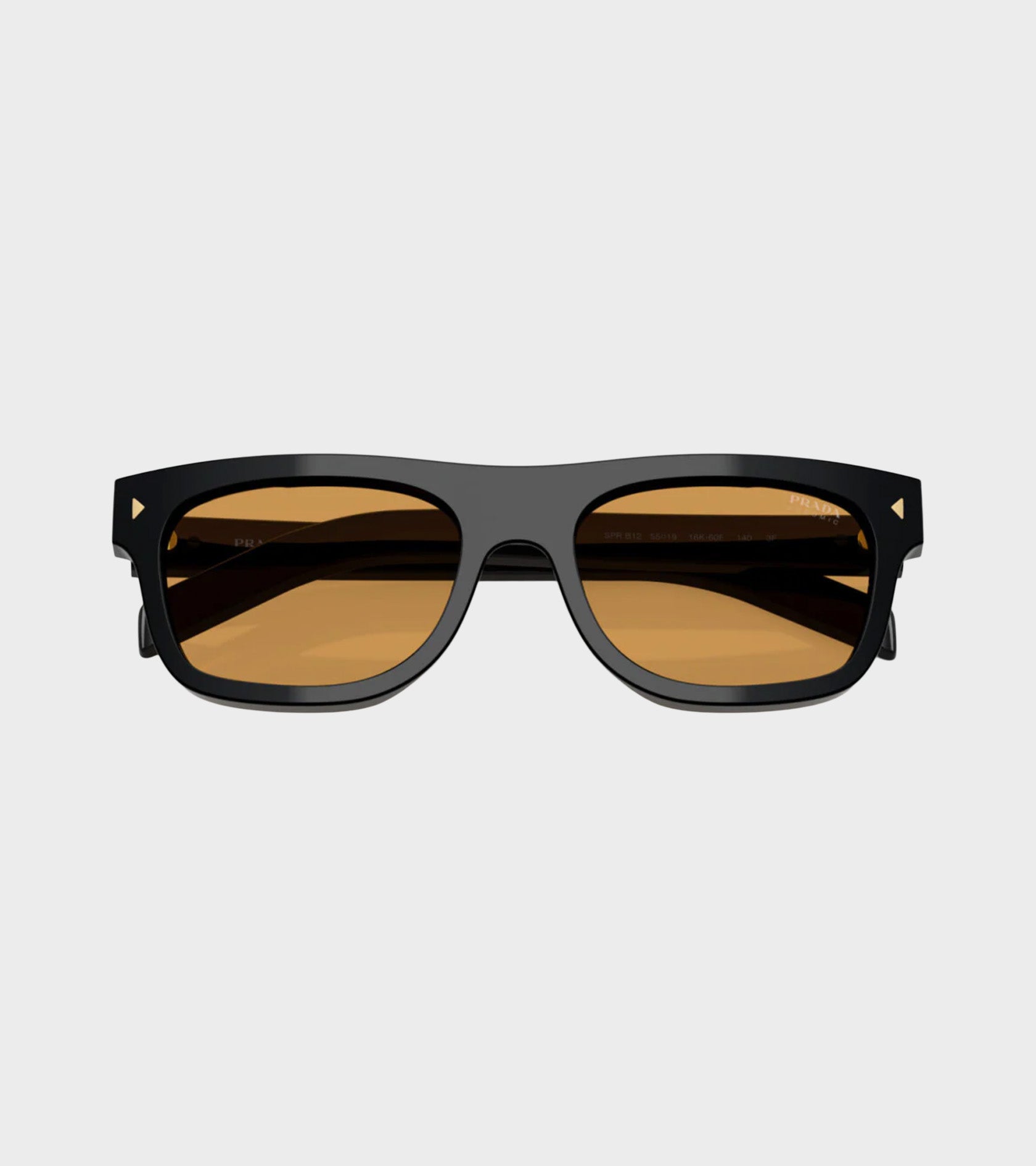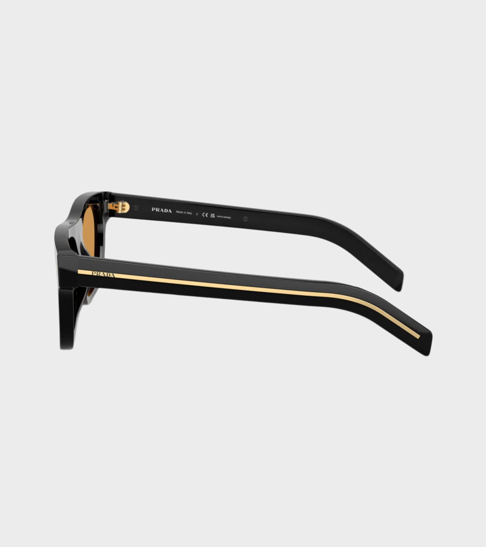 Sorte solbriller fra Prada Eyewear. Disse solbriller har brunt glas - i det ene glas er et lille diskret indgraveret logo. Siderne er detaljeret med guld og har et lille logo. Solbrillerne kommer i en sort æske og etui medfølger.