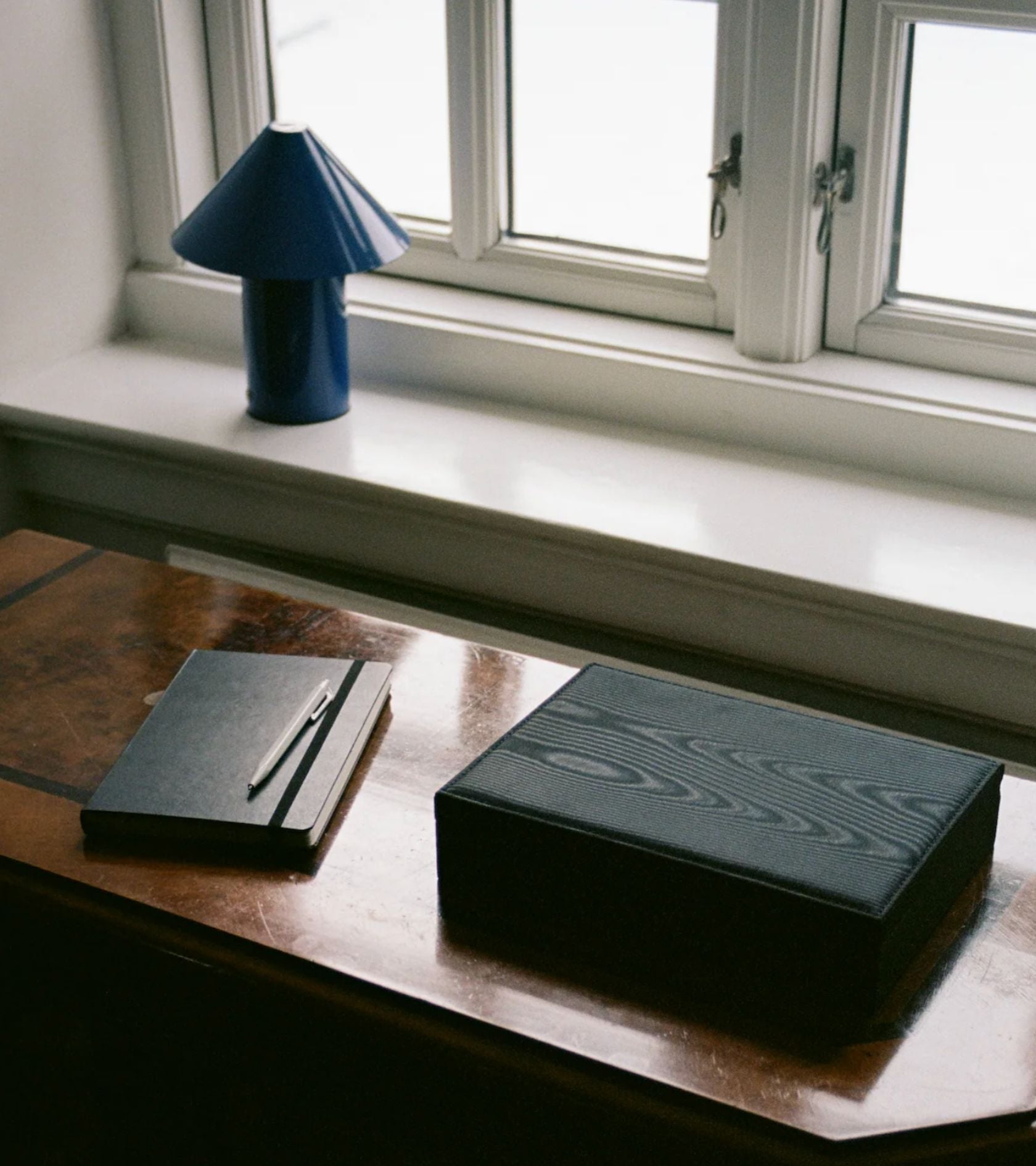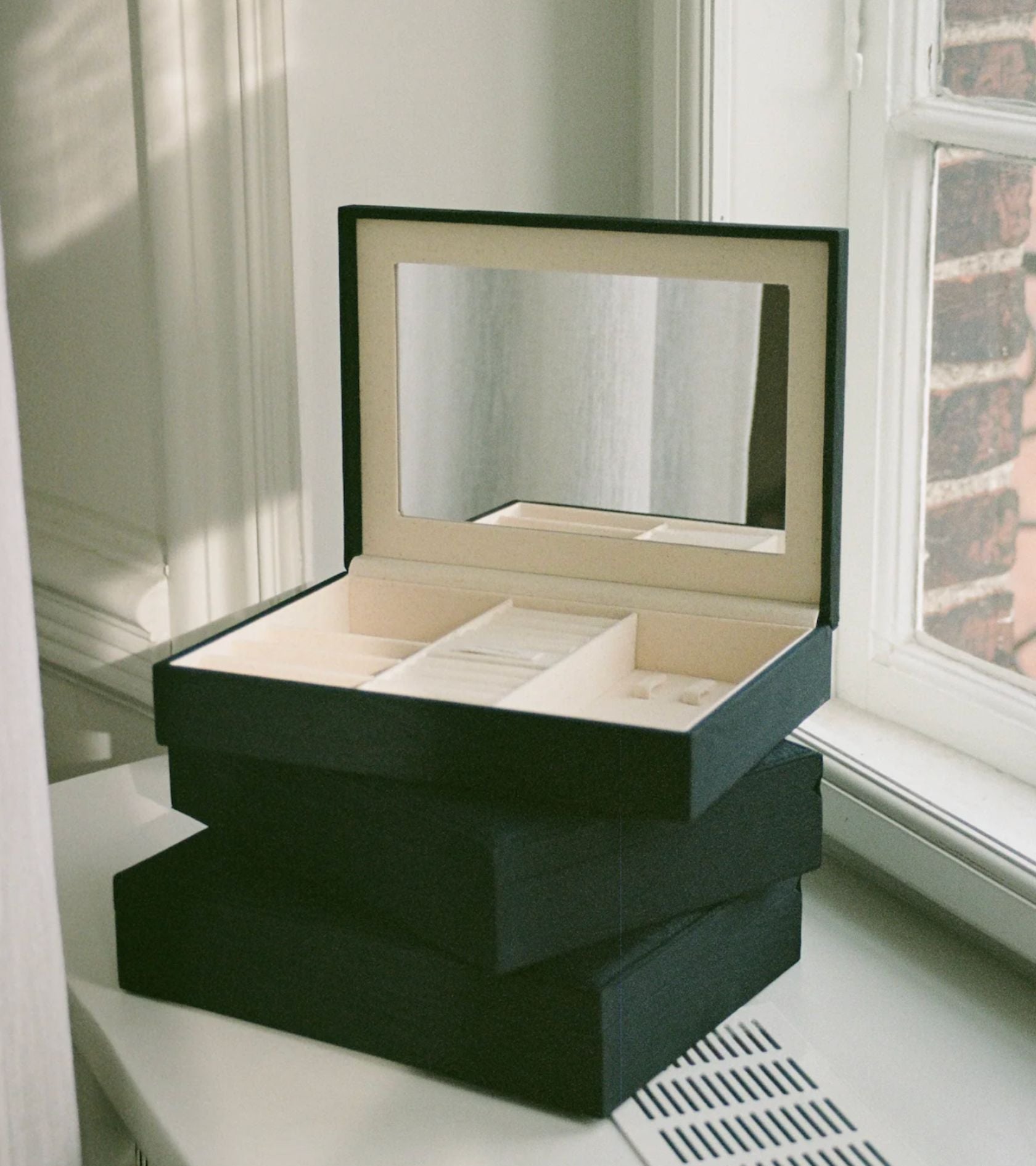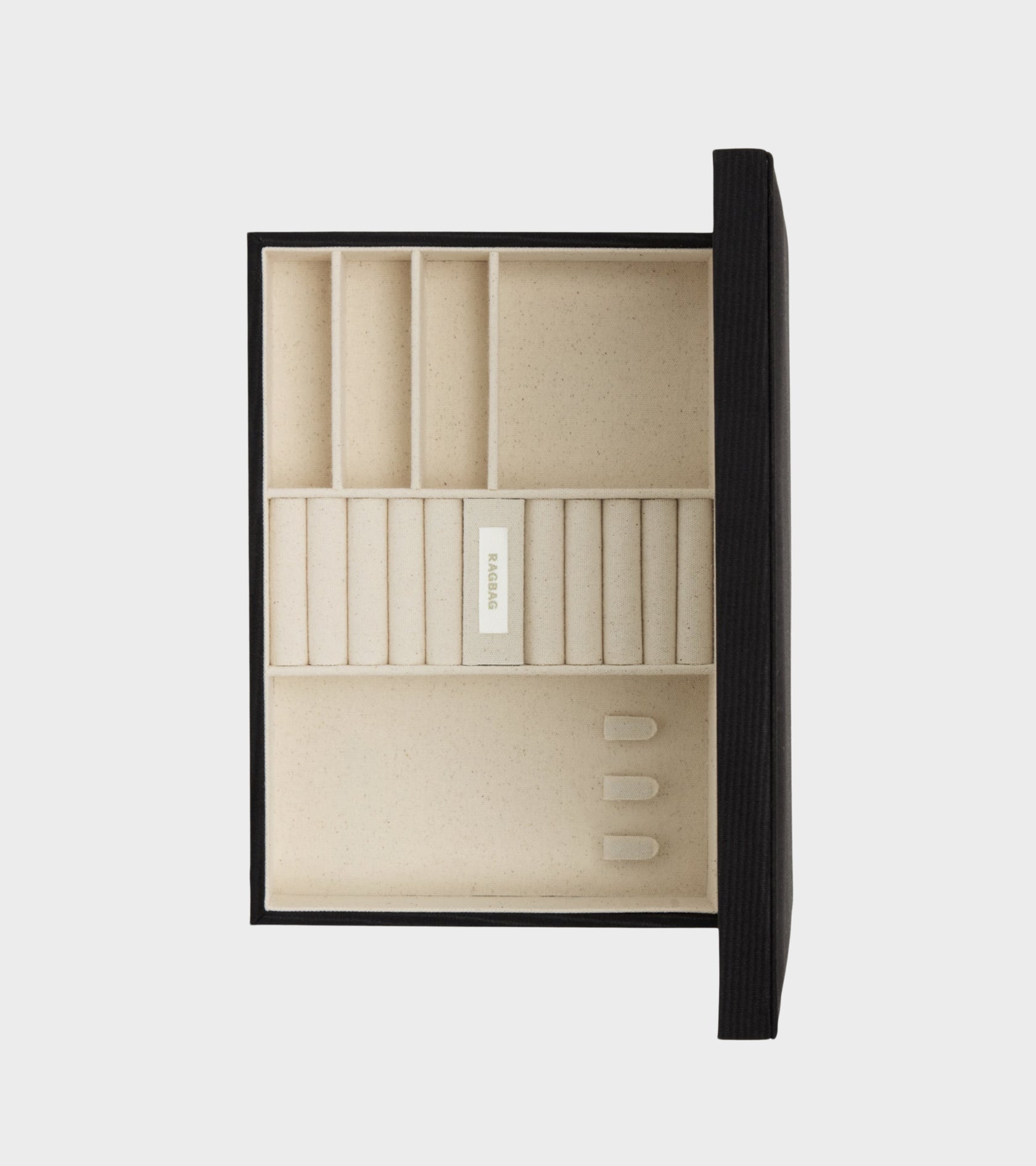 Stor sort smykkeæske fra Ragbag. Jewelry Case Moiré er designet som en hardcase og betrukket med sort polyester i en bølget 'Moiré' kvalitet. Indvendigt er specialdesignede rum til organisering af dine smykker.