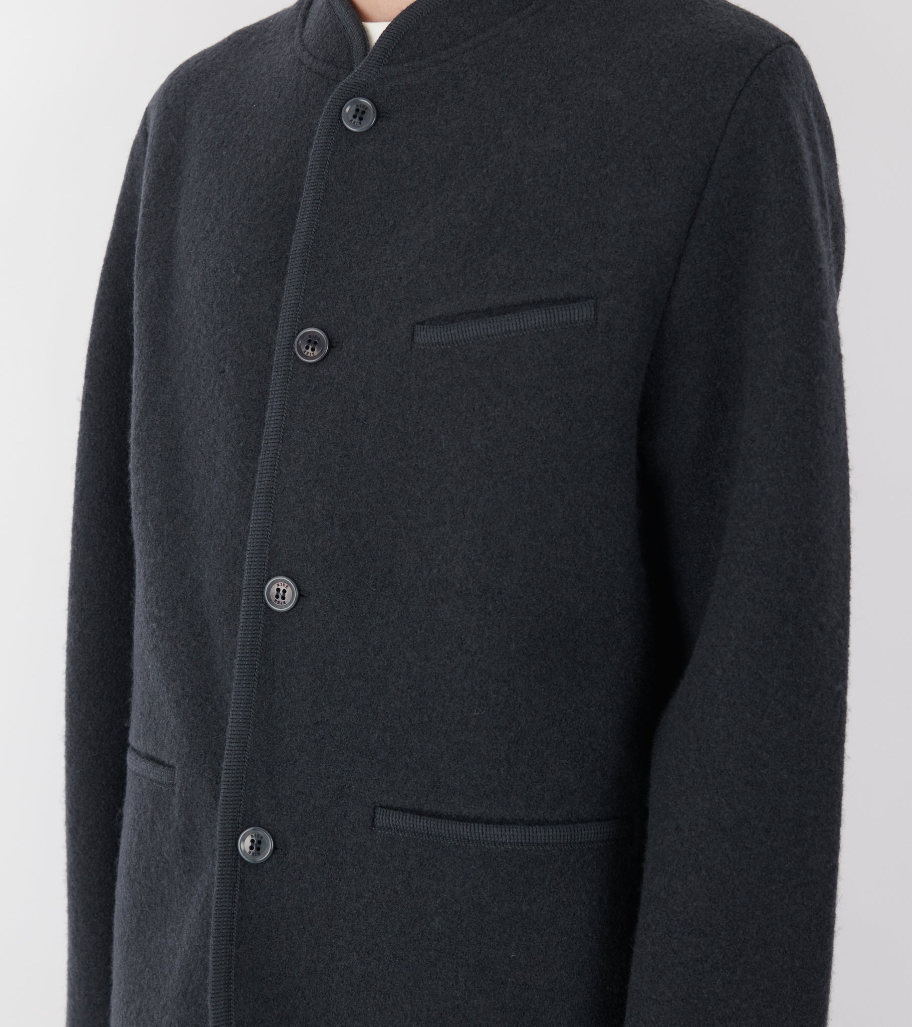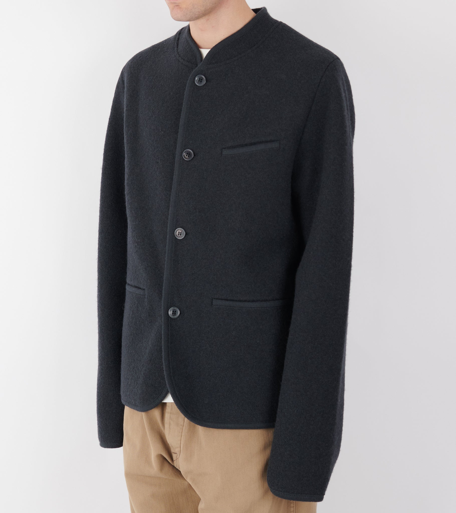 Mørk navy jakke i jomfru uld fra Rier. Jakken har vævede kontrastkanter, en knaplukning med logo-knapper samt tre lommer på fronten. Kvaliteten er som filt.