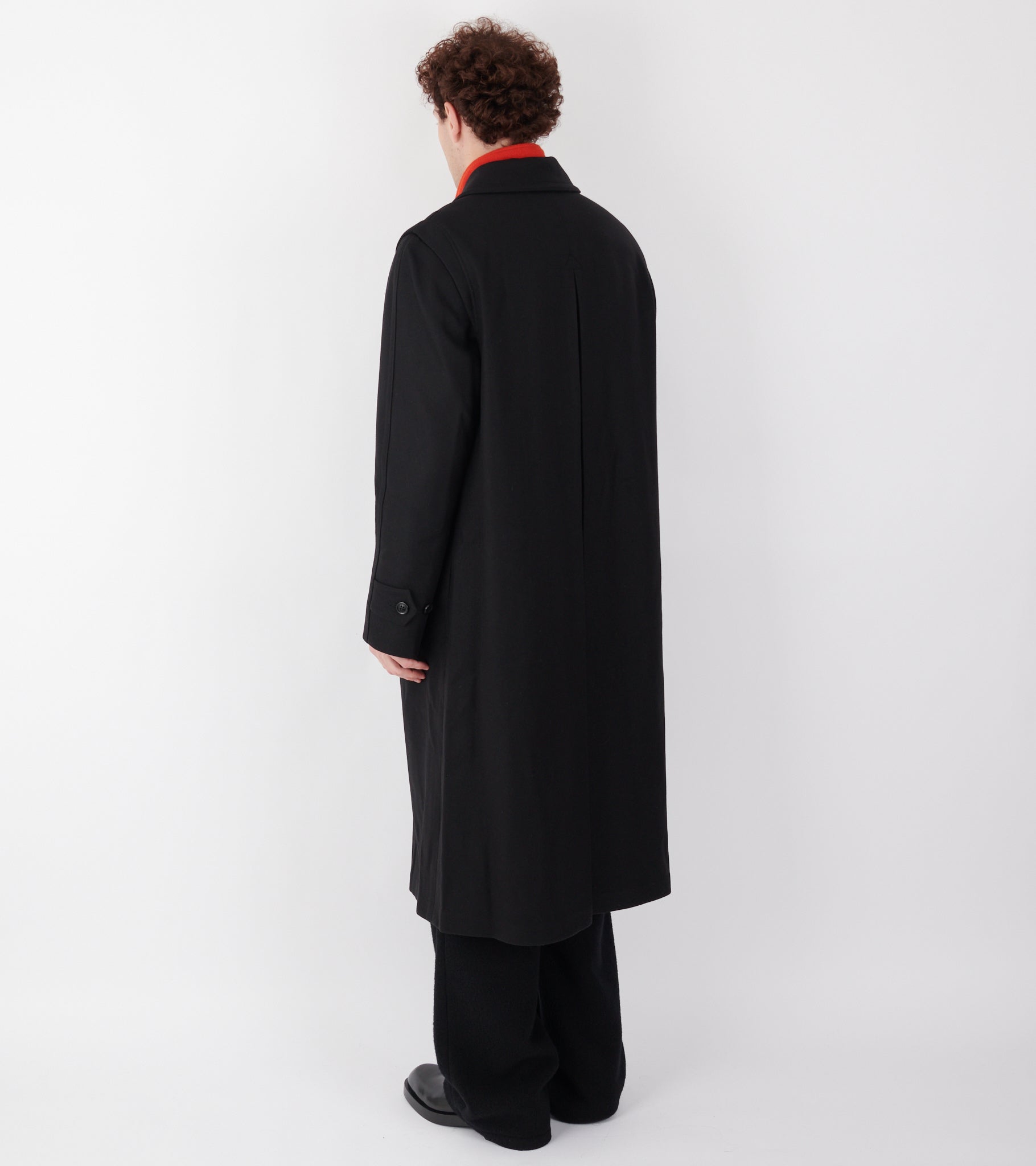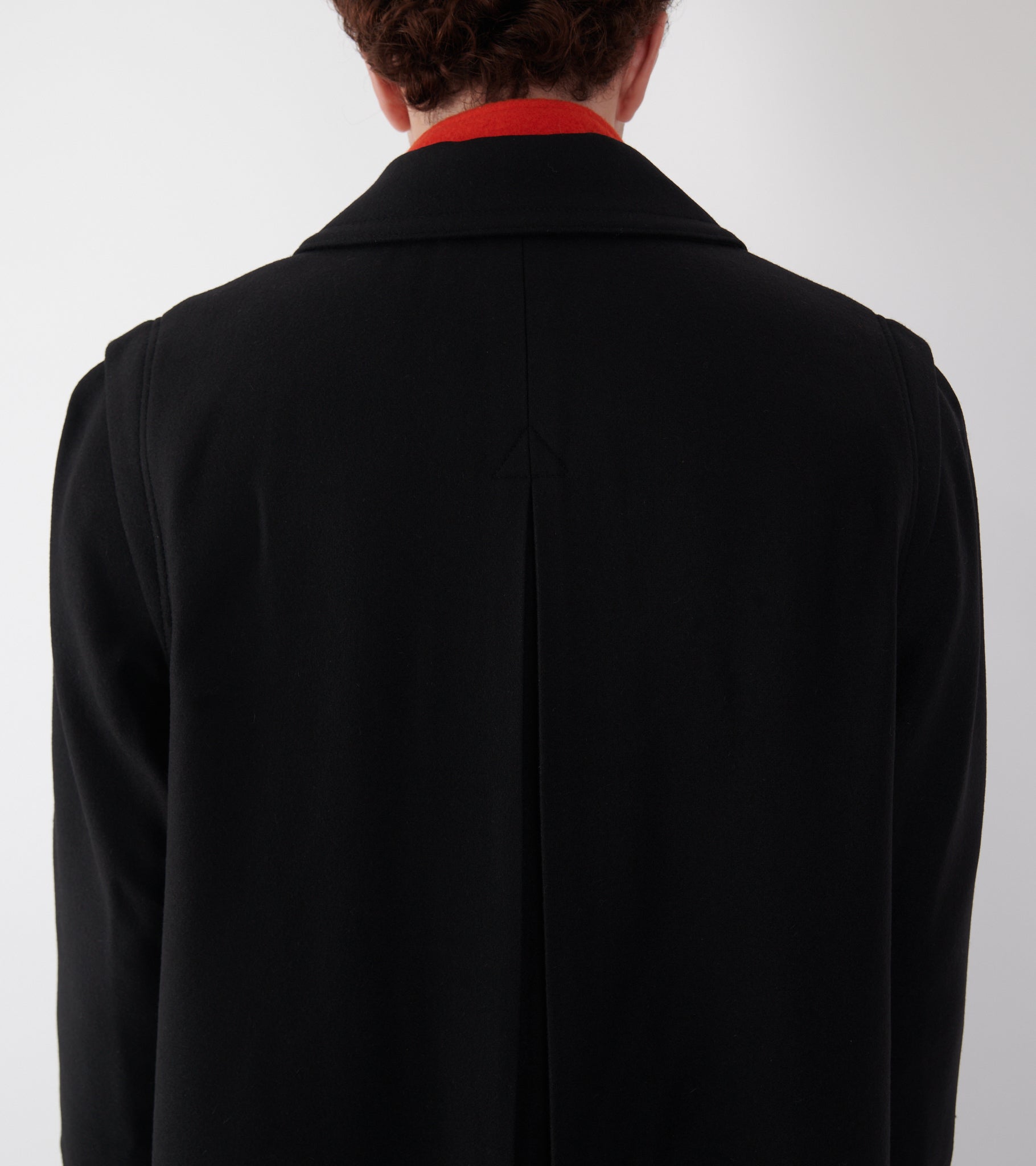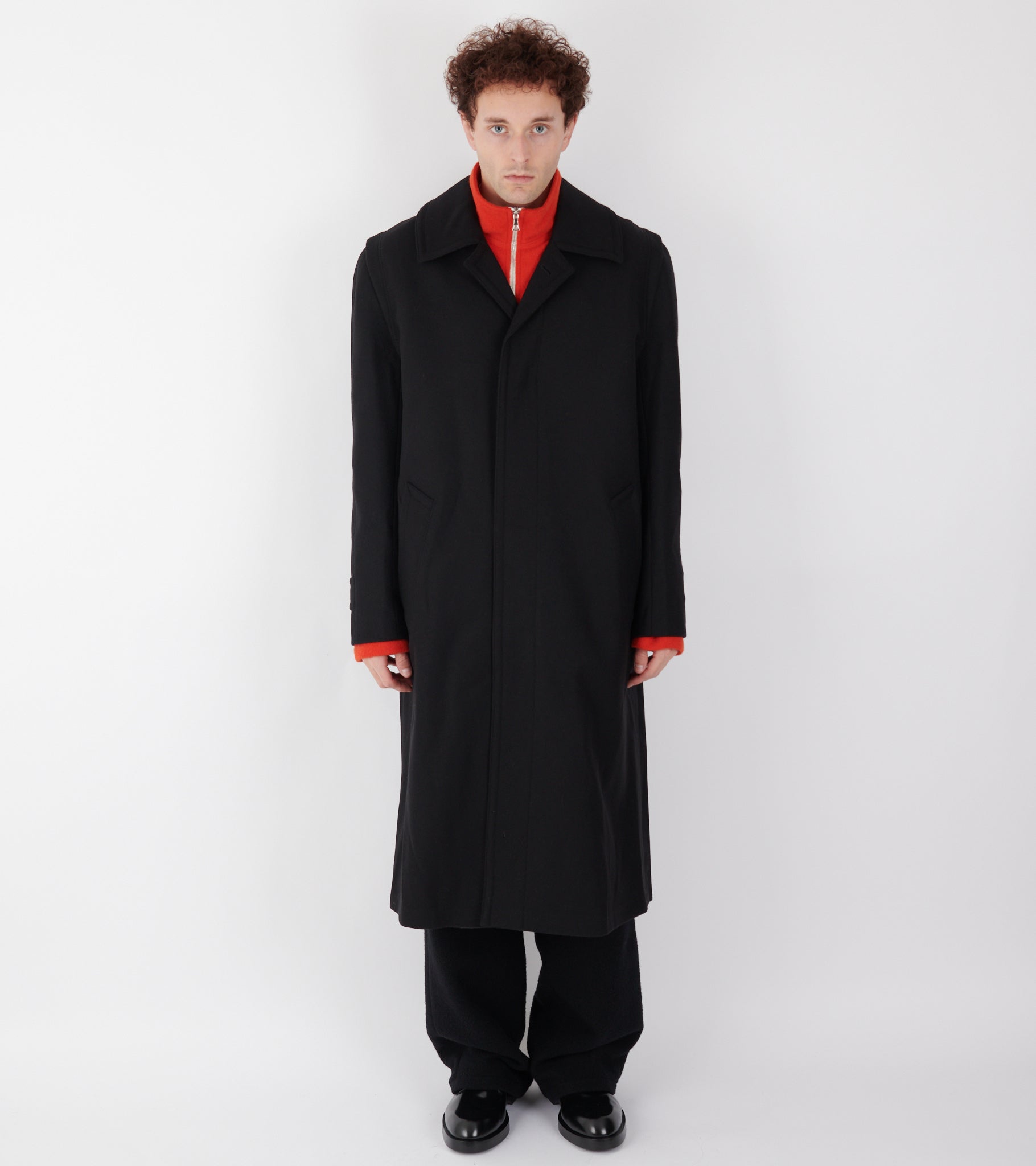 Sort frakke i jomfru uld fra Rier. Frakken har en klassisk krave, en skjult knaplukning med hornknapper på fronten, en slids bagpå samt en skrålomme i hver side. Ved kraven er en strop-detalje, så den kan lukkes helt op i halsen.