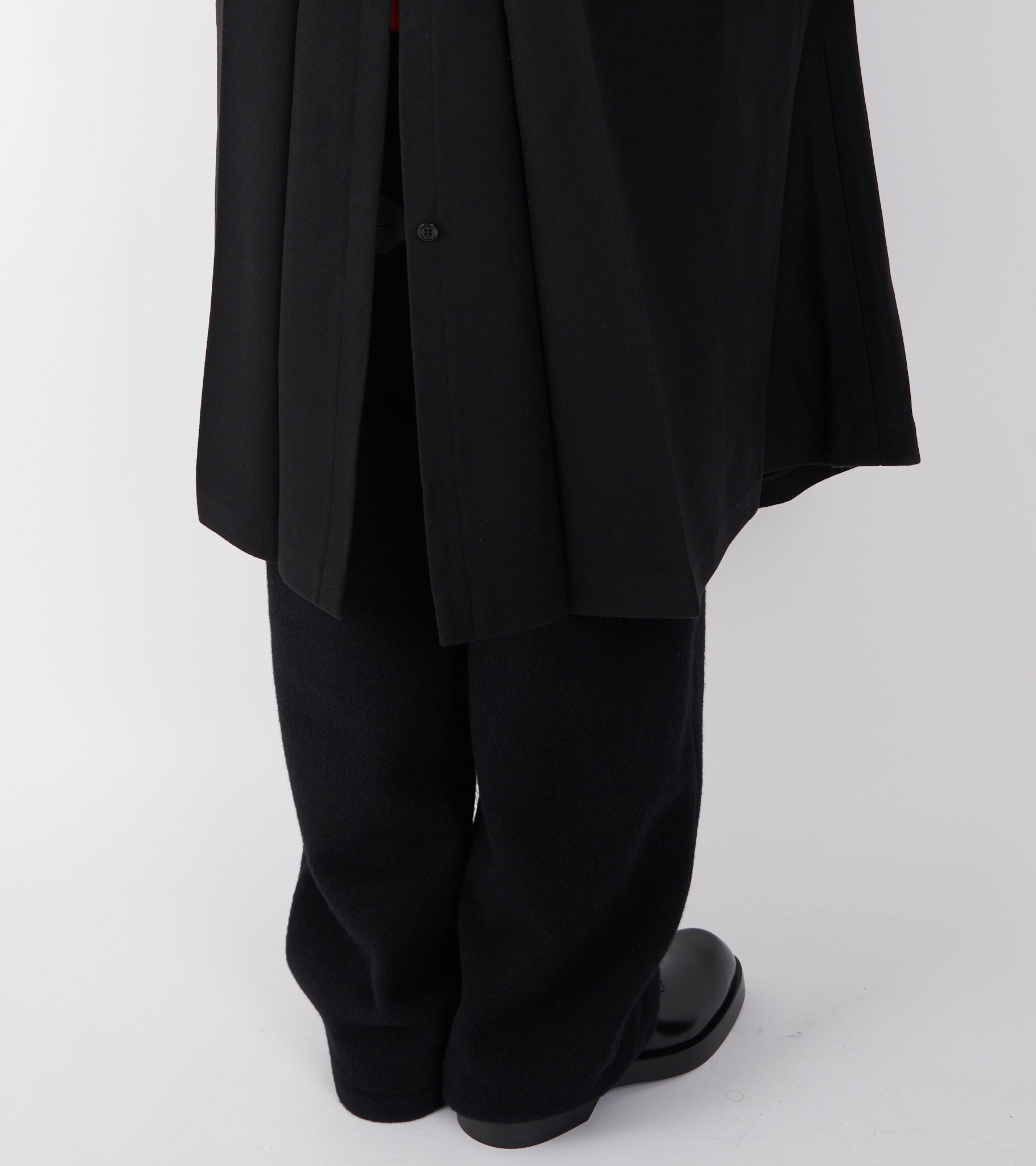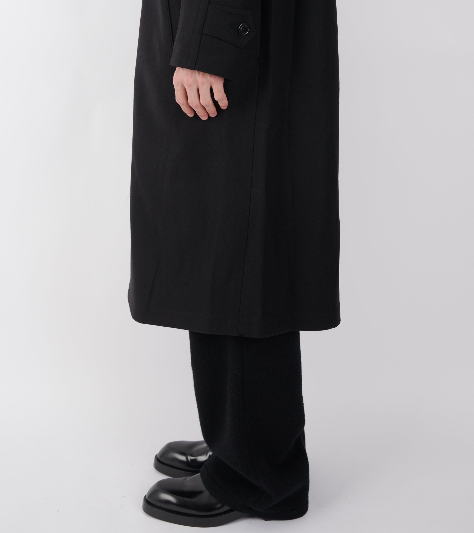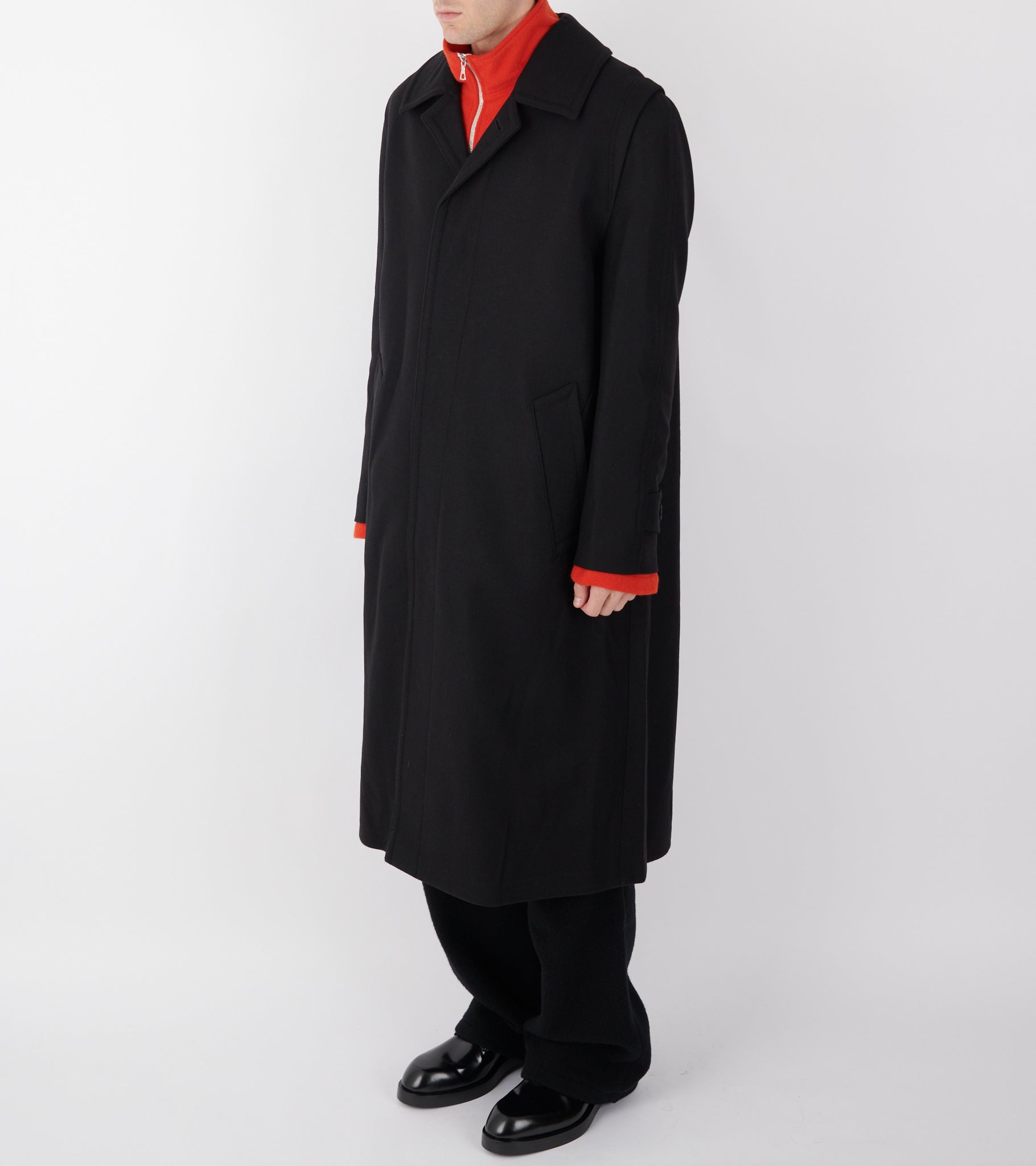 Sort frakke i jomfru uld fra Rier. Frakken har en klassisk krave, en skjult knaplukning med hornknapper på fronten, en slids bagpå samt en skrålomme i hver side. Ved kraven er en strop-detalje, så den kan lukkes helt op i halsen.