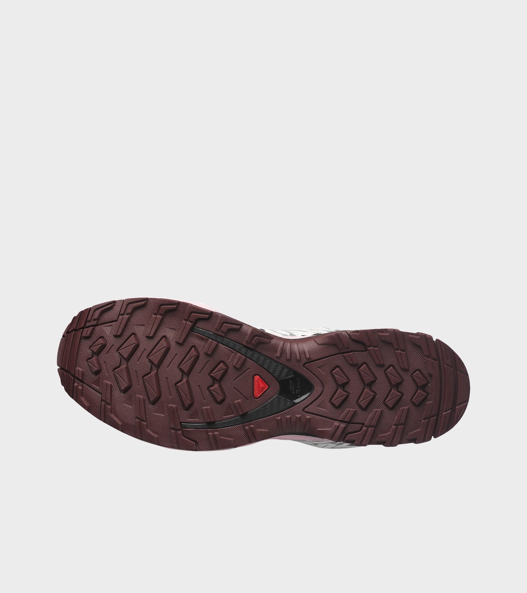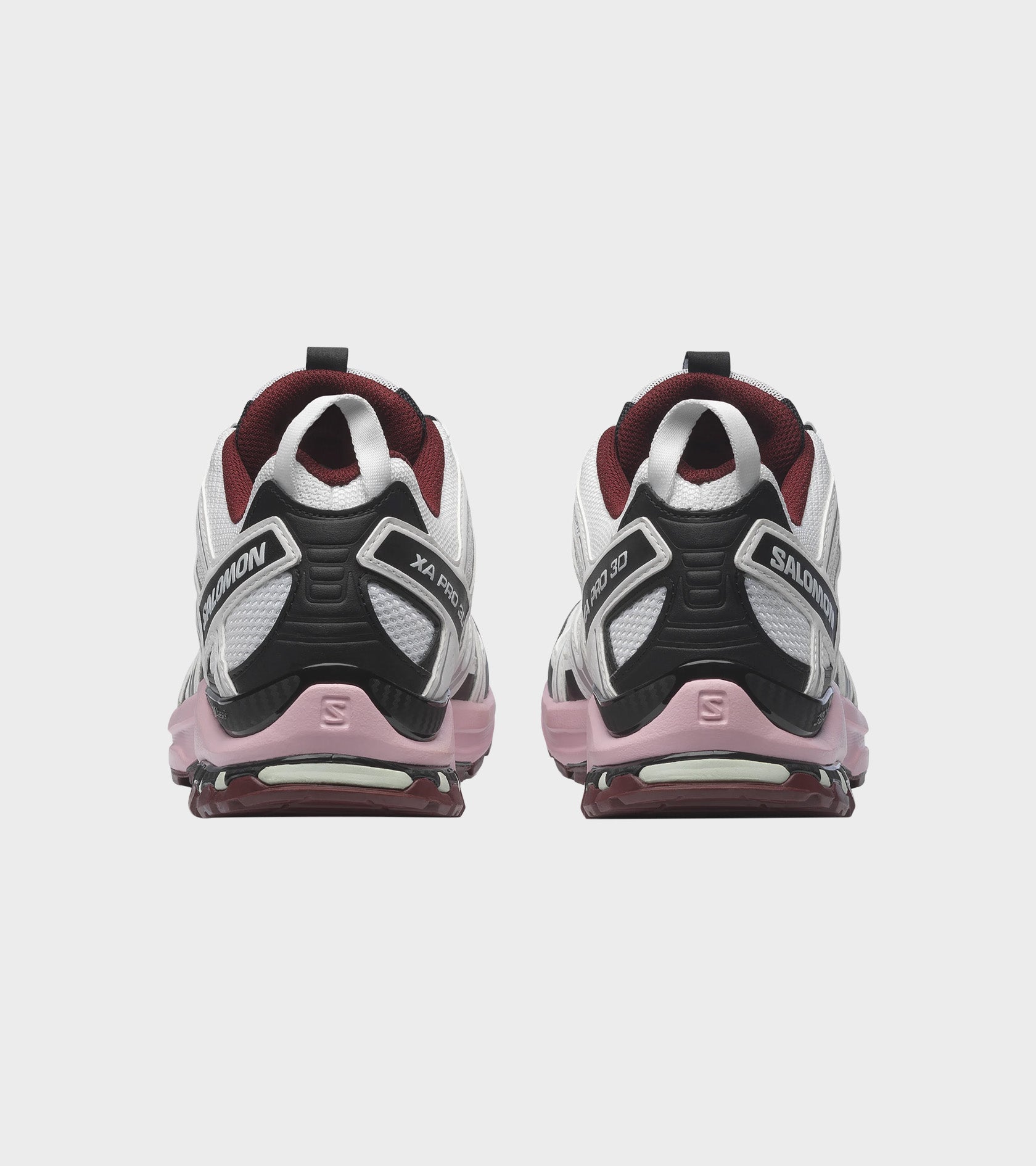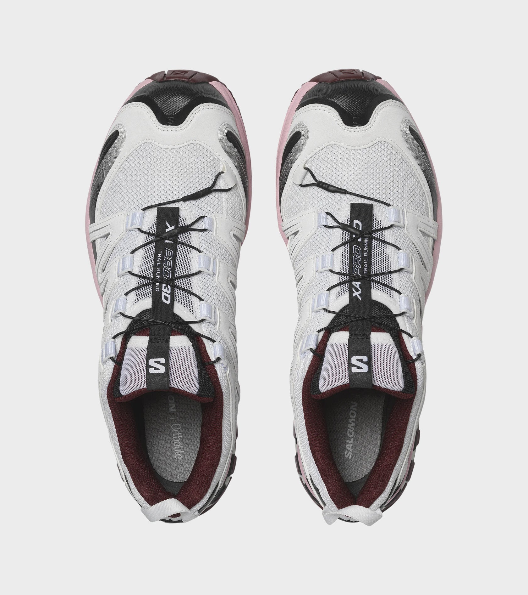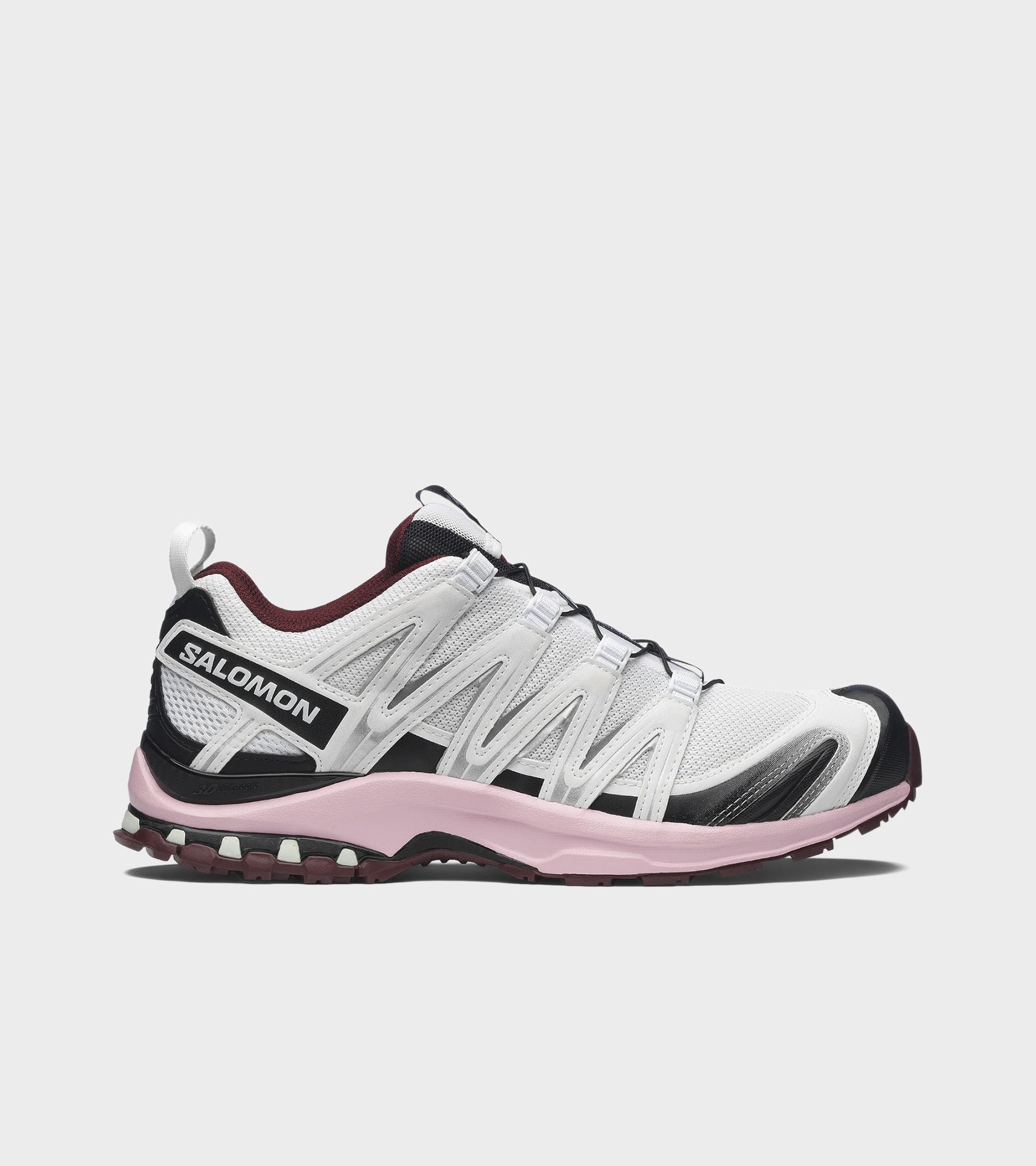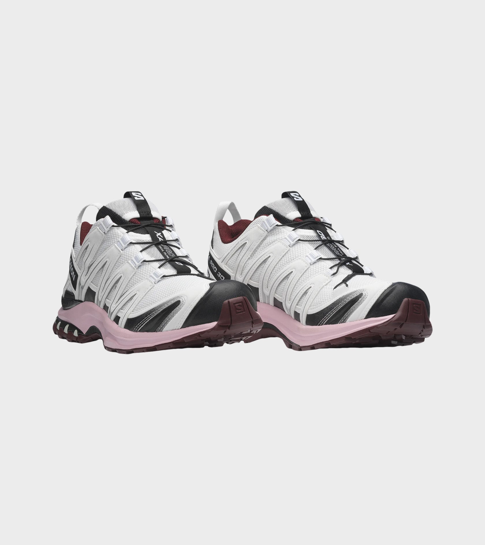 XA Pro 3D fra Salomon i en hvid version med sorte, lyserøde og burgundy detaljer. Disse sneakers har den ikoniske quicklace-lukning.