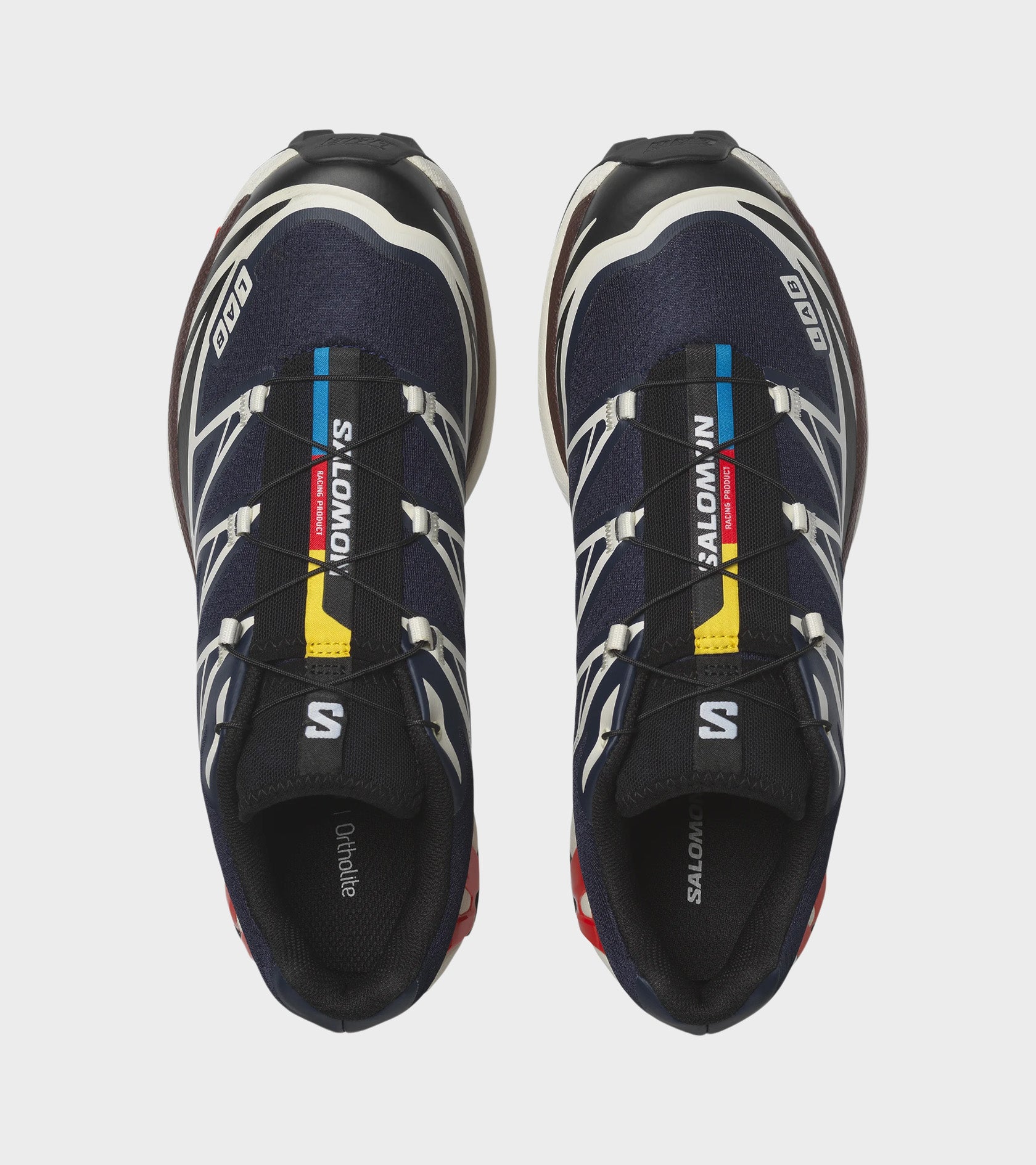 XT-6 fra Salomon i en mørk navy nuance med detaljer i rød og brun. Disse sneakers har de klassiske Salomon-detaljer, som quicklace-lukningen og logoet ned langs toppen.