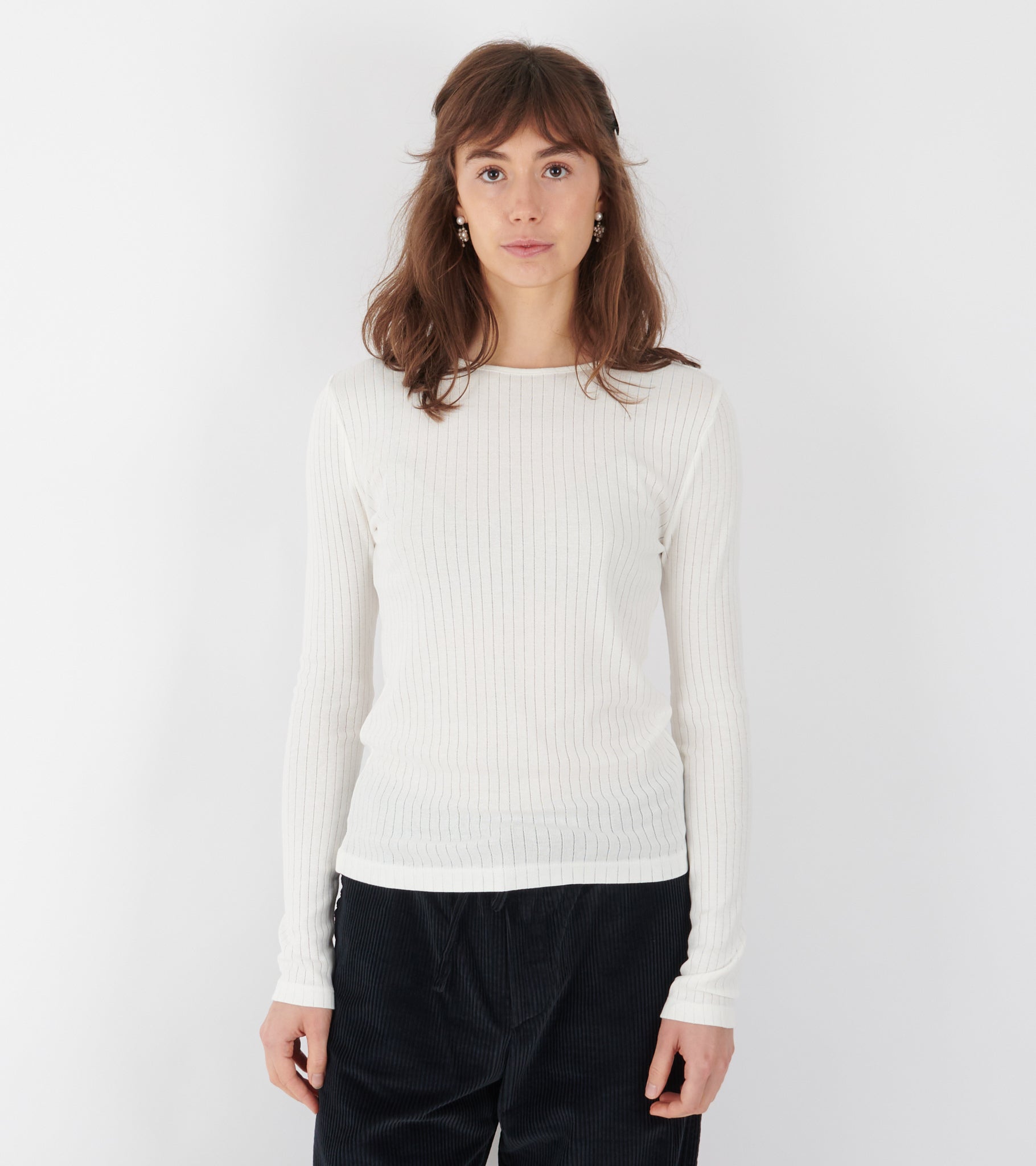 Hvid langærmet t-shirt i ribstrikket økologisk bomuldsjersey fra Skall Studio.