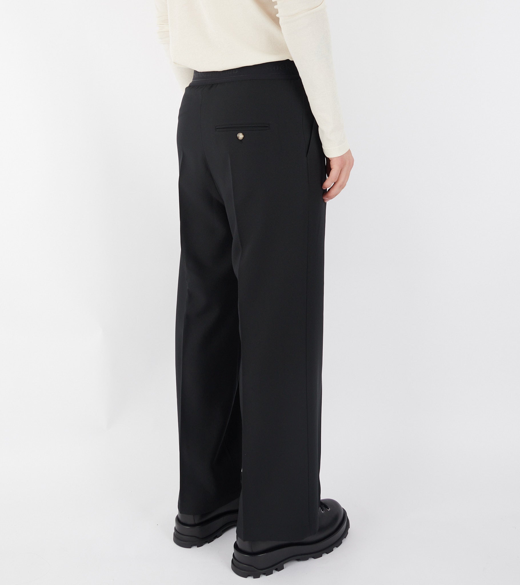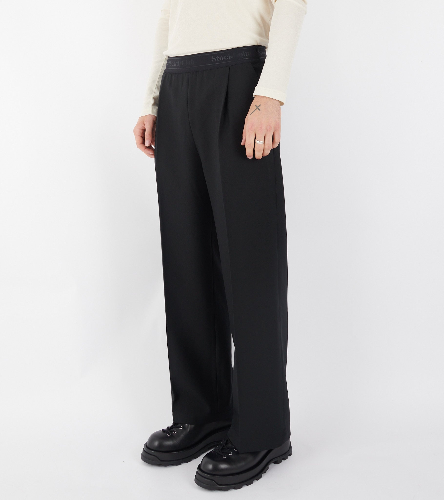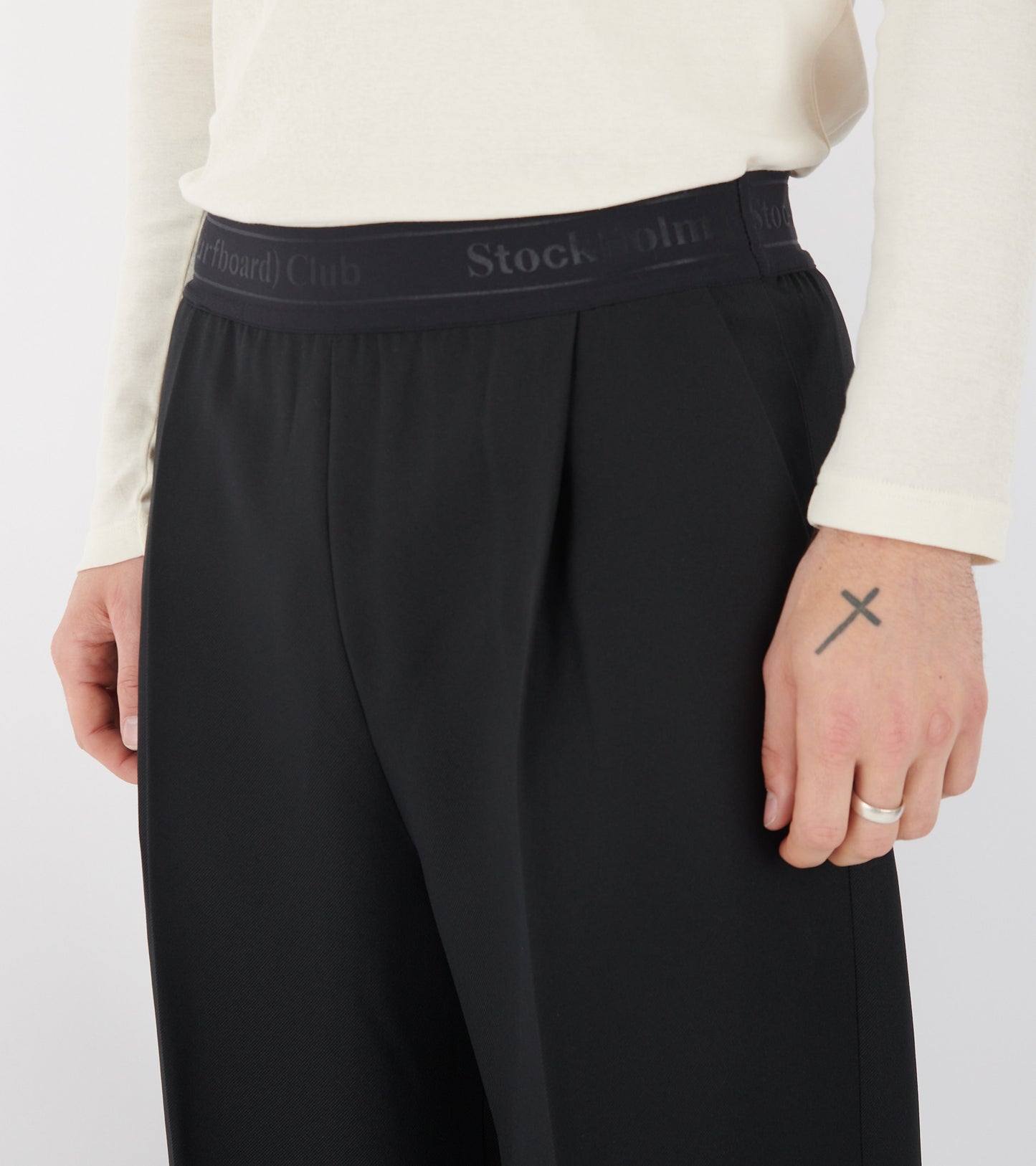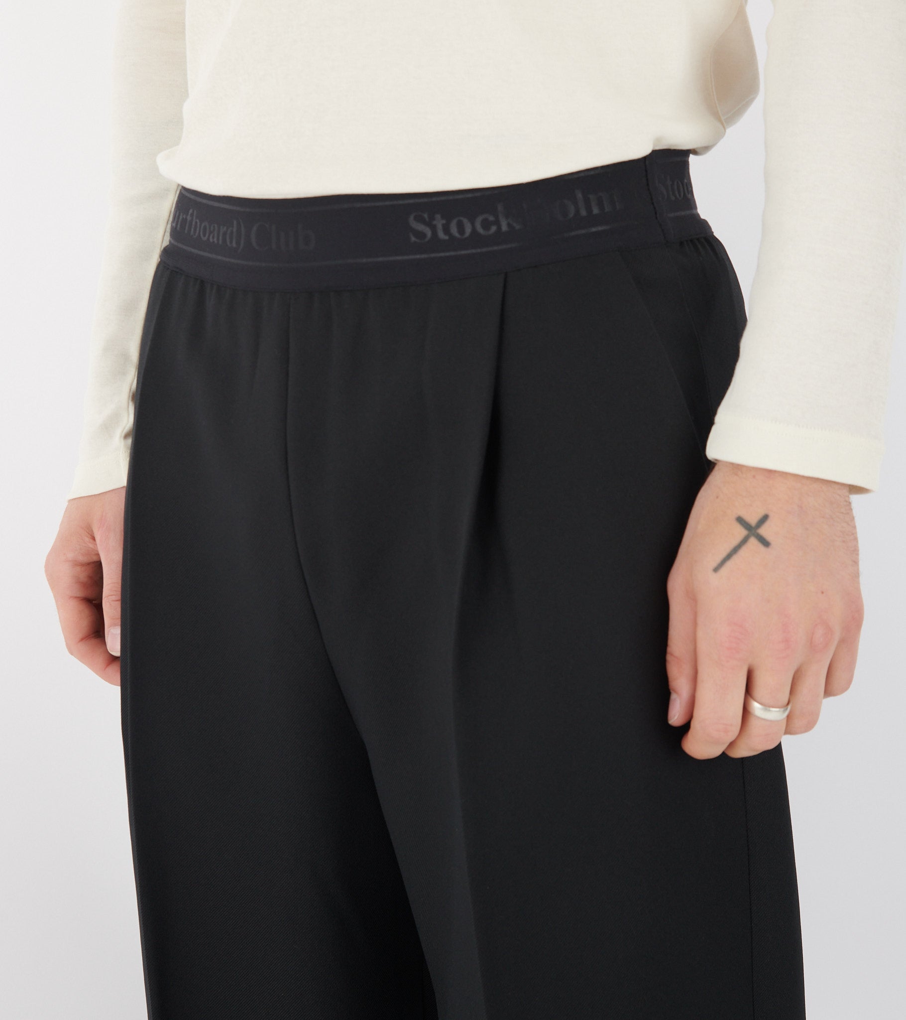 Sorte bukser fra Stockholm (Surfboard) Club. Bukserne har en bred elastikkant med logoskift, pressefolder, en skrålomme i hver side samt én lomme bagpå.
