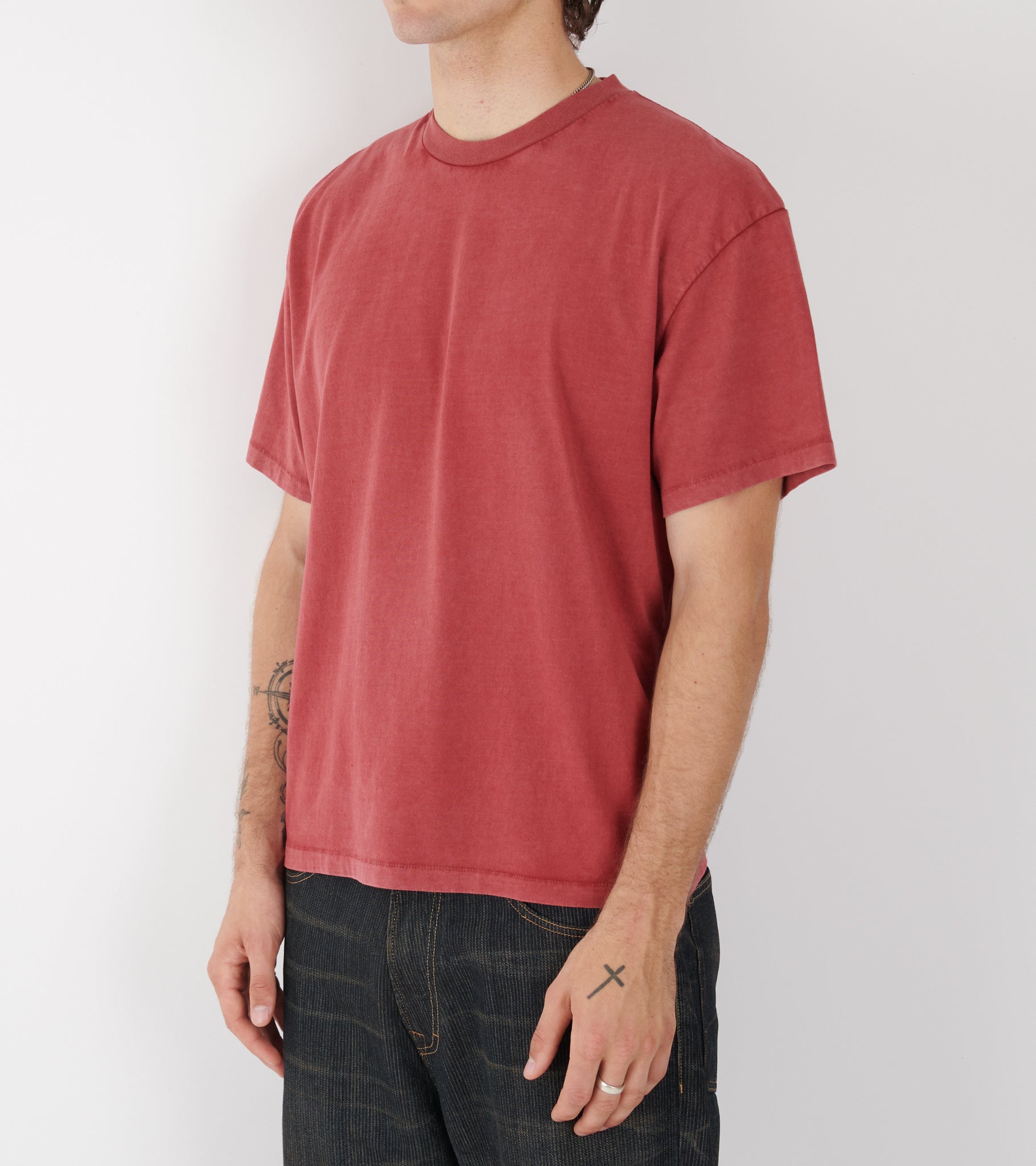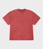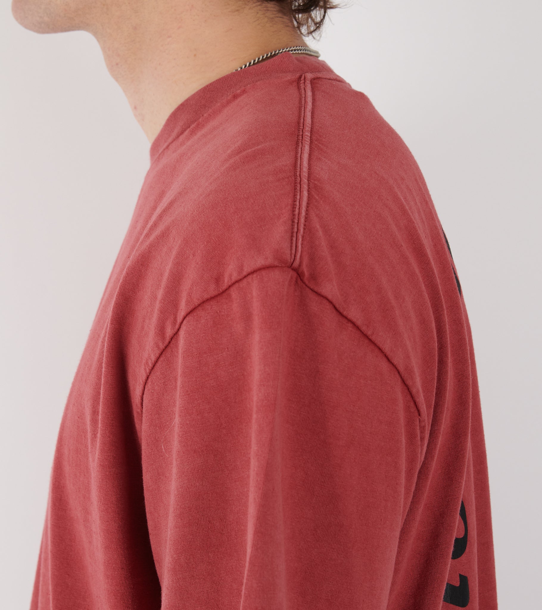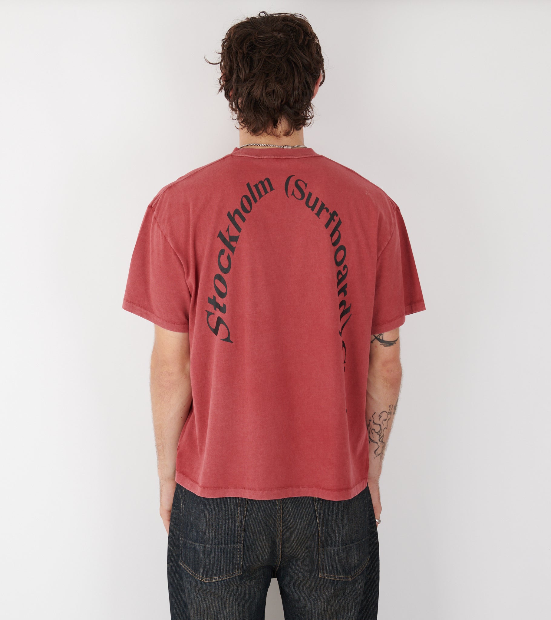 Rød t-shirt i genanvendt bomuld fra Stockholm (Surfboard) Club. Denne t-shirt er produceret i Portugal og har et stort sort logo printet på ryggen.