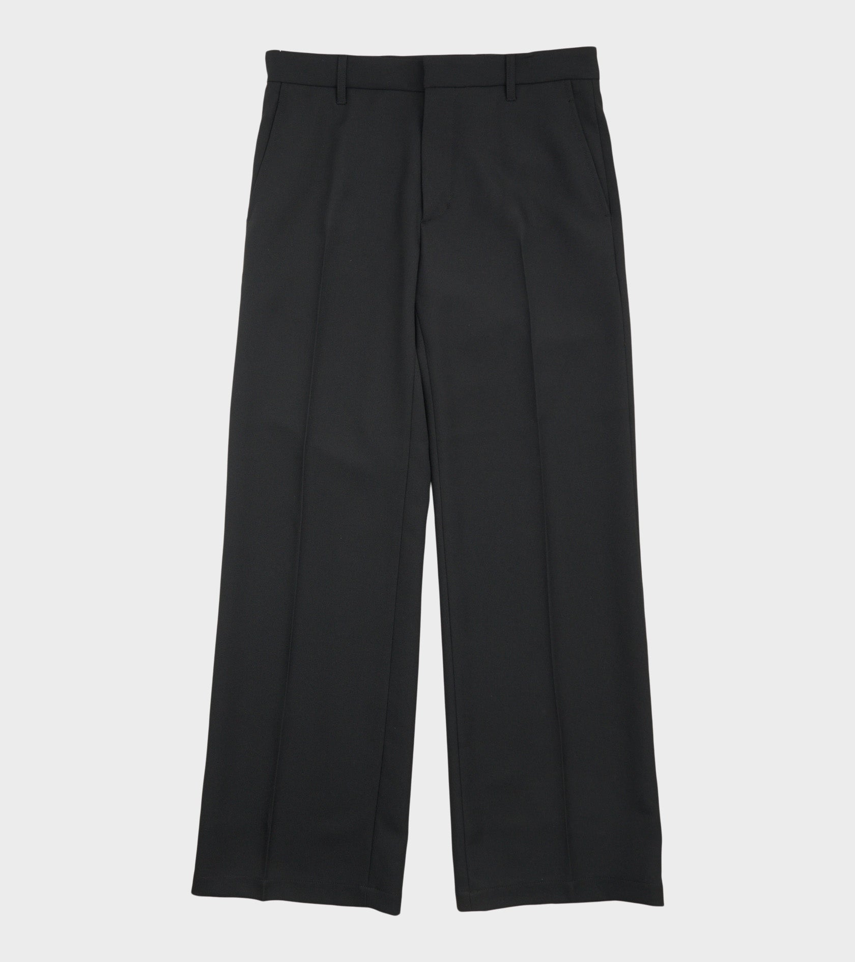 Sorte bukser fra Stockholm (Surfboard) Club. Sune Tailored Bootcut Trousers har bæltestropper, pressefolder og en skrålomme i hver side. Bagpå er to stiklommer samt et lille logotag.