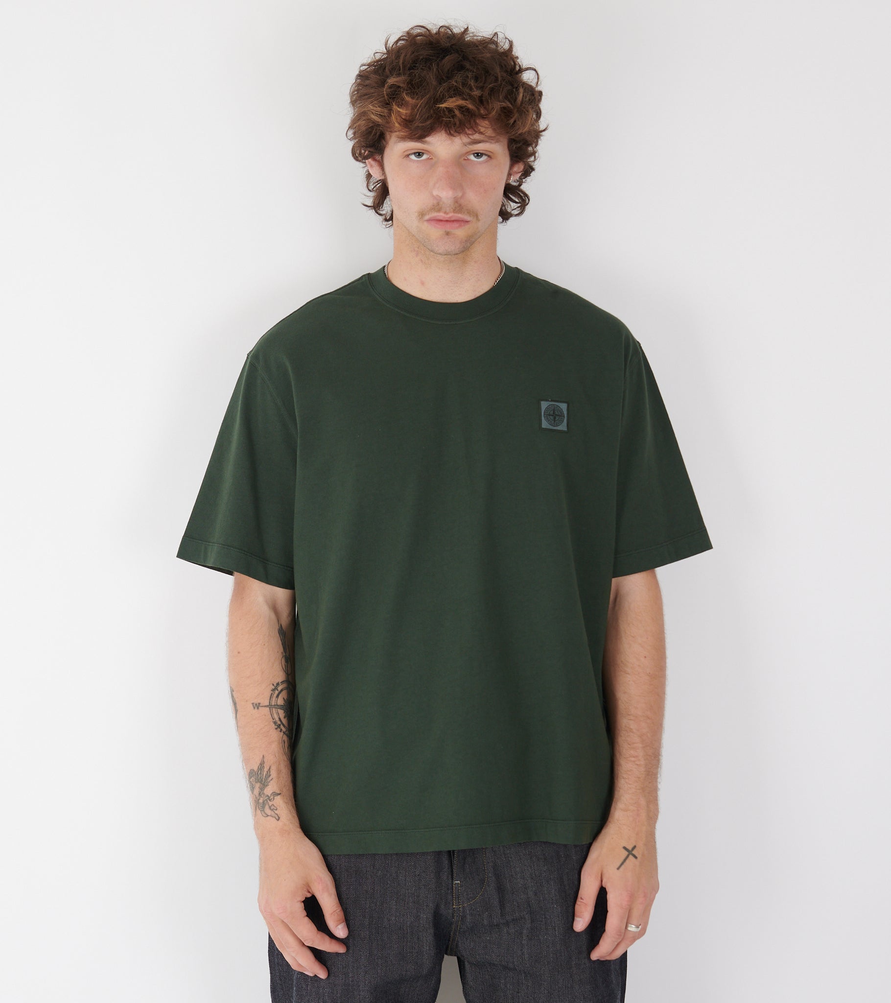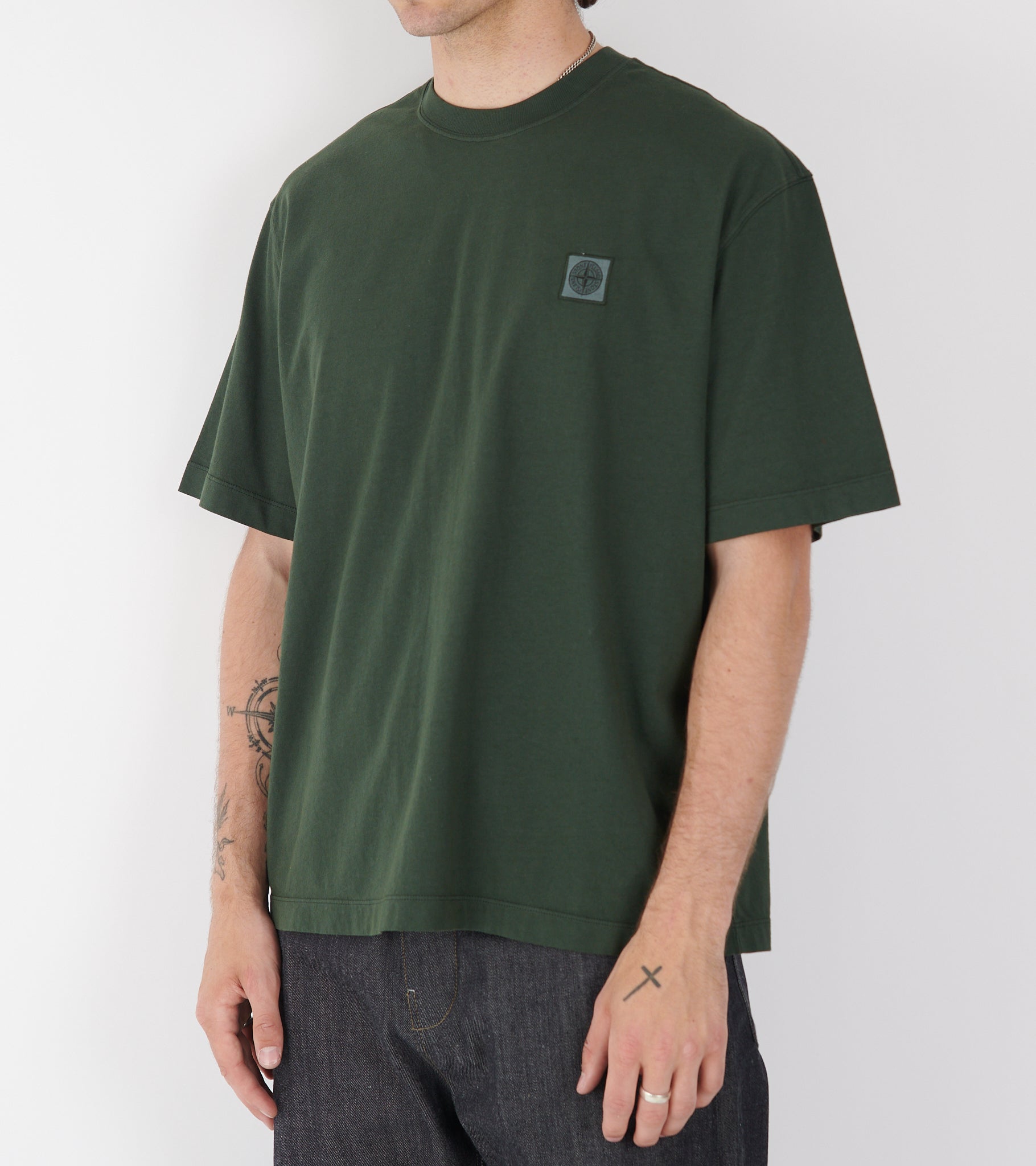 Mørkegrøn boxy t-shirt med logo ved venstre bryst fra Stone Island.