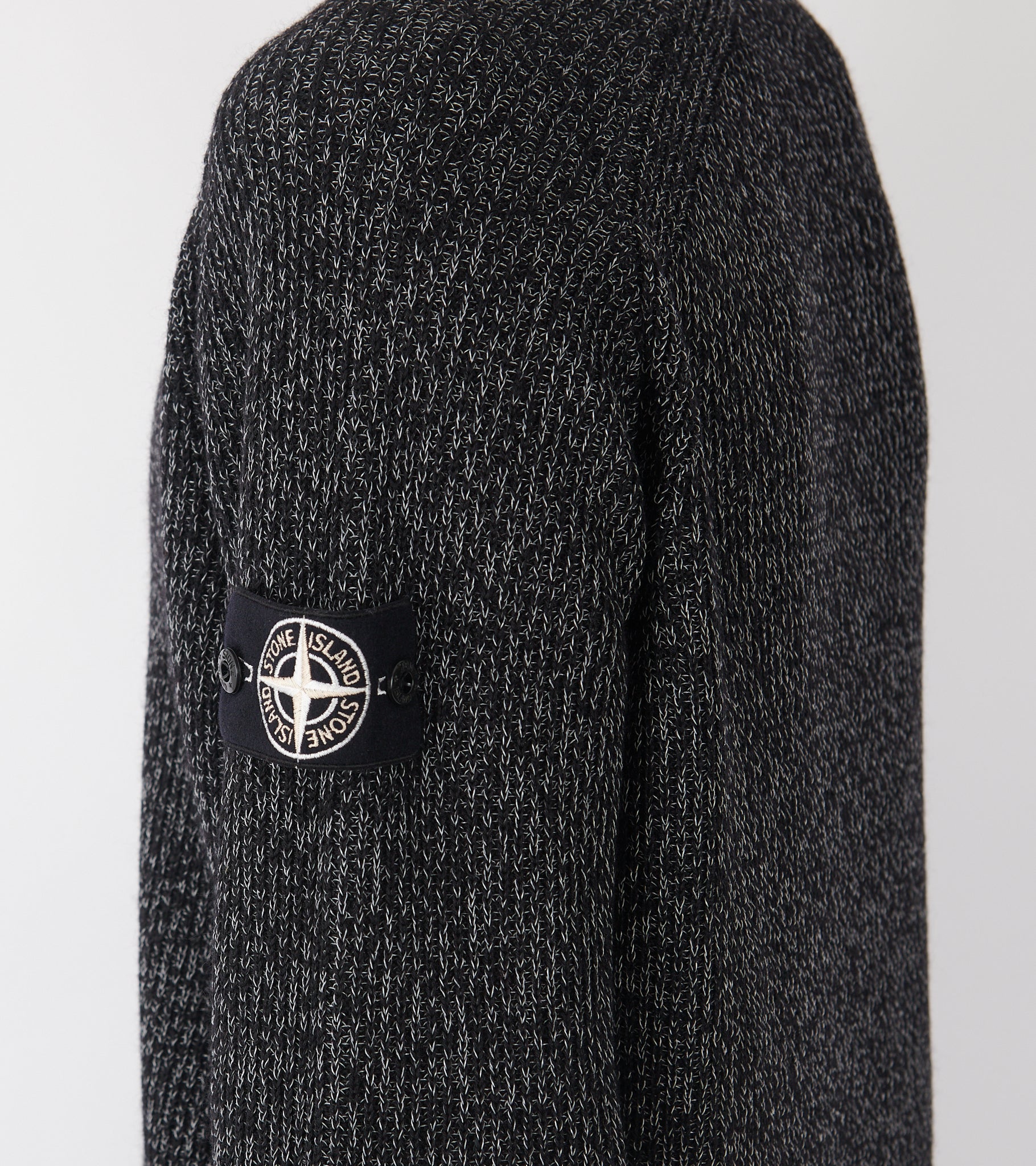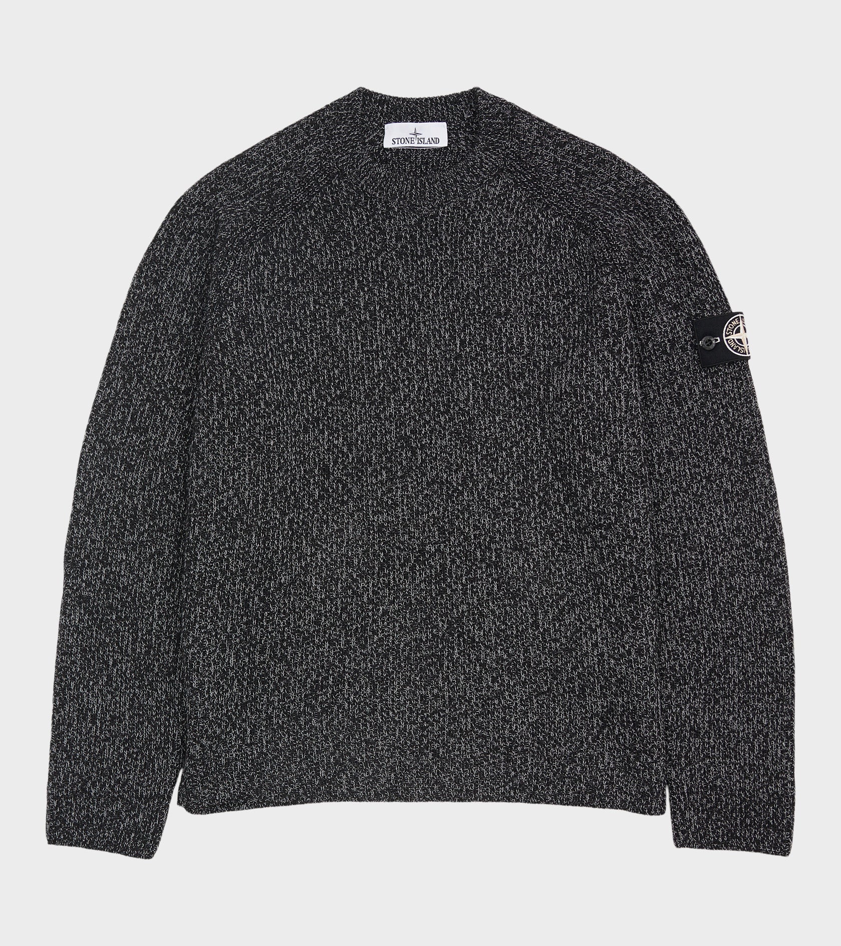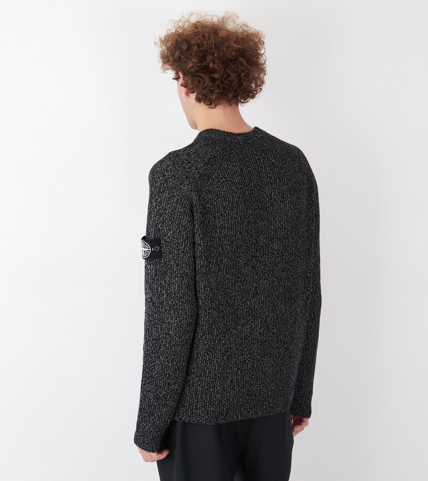 Sort meleret strik fra Stone Island. På venstre ærme er det ikoniske Stone Patch. Strikken er fremstillet i en blanding af polyester, hør og uld med en 'reflective' coating, skabt gennem et harpiksbad, der indeholder tusindvis af glas-mikrokugler, som reflekterer lys.