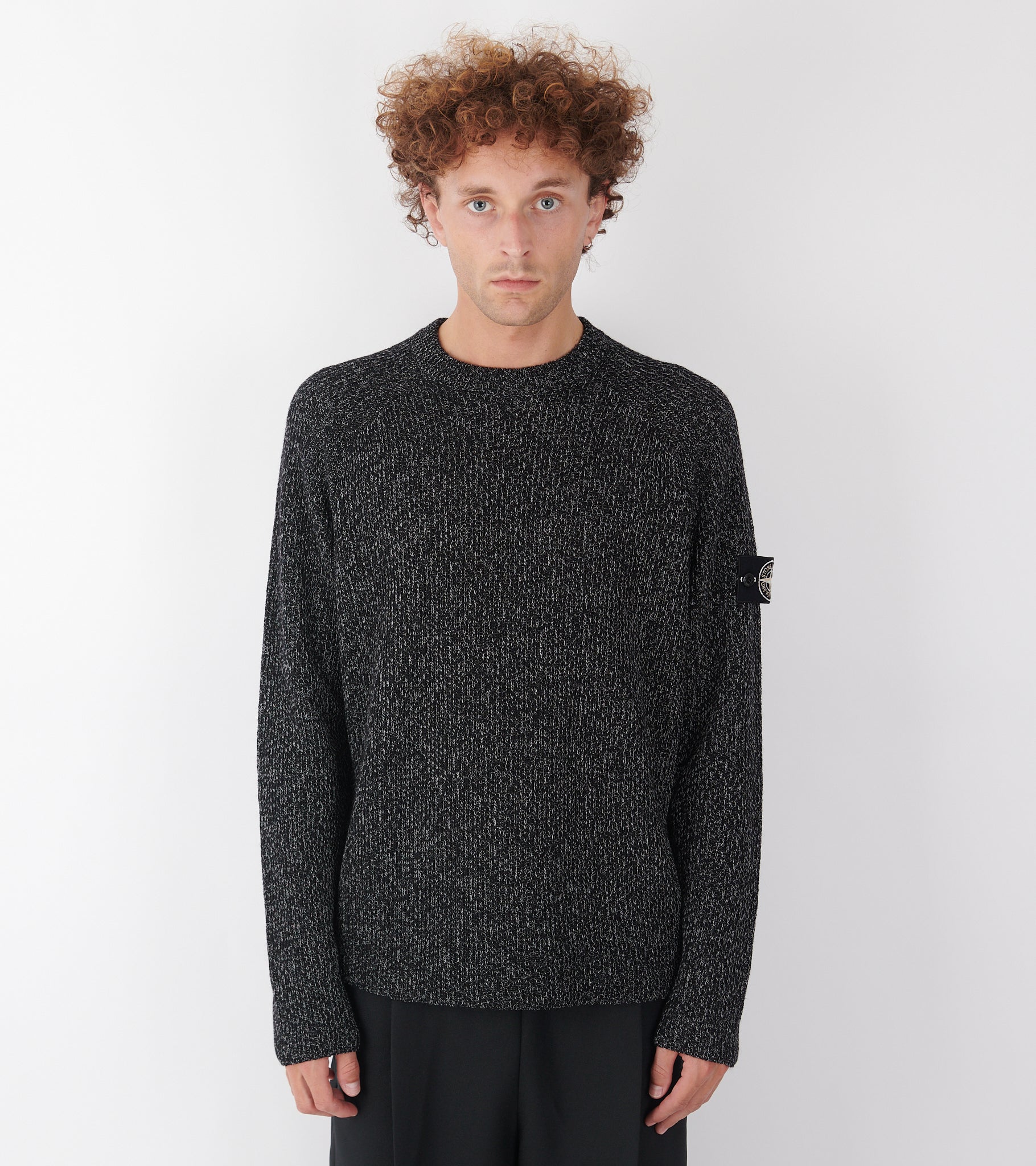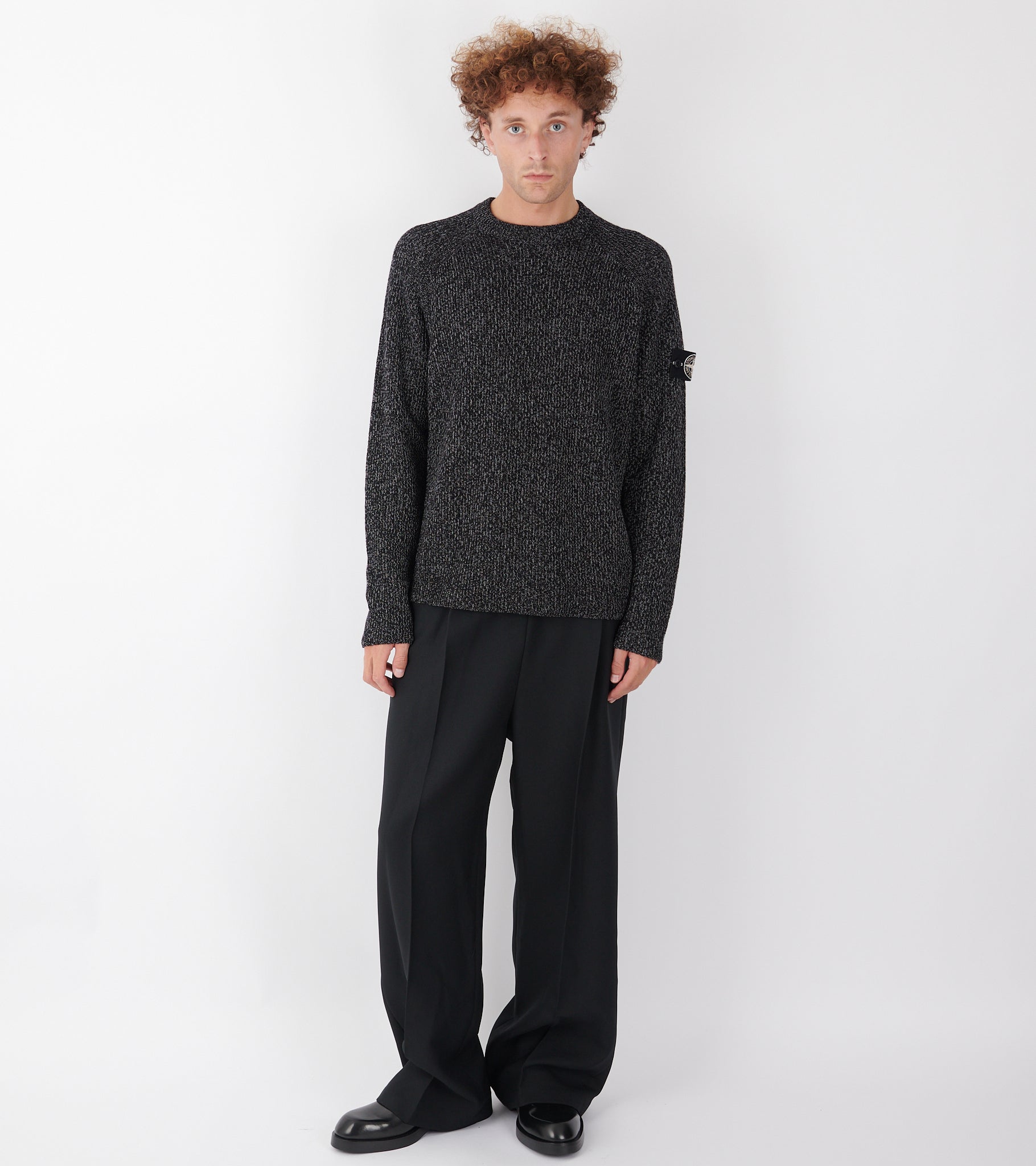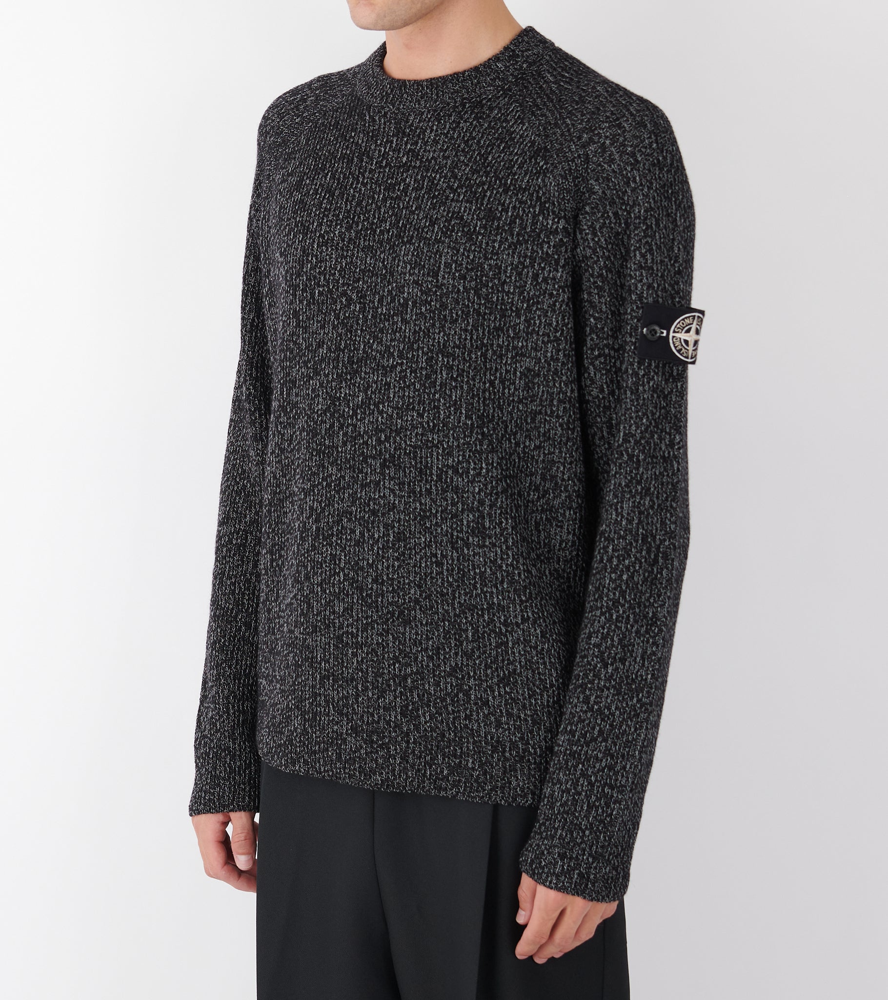 Sort meleret strik fra Stone Island. På venstre ærme er det ikoniske Stone Patch. Strikken er fremstillet i en blanding af polyester, hør og uld med en 'reflective' coating, skabt gennem et harpiksbad, der indeholder tusindvis af glas-mikrokugler, som reflekterer lys.