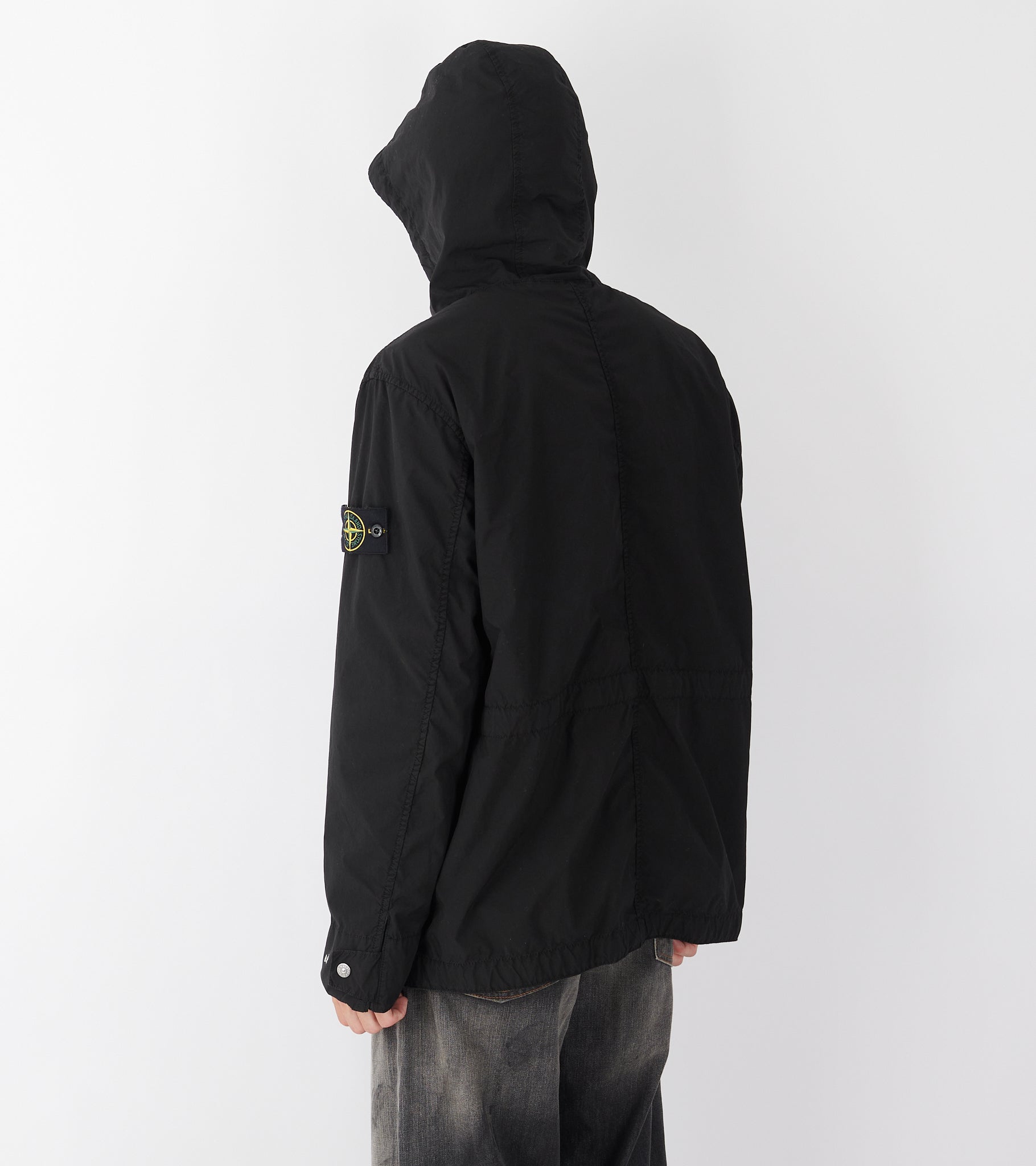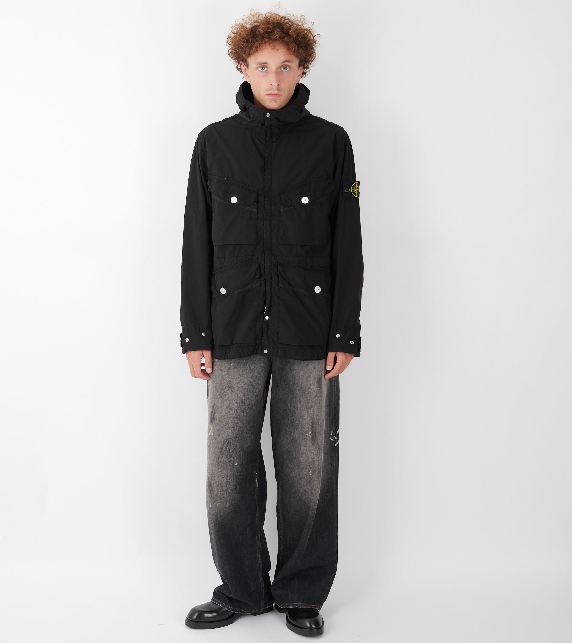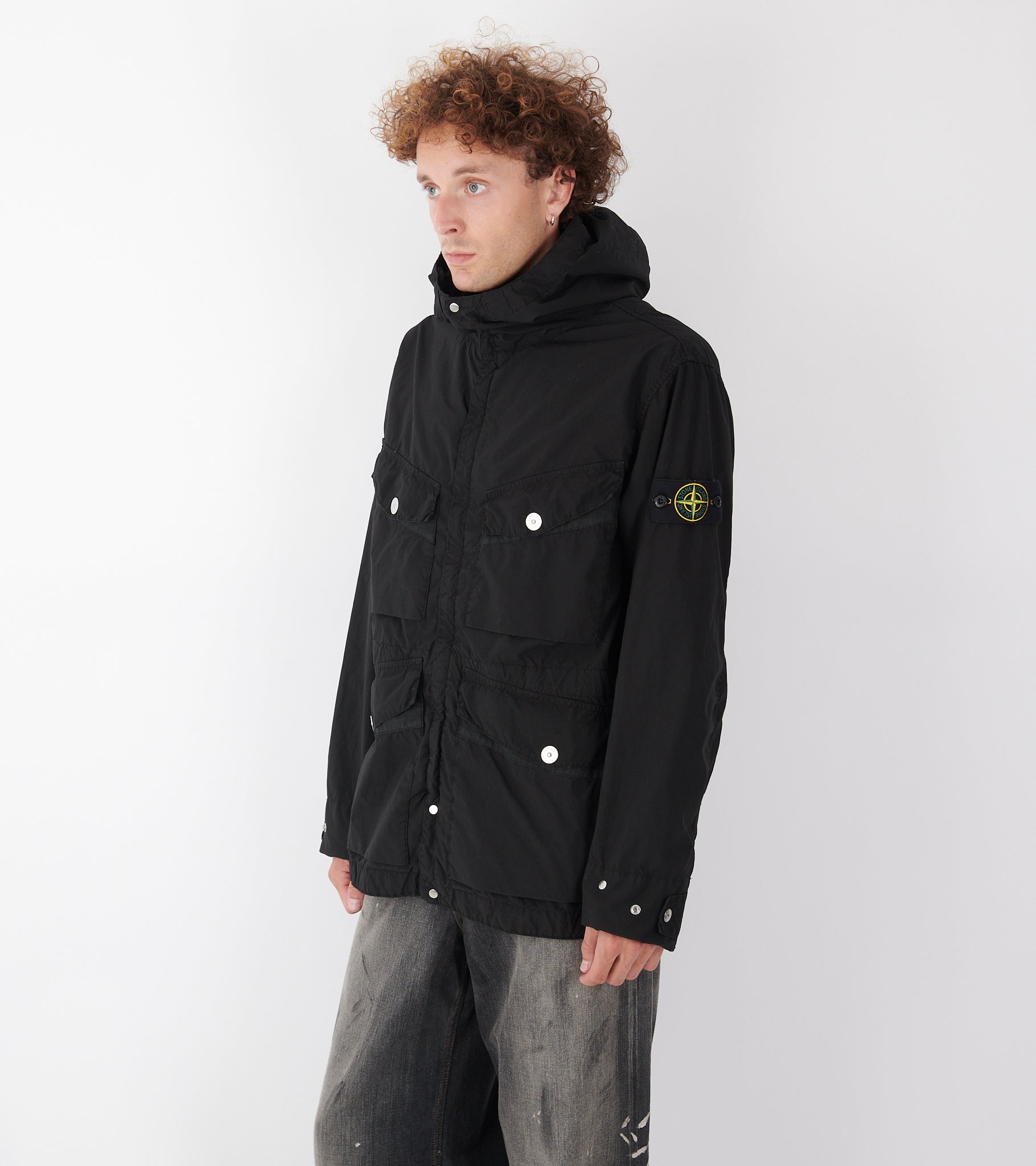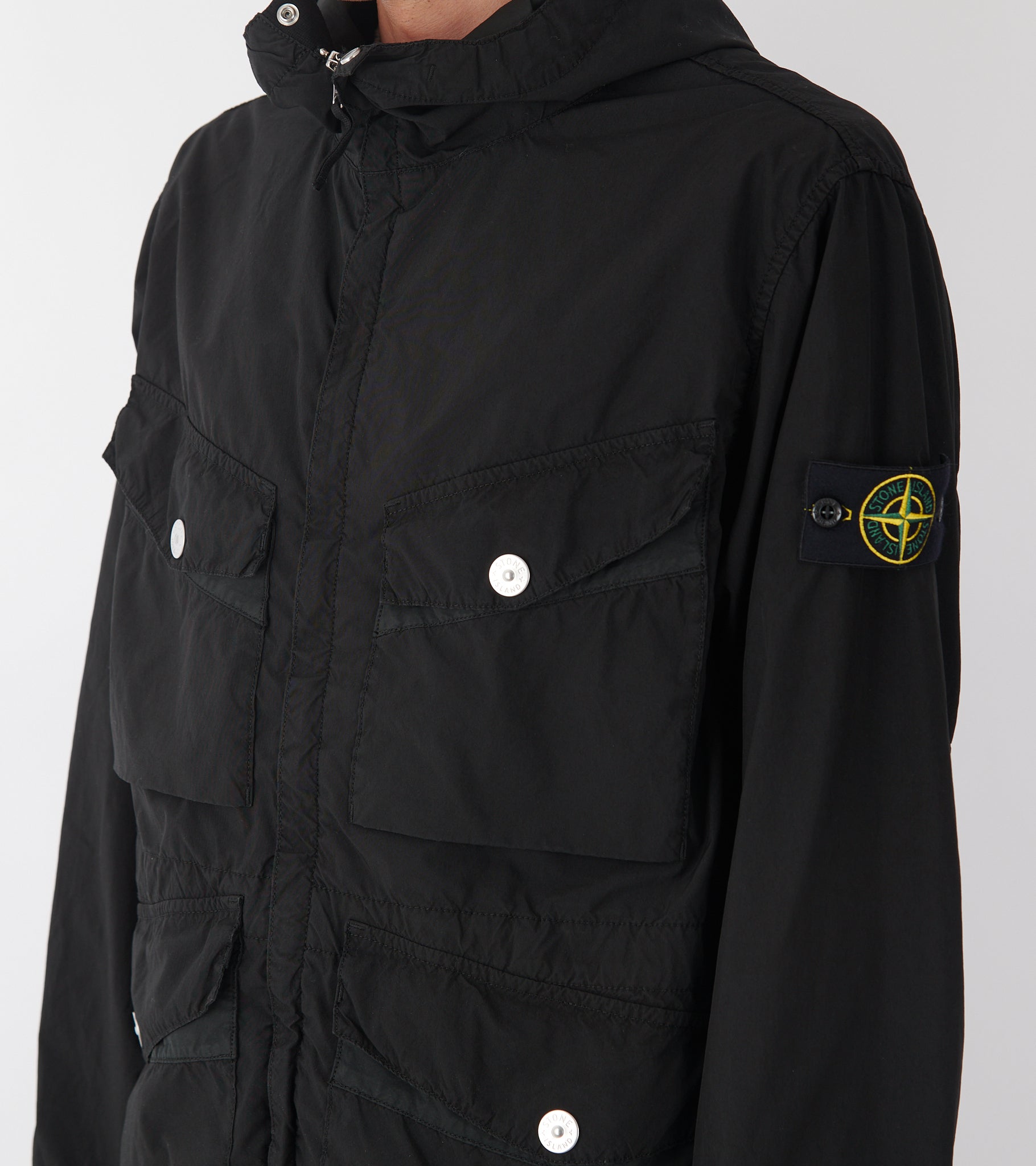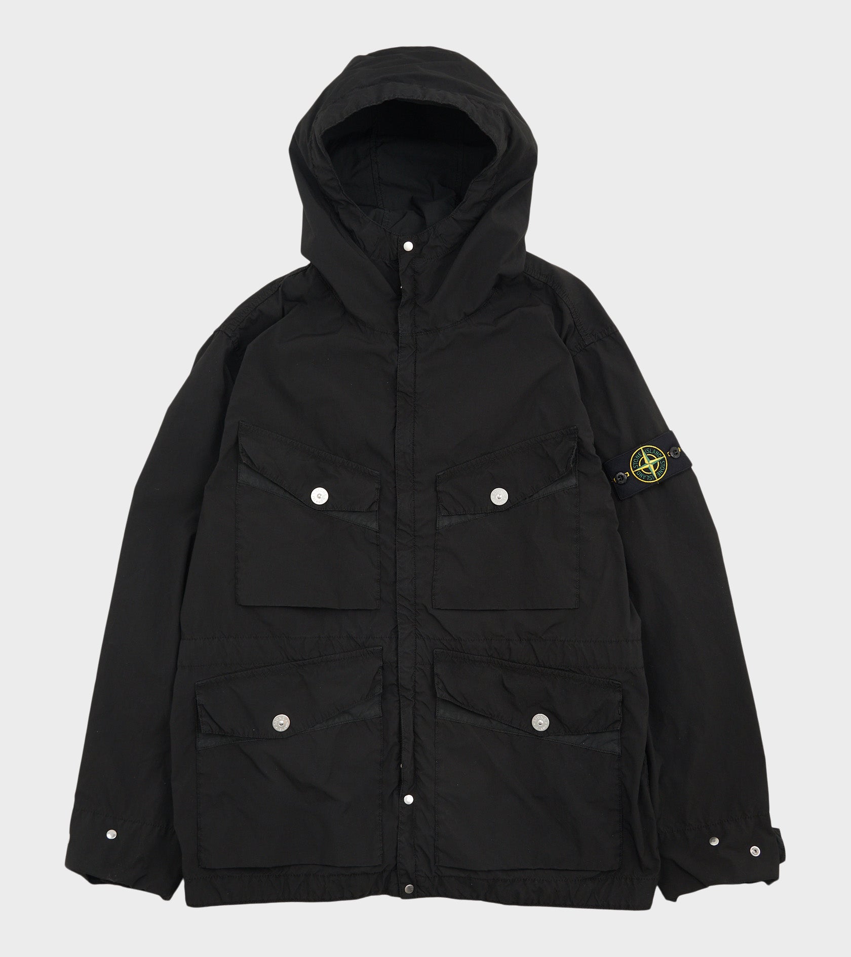 Sort jakke med hætte fra Stone Island. Jakken har en skjult dobbeltgående lynlåslukning og fire lommer på fronten. På venstre ærme er det ikoniske Stone Patch.