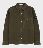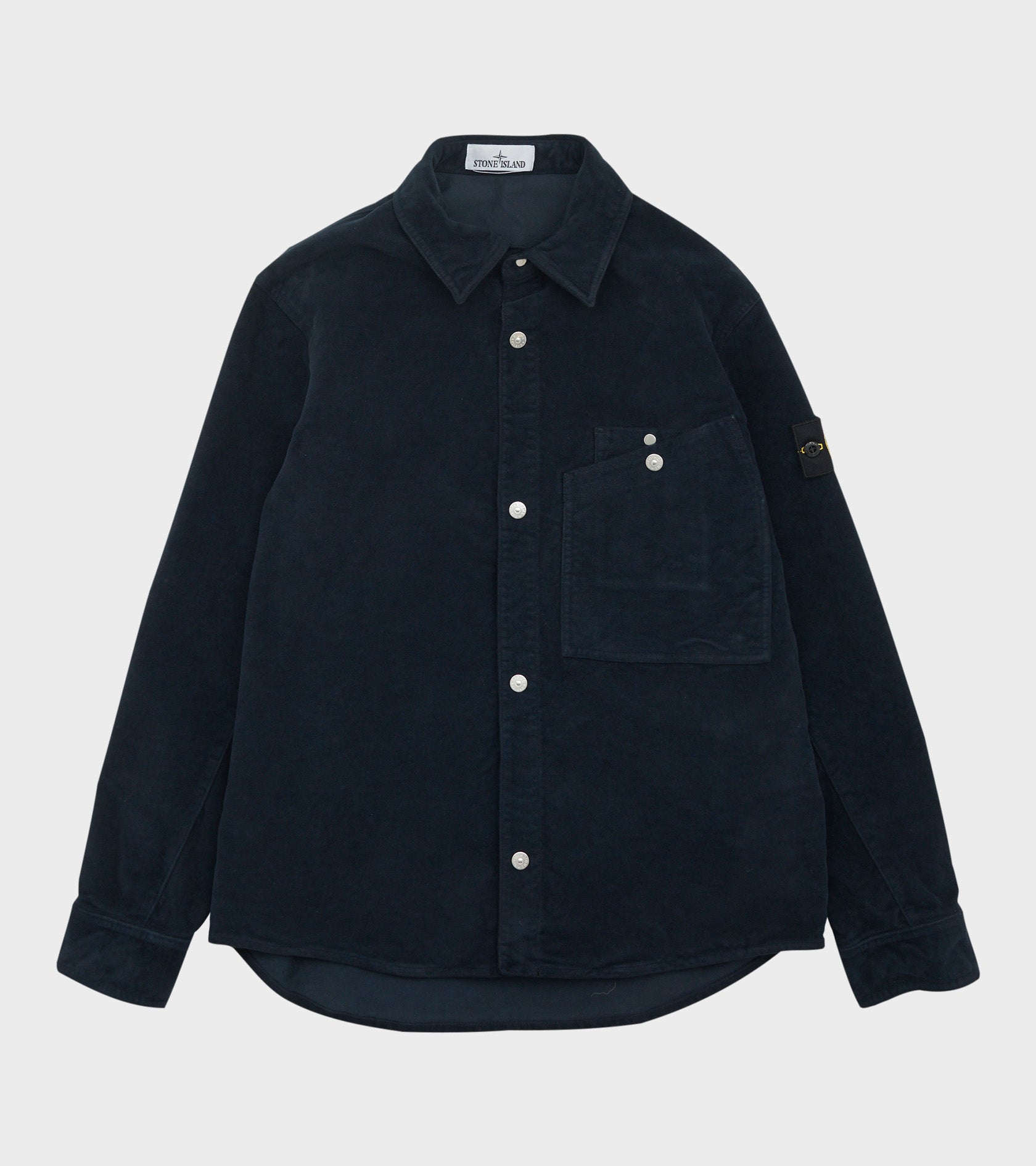 Mørk navy overshirt i en blød bomuldskvalitet fra Stone Island. Kvaliteten på denne overshirt minder om blød ruskind. Den har en klassisk krave og en trykknaplukning med sølv logo-knapper på fronten. Ved venstre bryst er en dobbelt brystlomme. På venstre ærme er det ikoniske Stone Patch.