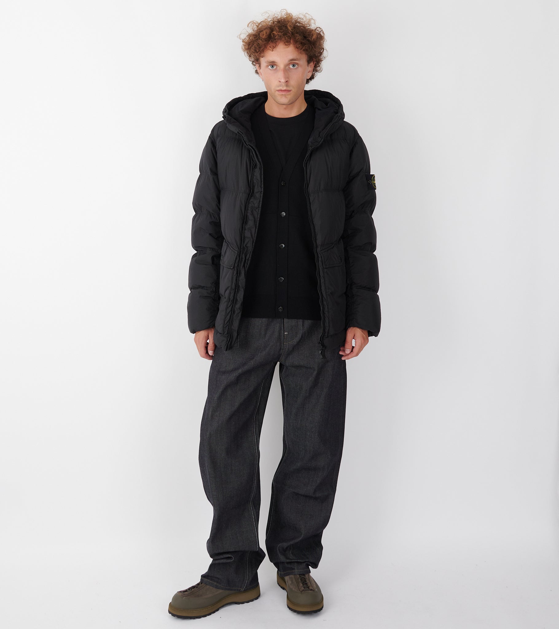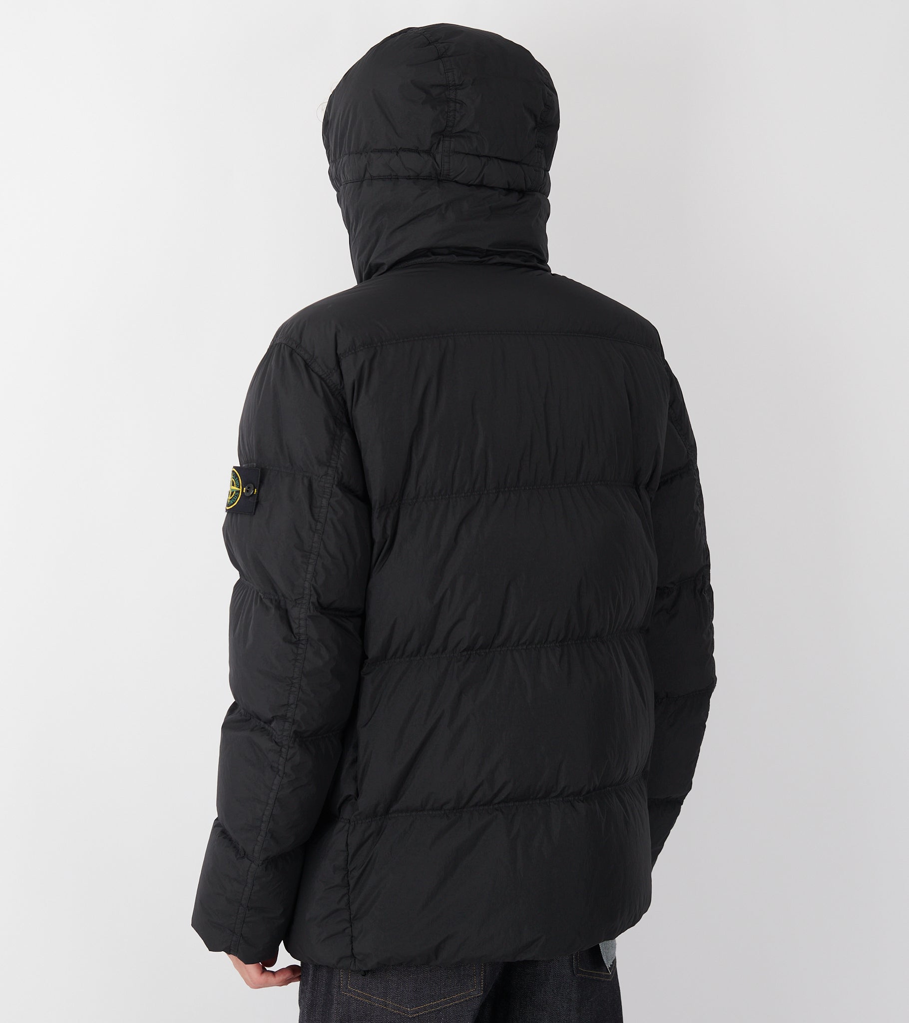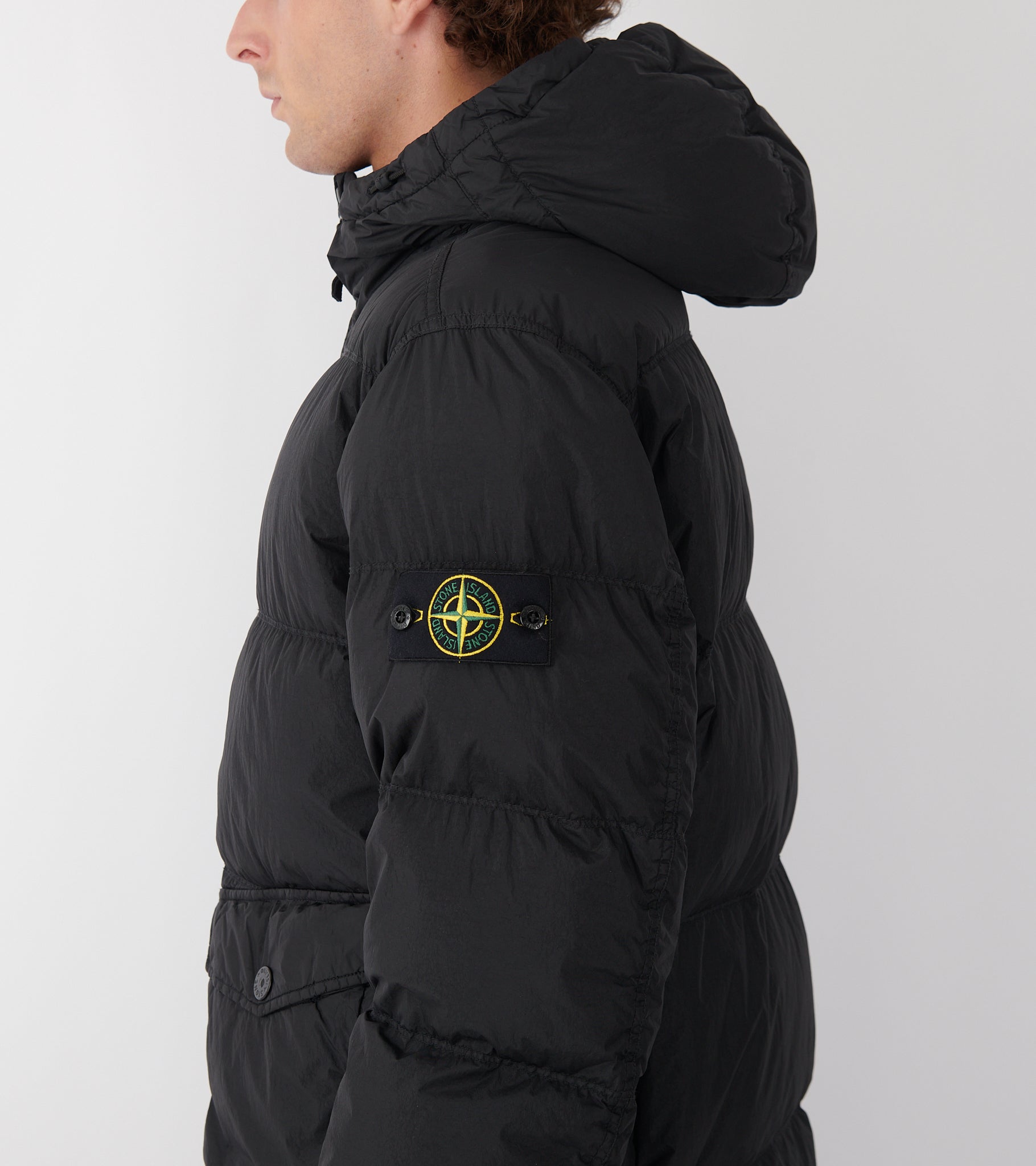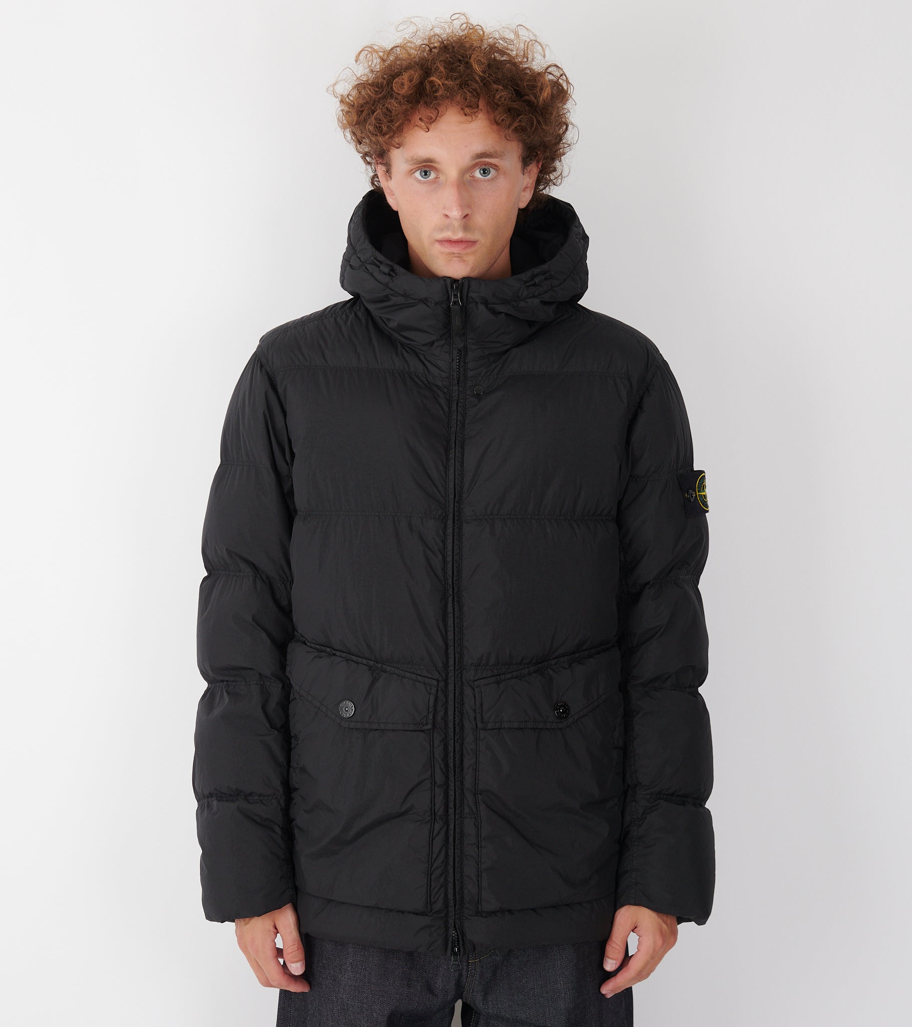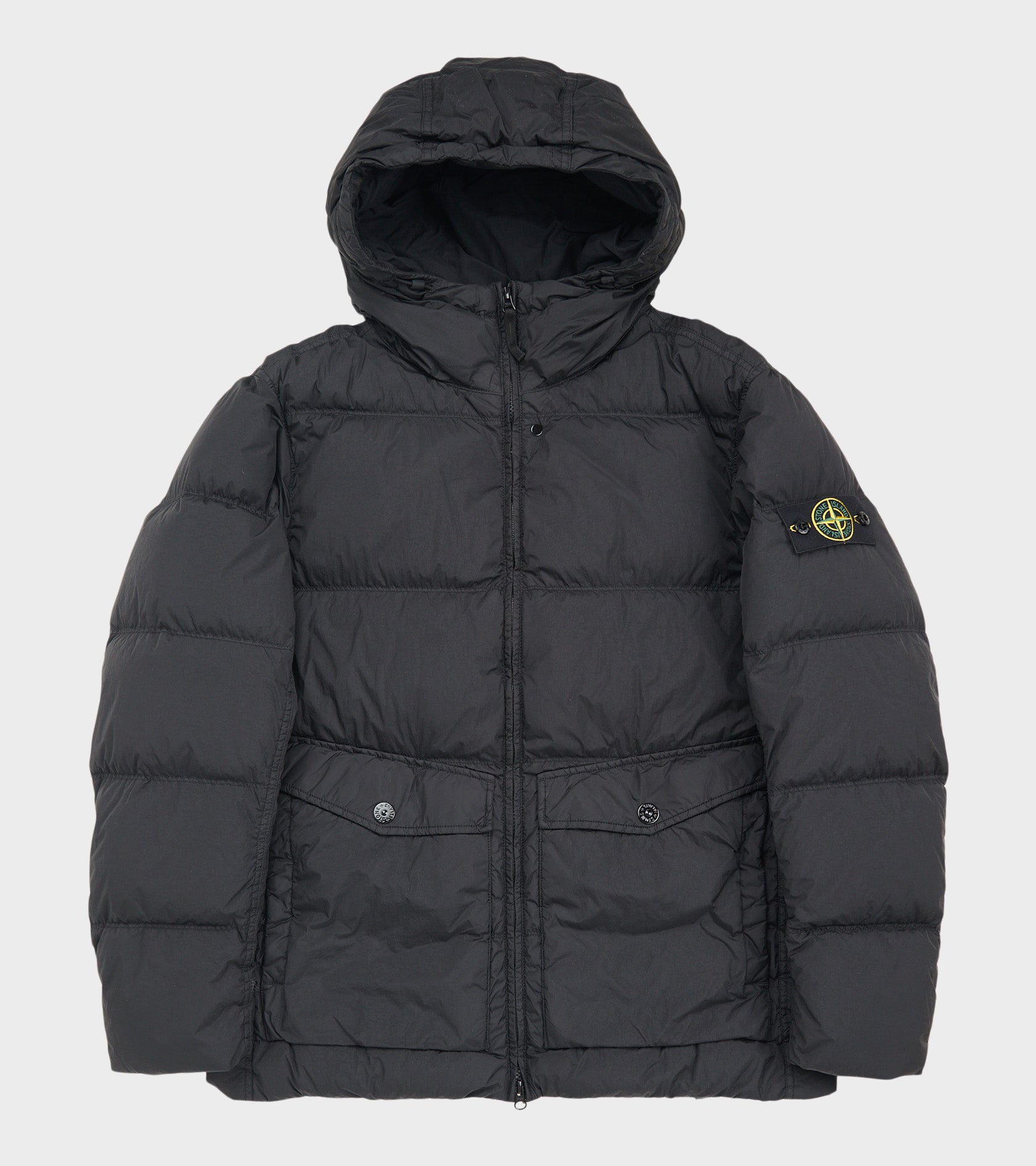 Sort dunjakke med hætte fra Stone Island. Denne jakke har det ikoniske Stone patch på venstre ærme. Jakken har to store lommer foran og lukkes med lynlås.