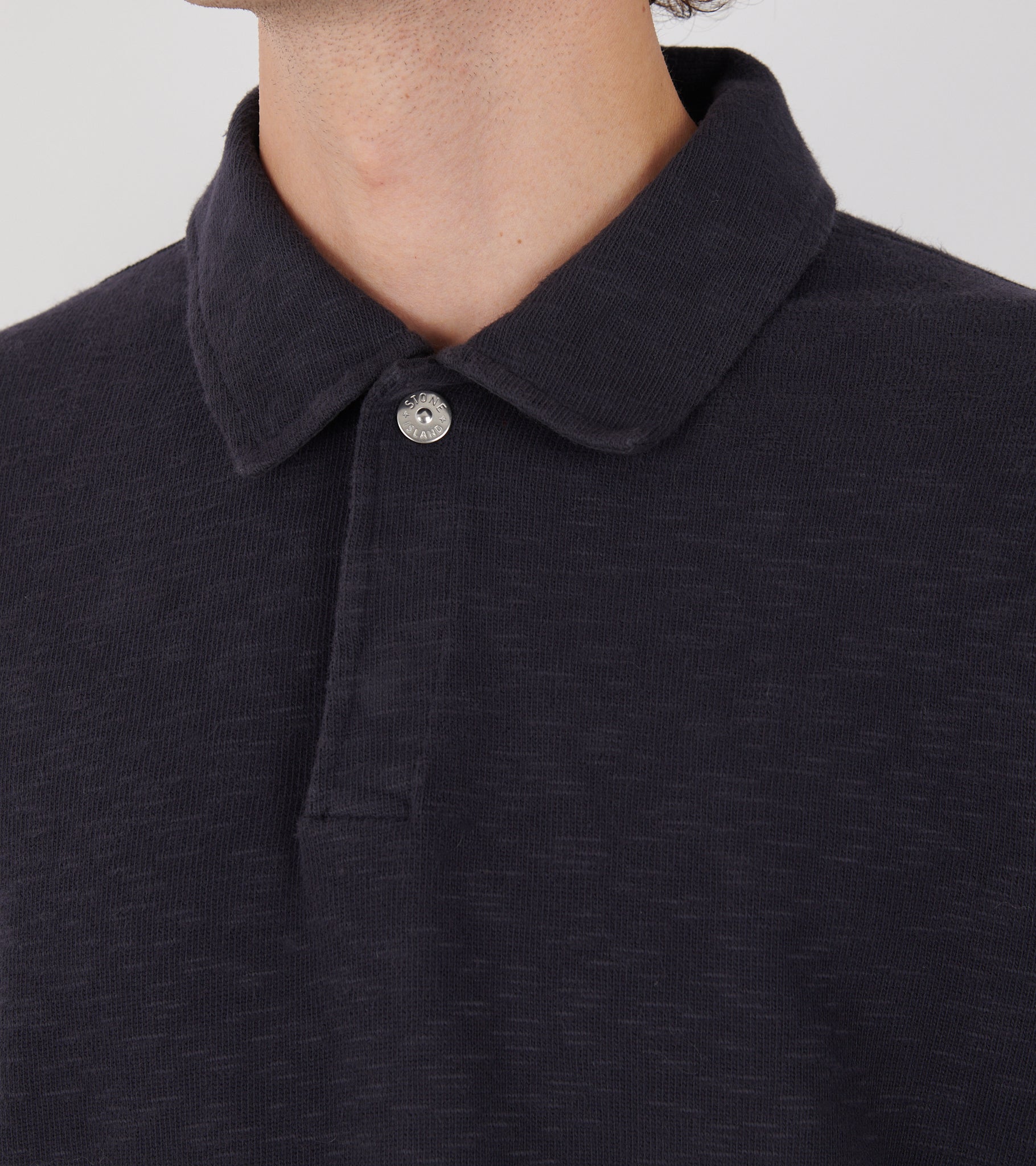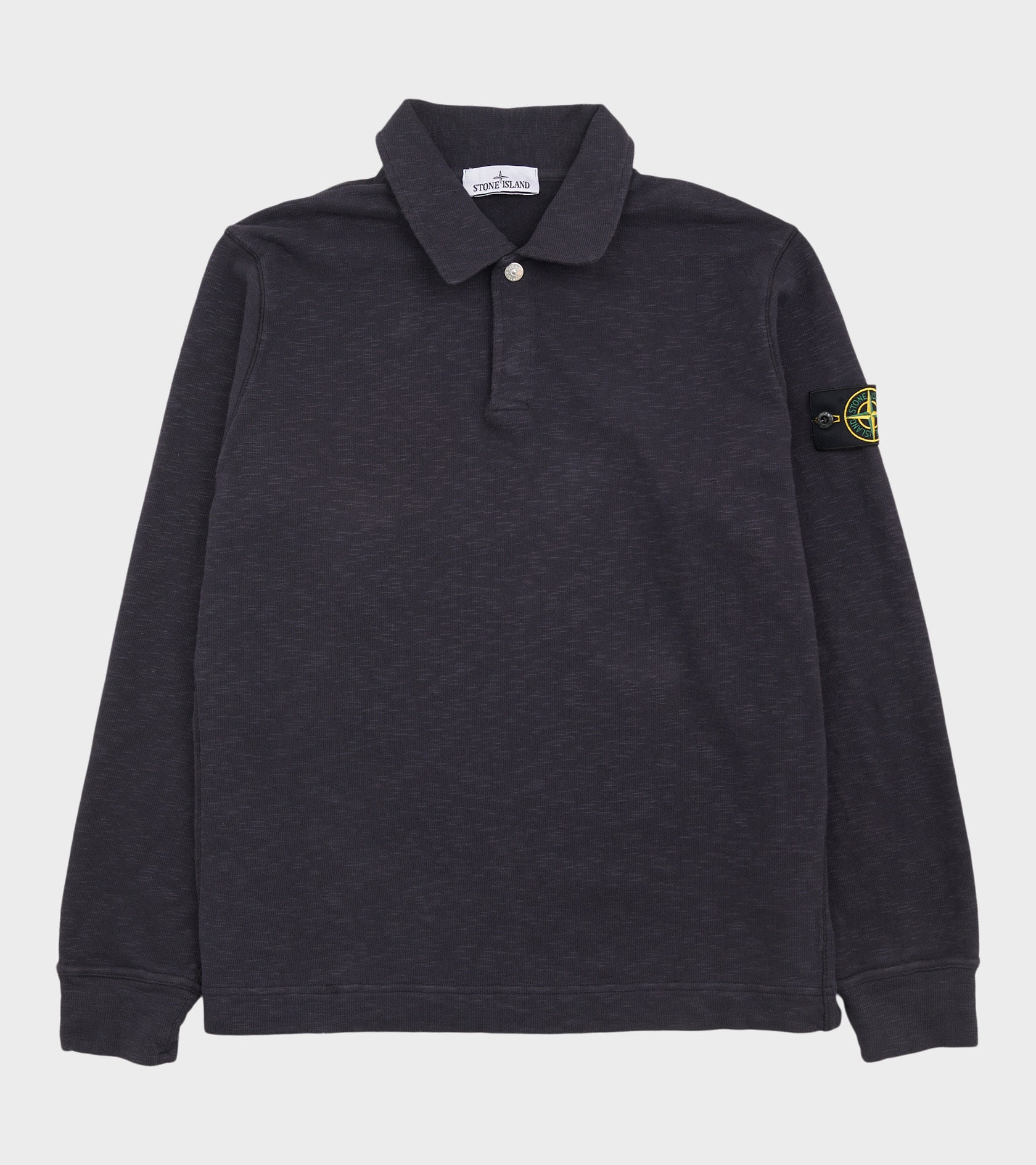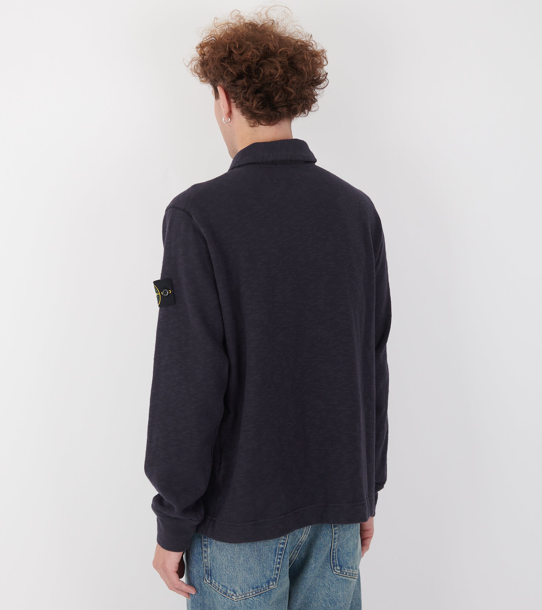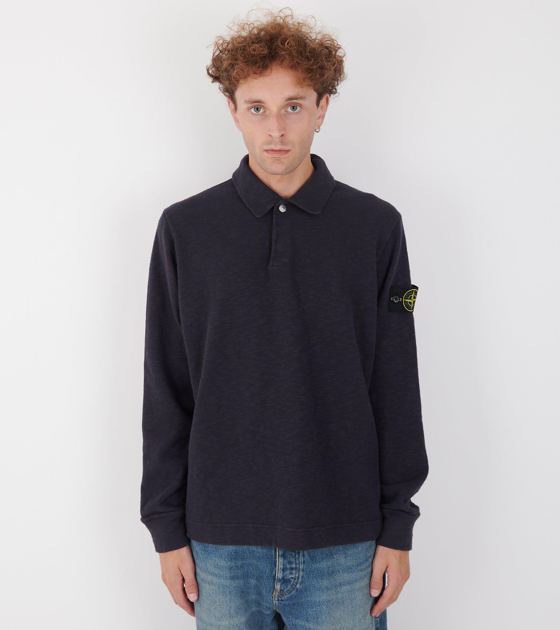 Navy polo i en kraftig bomuldssweat-kvalitet fra Stone Island. Poloen har en klassisk krave og en knaplukning med to sølv trykknapper. På venstre ærme er det ikoniske Stone Patch.
