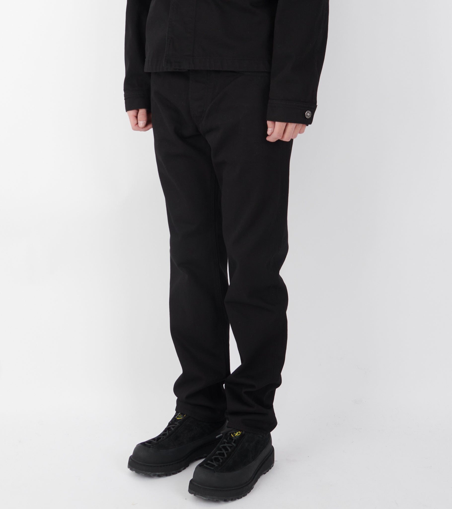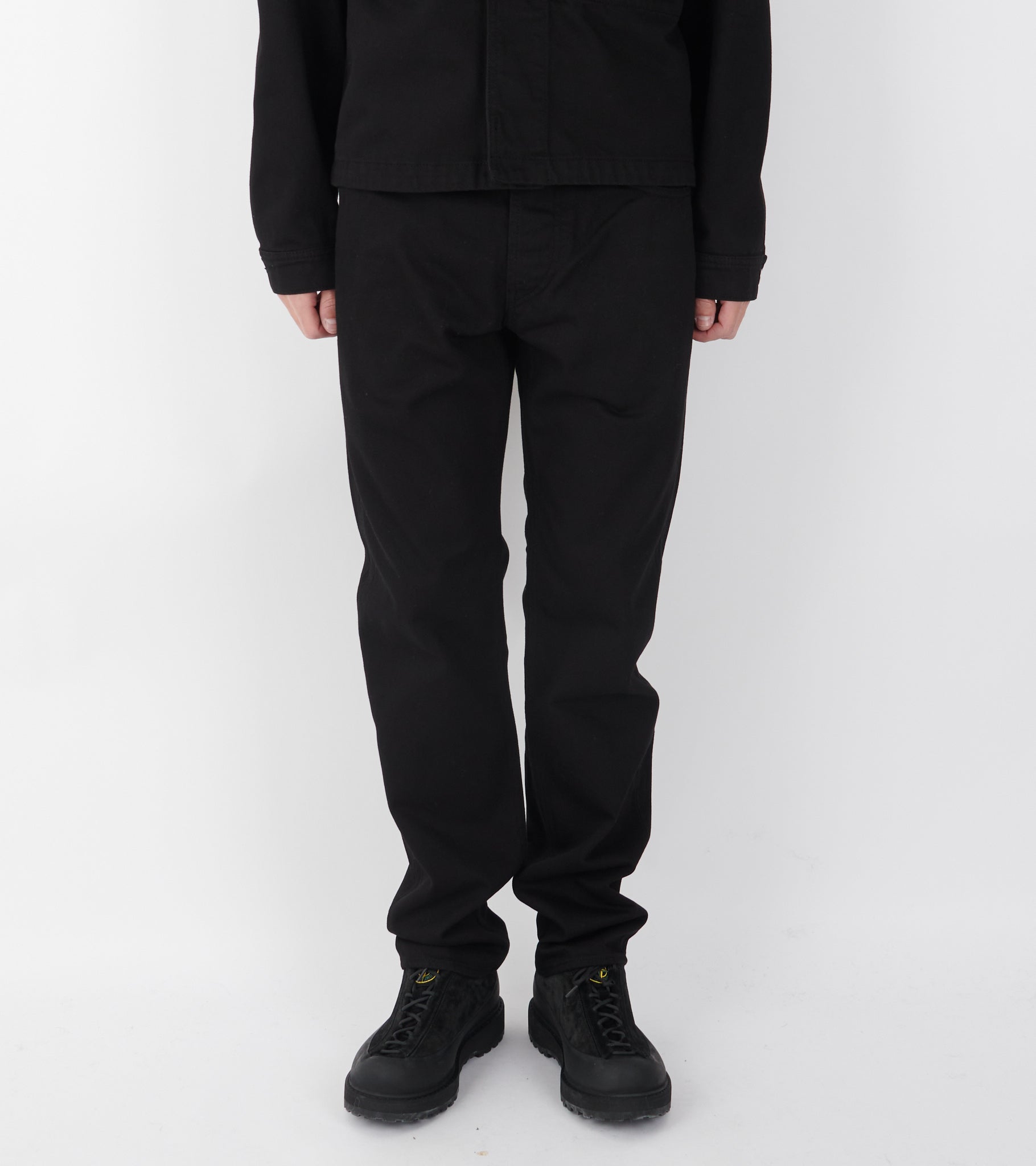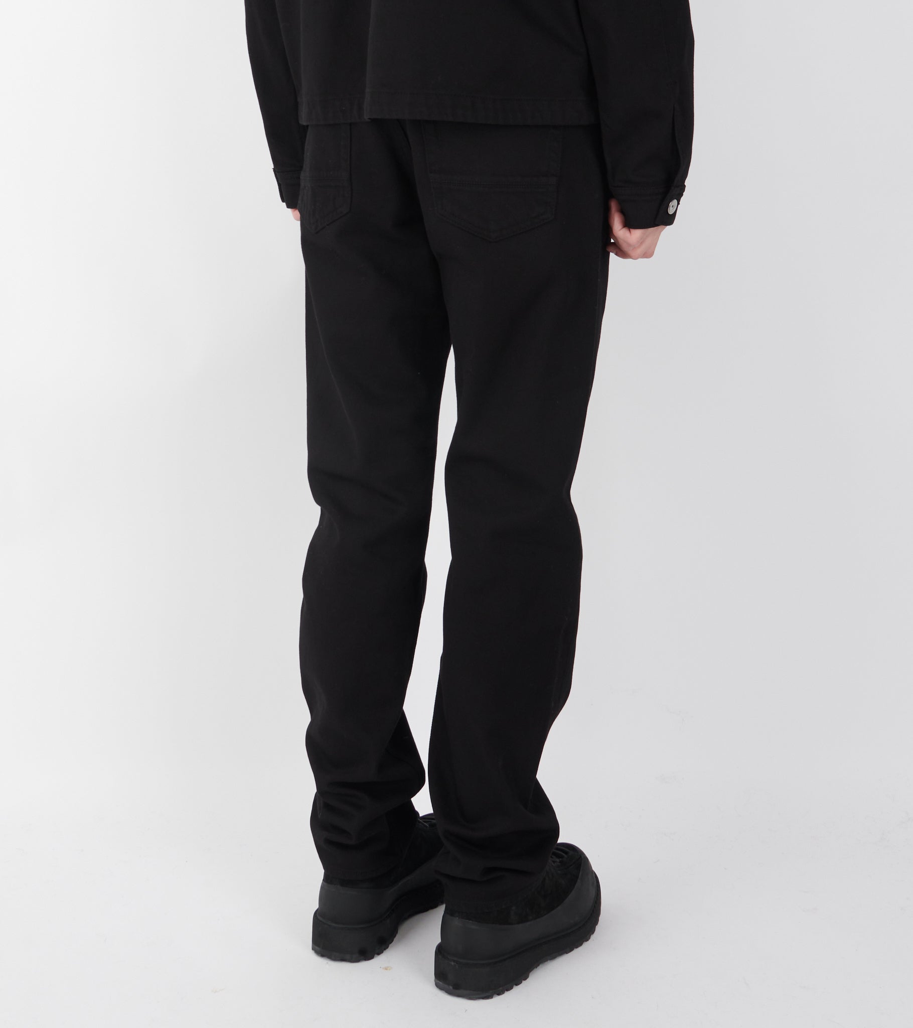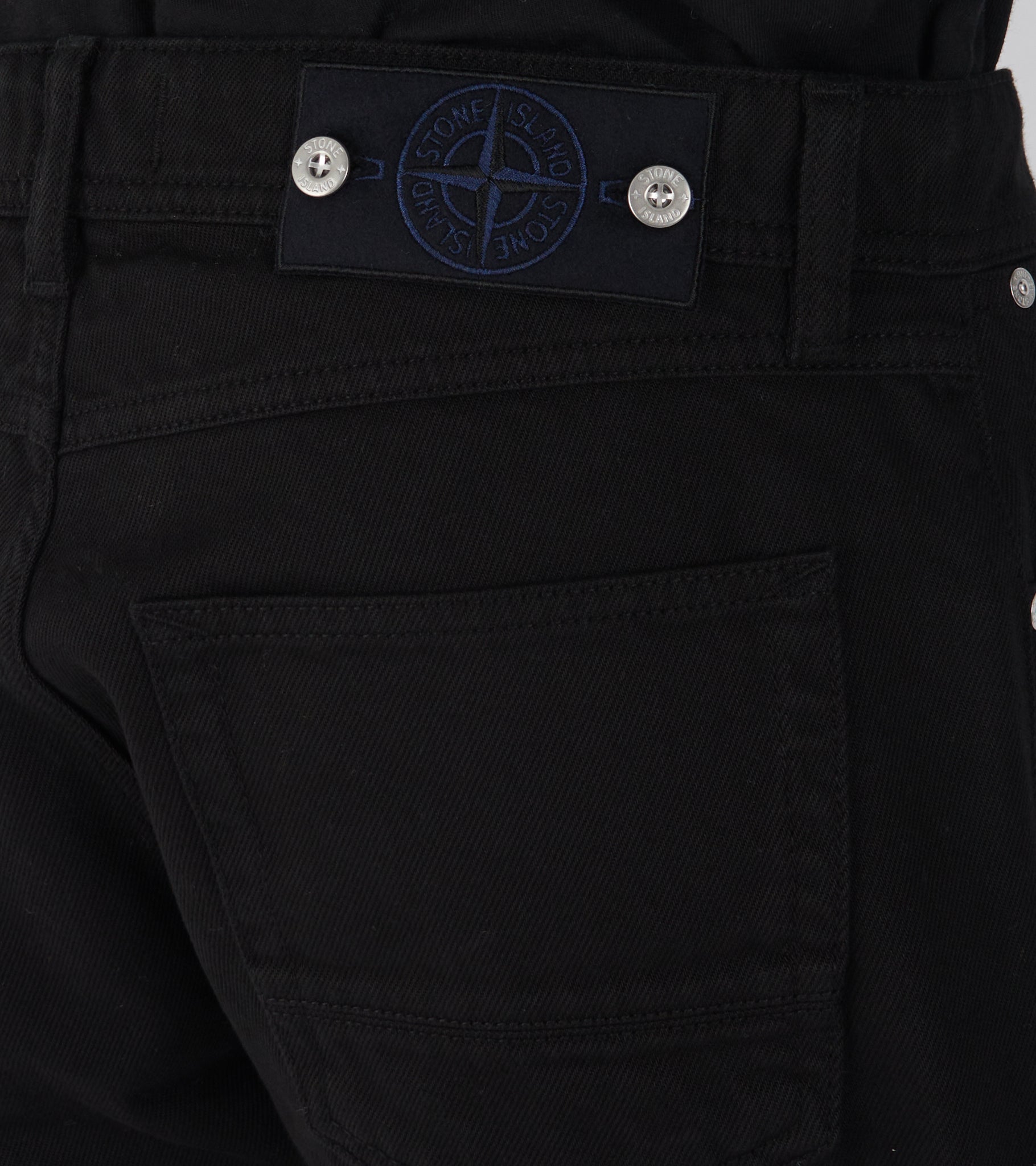 Sorte jeans fra Stone Island's 'Denim Research' Fall/Winter 2025 kollektion. Disse jeans har bæltestropper, en skrålomme i hver side samt to baglommer. Øverst bagpå er det ikoniske Stone Patch.