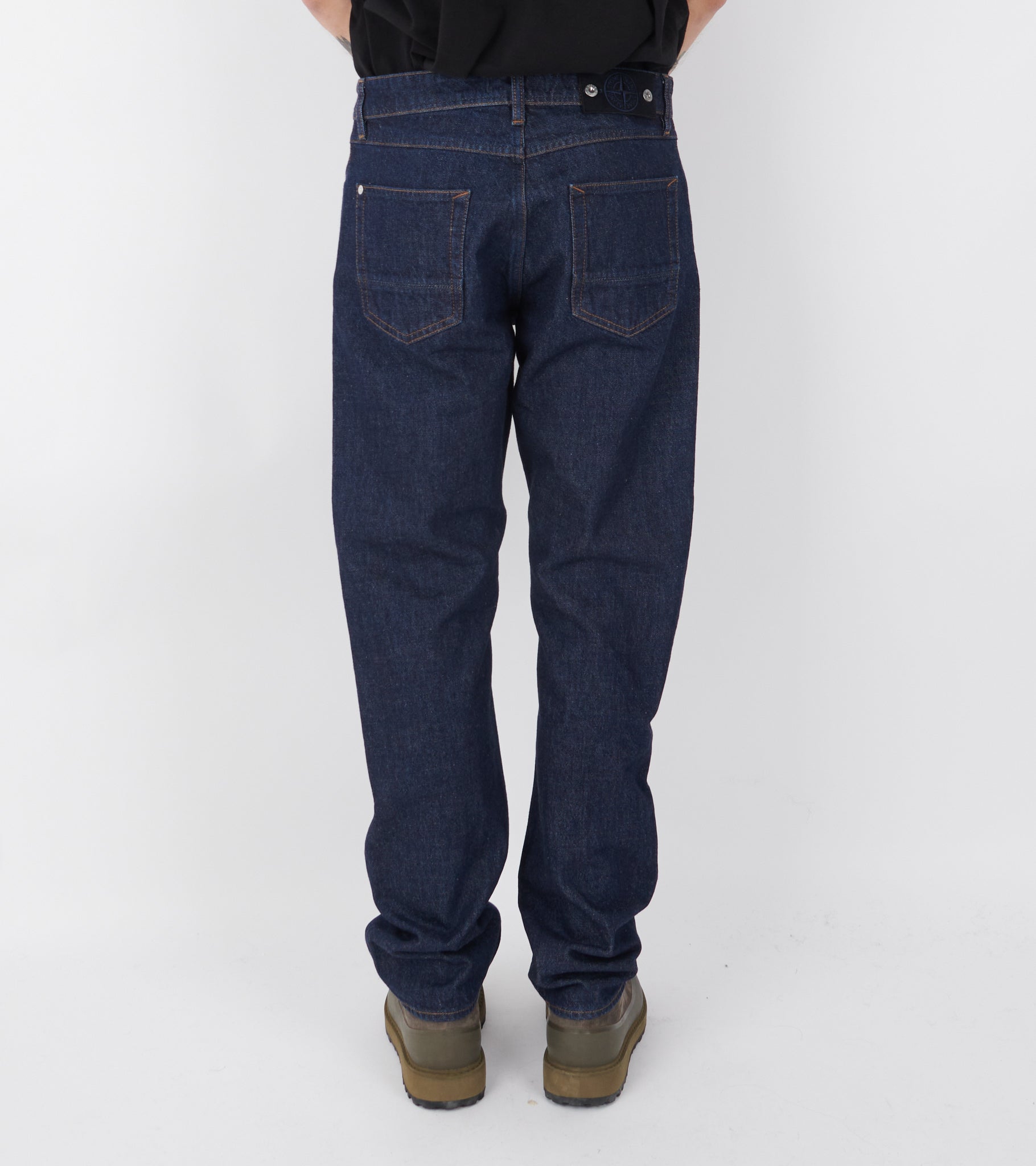 Jeans fra Stone Island's 'Denim Research' Fall/Winter 2025 kollektion. Disse jeans har bæltestropper, en skrålomme i hver side samt to baglommer. Øverst bagpå er det ikoniske Stone Patch.
