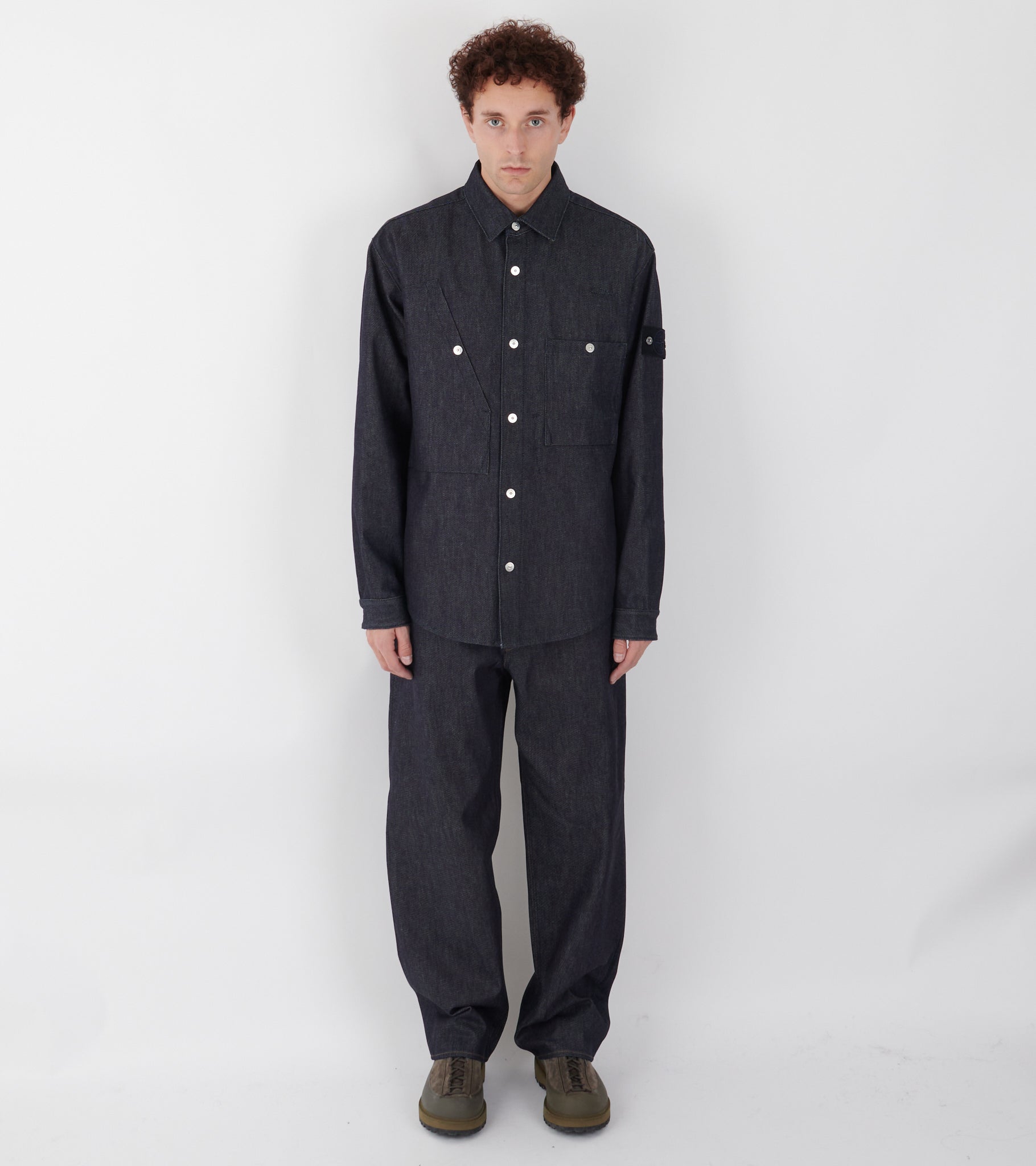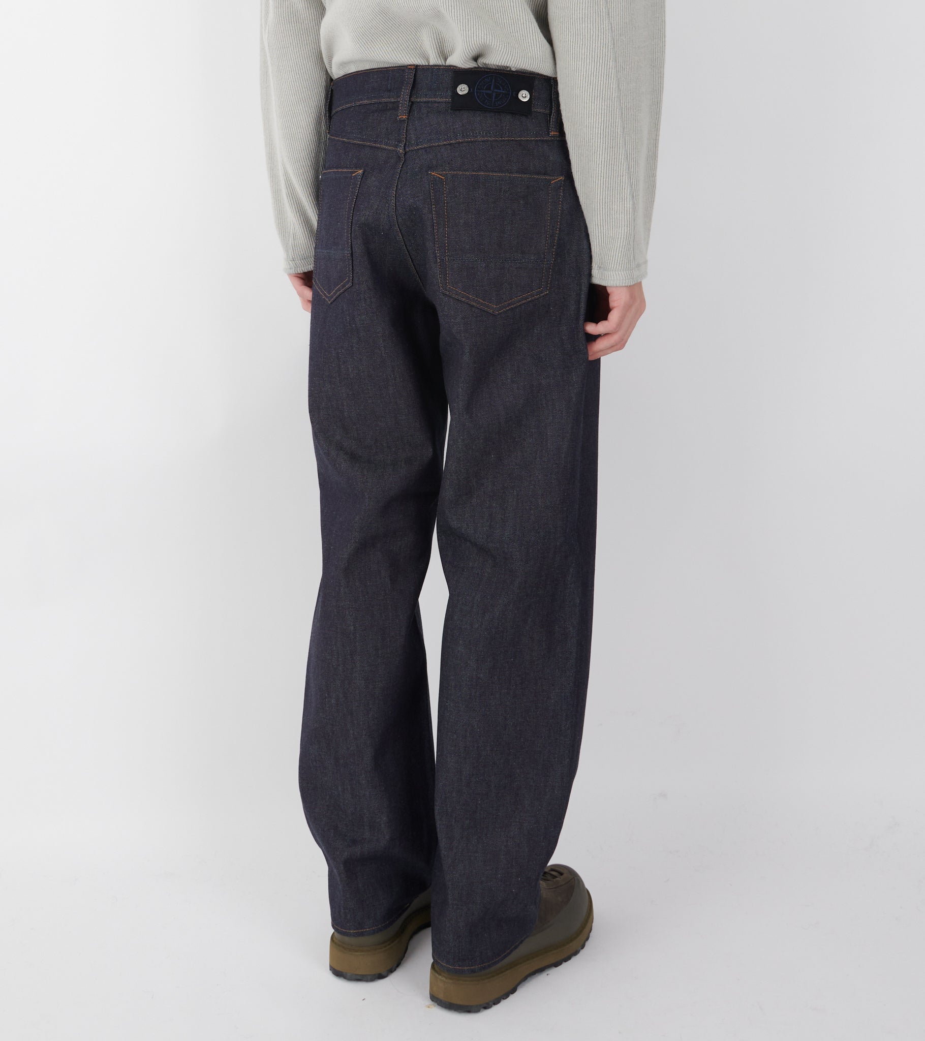 Jeans fra Stone Island's 'Denim Research' Fall/Winter 2025 kollektion. Disse jeans har bæltestropper, en skrålomme i hver side samt to baglommer. Øverst bagpå er det ikoniske Stone Patch.