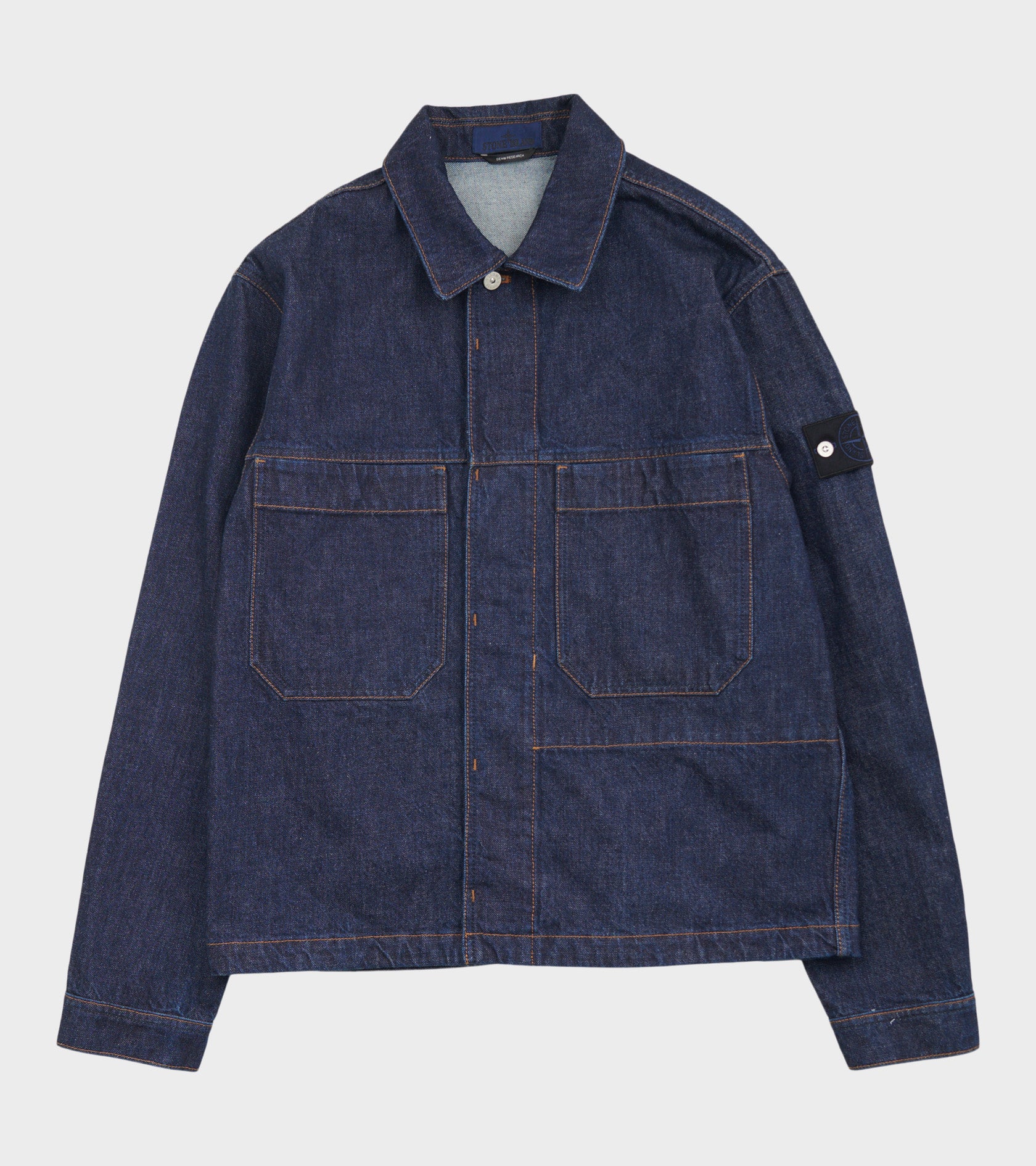 Denimjakke i økologisk bomuldsdenim fra Stone Island's 'Denim Research' Fall/Winter 2025 kollektion. Jakken har en klassisk krave, en skjult knaplukning, synlige syninger samt to store brystlommer på fronten. På venstre ærme er det ikoniske Stone Patch.