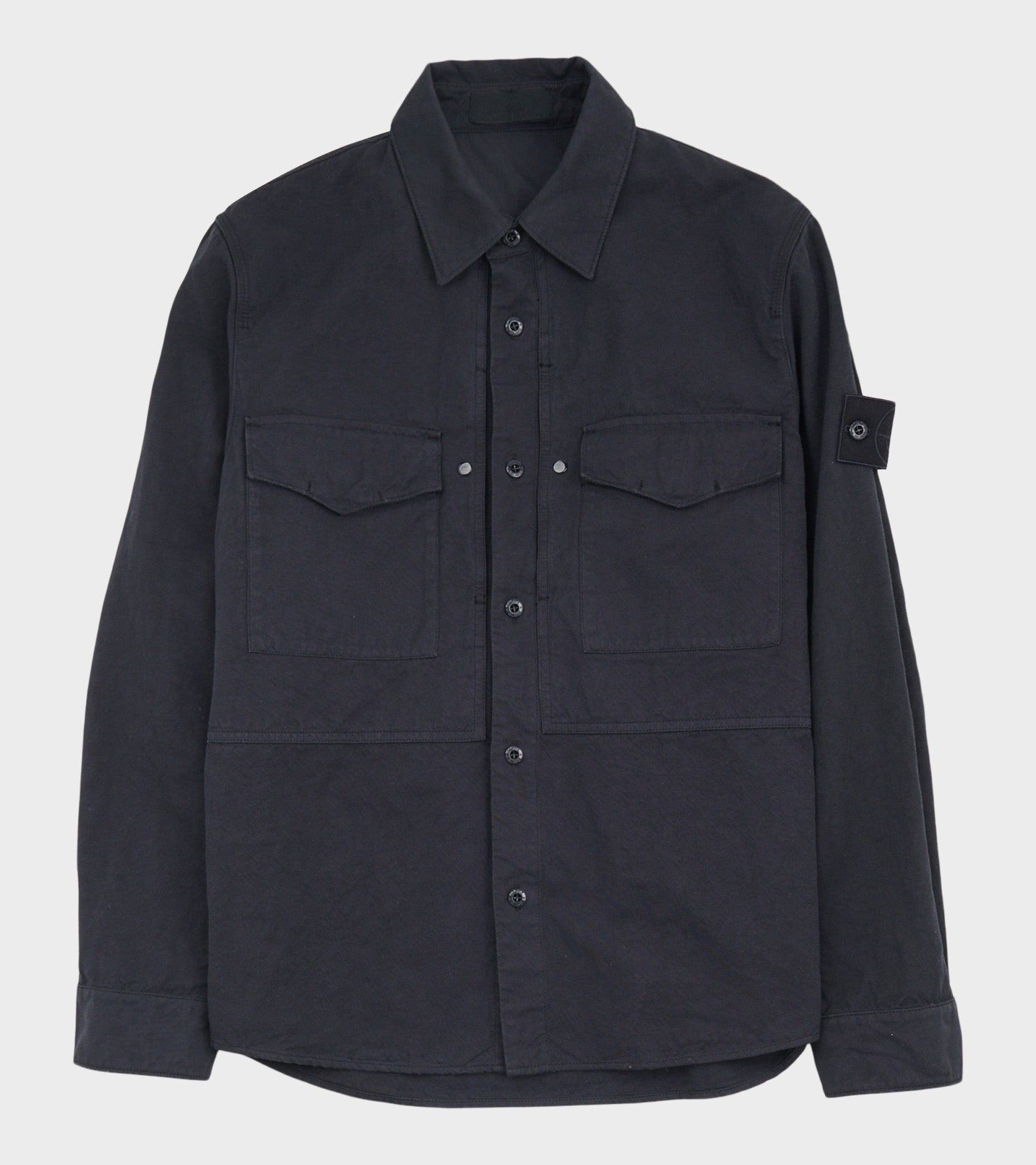 Navy overshirt i en blanding af bomuld og hør fra Stone Island. Denne overshirt har en klassisk krave, en knaplukning og to dobbelt lommer på fronten. På venstre ærme er det ikoniske Stone Patch i den særlige tone-i-tone Ghost-version.