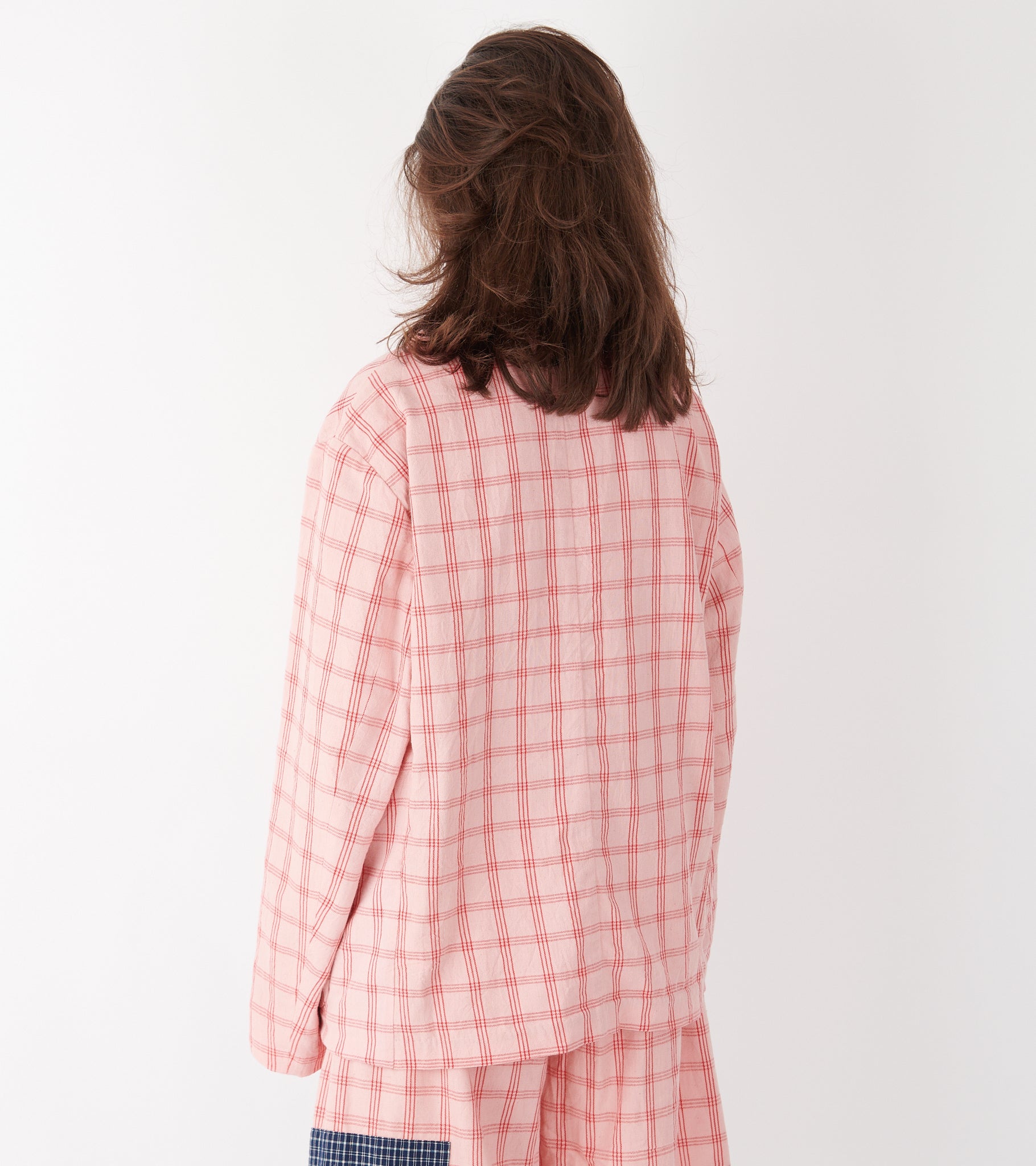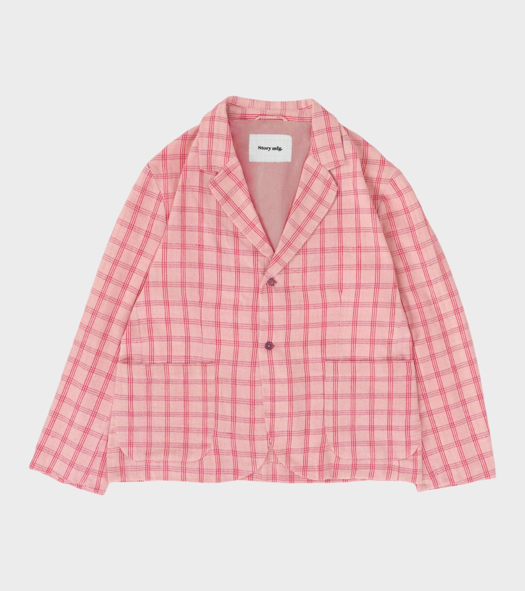 Lyserød ternet blazer fra Story mfg. Shale Jacket Pink Check Handloom er fremstillet i økologisk håndvævet bomuld og har en klassisk revers-krave, en knaplukning og to lommer på fronten. Knapperne er lyserøde og den øverste er formet som en blomst. Blazeren er uden polstring ved skuldrene.