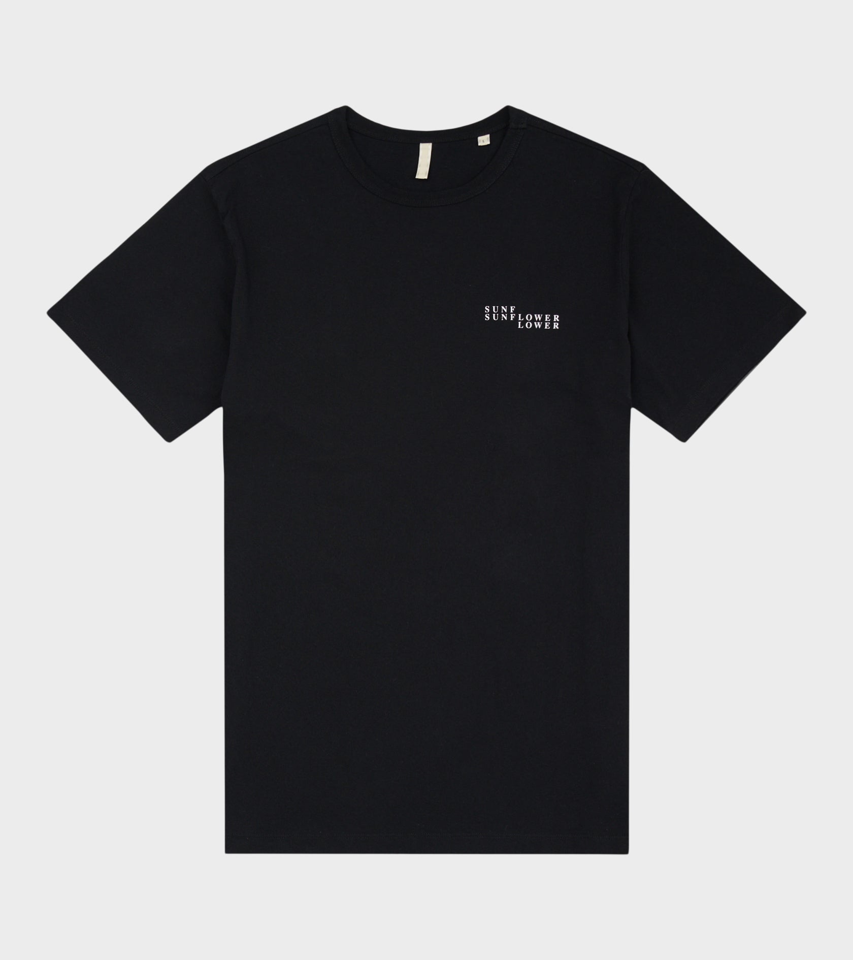 Sort t-shirt i økologisk bomuld fra Sunflower. T-shirten har hvidt logoprint ved venstre bryst.