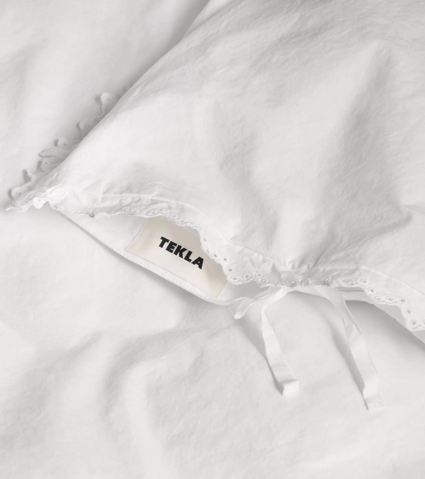 Dynebetræk med 'Broderie Anglaise' i farven 'Broken White' fra Tekla. Betrækket er lavet af lange bomuldfibre med et højt antal tråde. Det høje antal tråde gør betrækket modstandsdygtigt og holdbart. Betrækket er blevet behandlet med en stenvask som giver en blød fornemmelse og et mat finish.