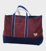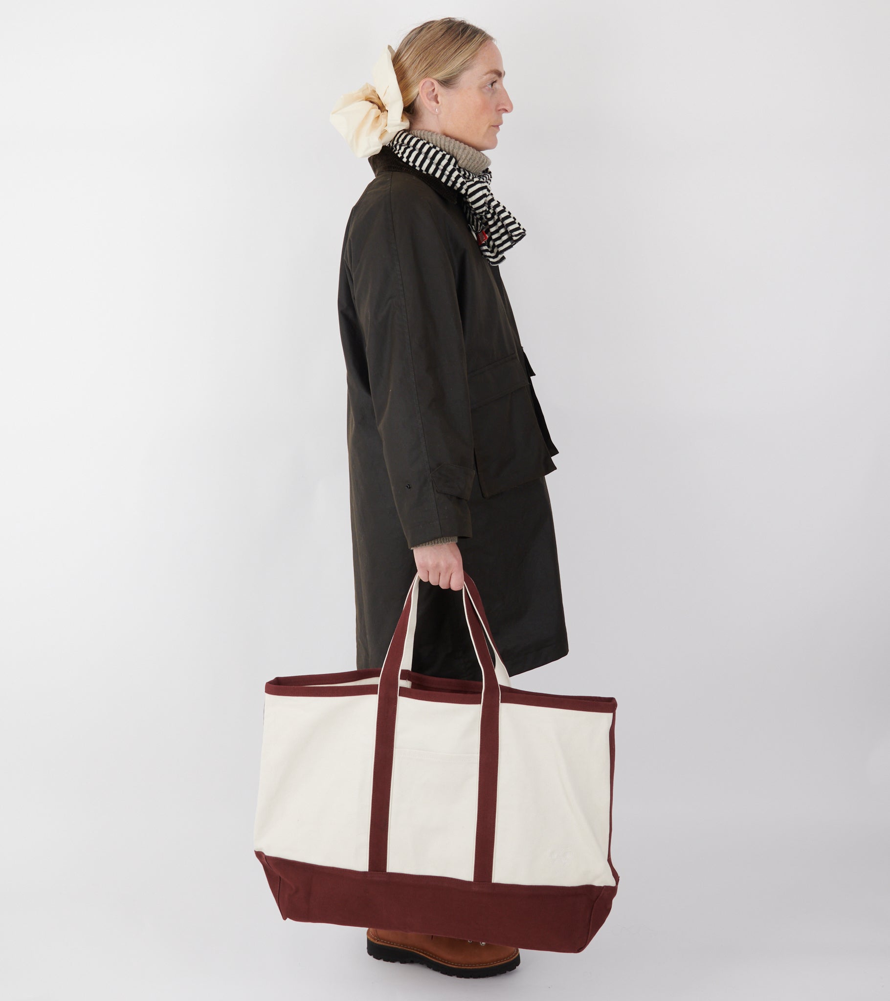 Stor tote bag fra Valiese. Denne taske er i en råhvid og burgundy farvekombination. Den er fremstillet i kraftig økologisk bomuldskanvas og har en dobbelt skulderstrop, en lomme på fronten, en indvendig lomme samt indvendige stropdetaljer. På fronten er et lille broderet logo.