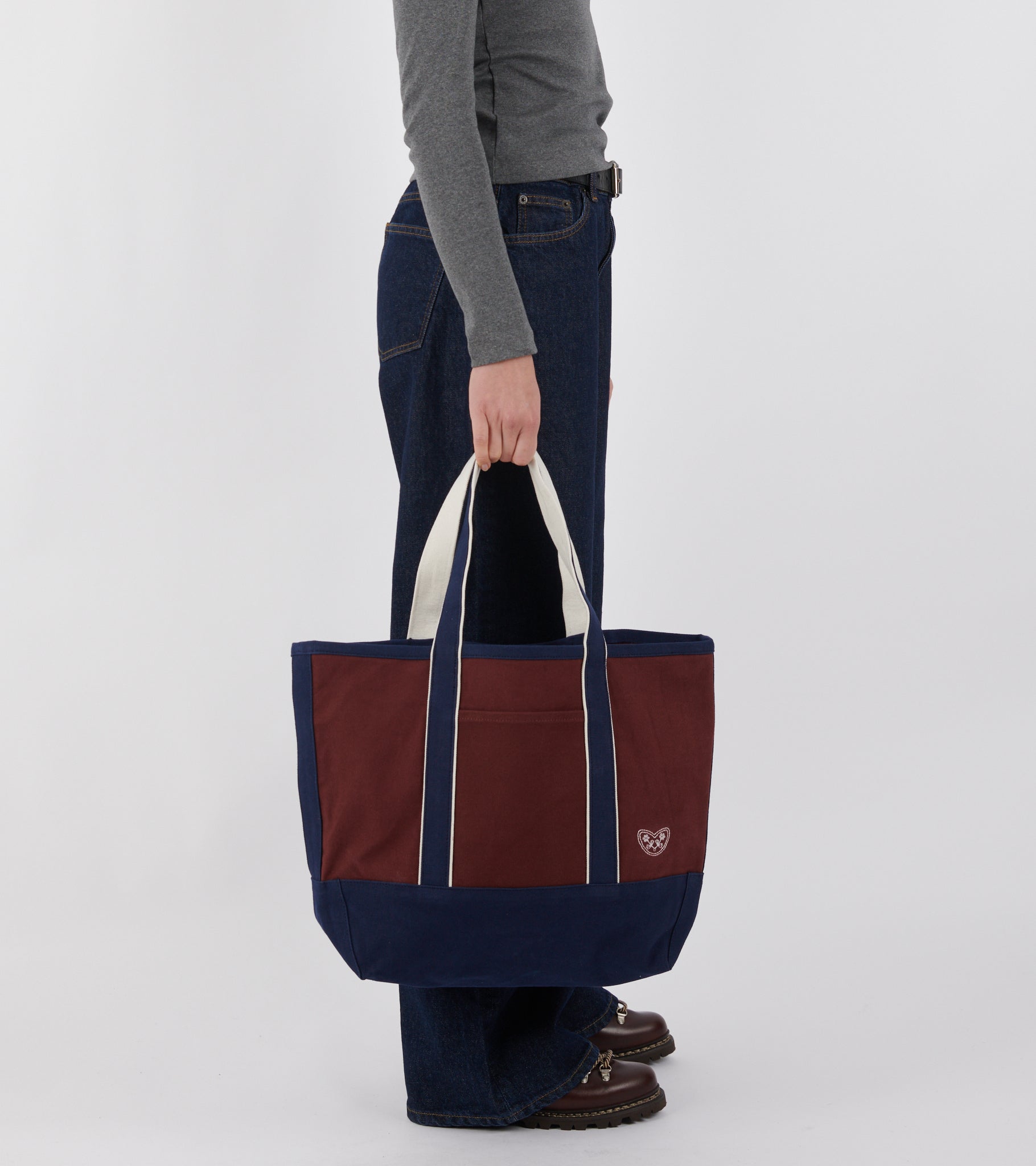 Tote bag fra Valiese. Denne taske er i en navy og burgundy farvekombination. Den er fremstillet i kraftig økologisk bomuldskanvas og har en dobbelt skulderstrop, en lomme på fronten, en indvendig lomme samt indvendige stropdetaljer. På fronten er et lille broderet logo.